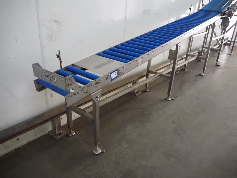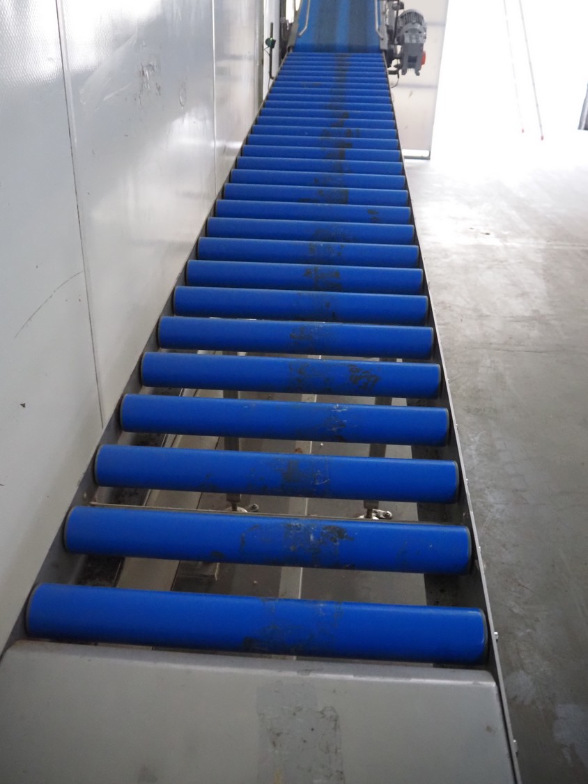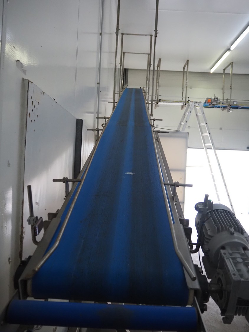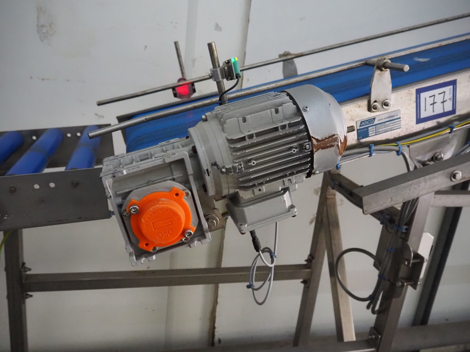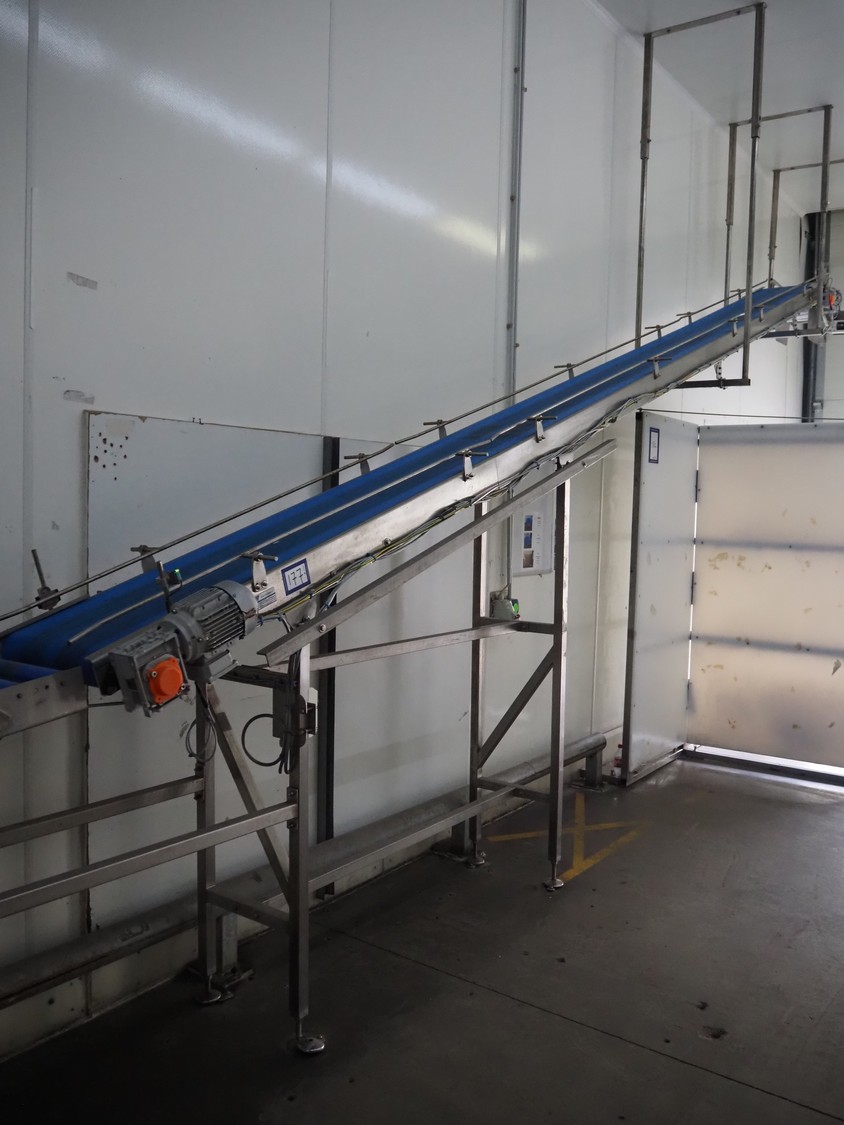 ARCO Solutions BV de-elevating belt with roller conveyor, s/s frames, type de-elevating belt: BELT CONVEYOR, serial number: SW-0219717 / EA0014751, year of construction: 2023, plastic belt, belt width: 400 mm, total dimensions de-elevating belt: 6000 mm x 750 mm x 3300 mm, plastic rollers, roller width: 410 mm, total dimensions roller conveyor: 3600 mm x 500 mm x 1250 mm.