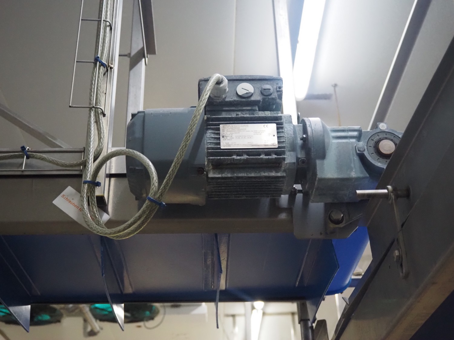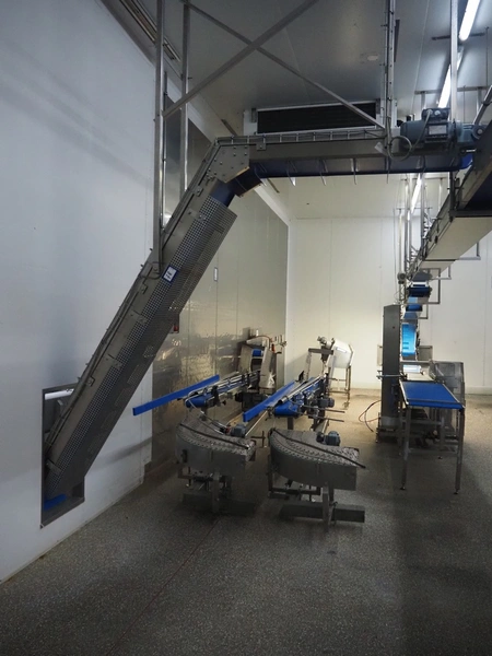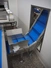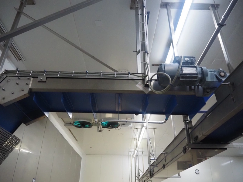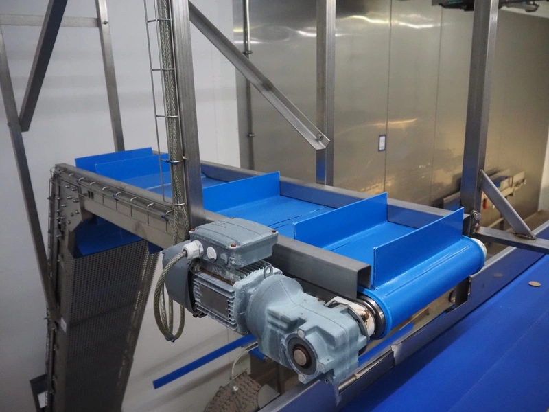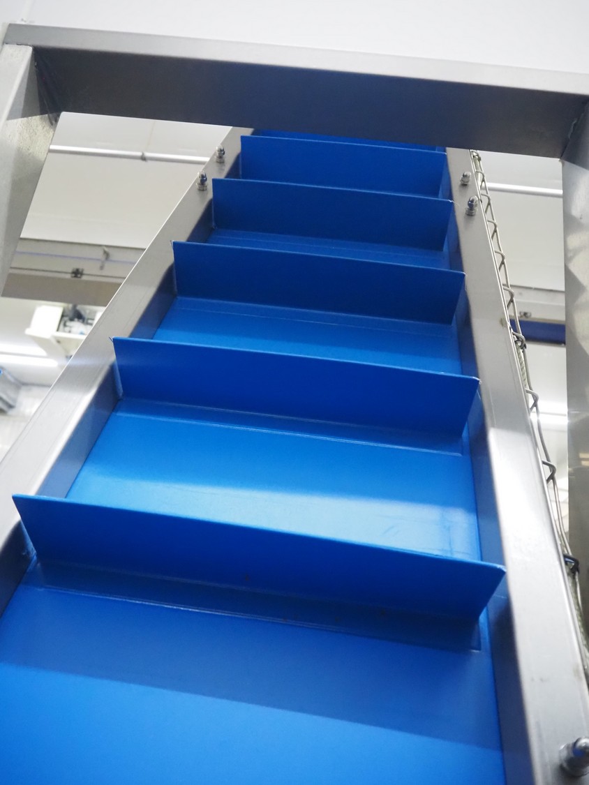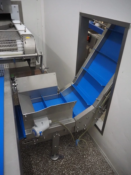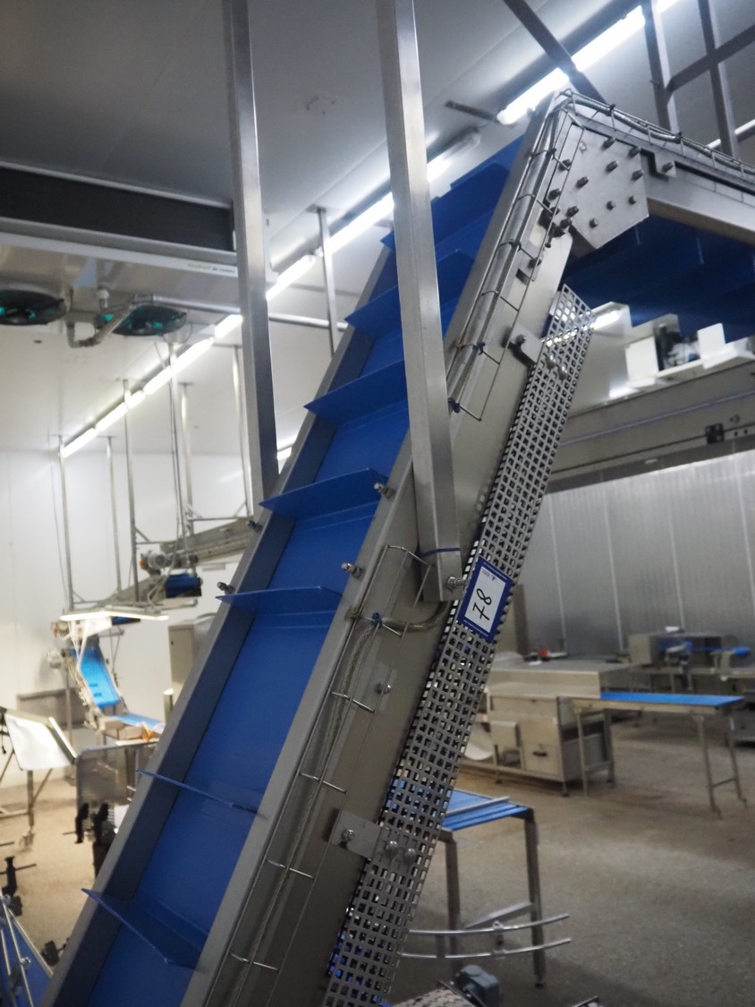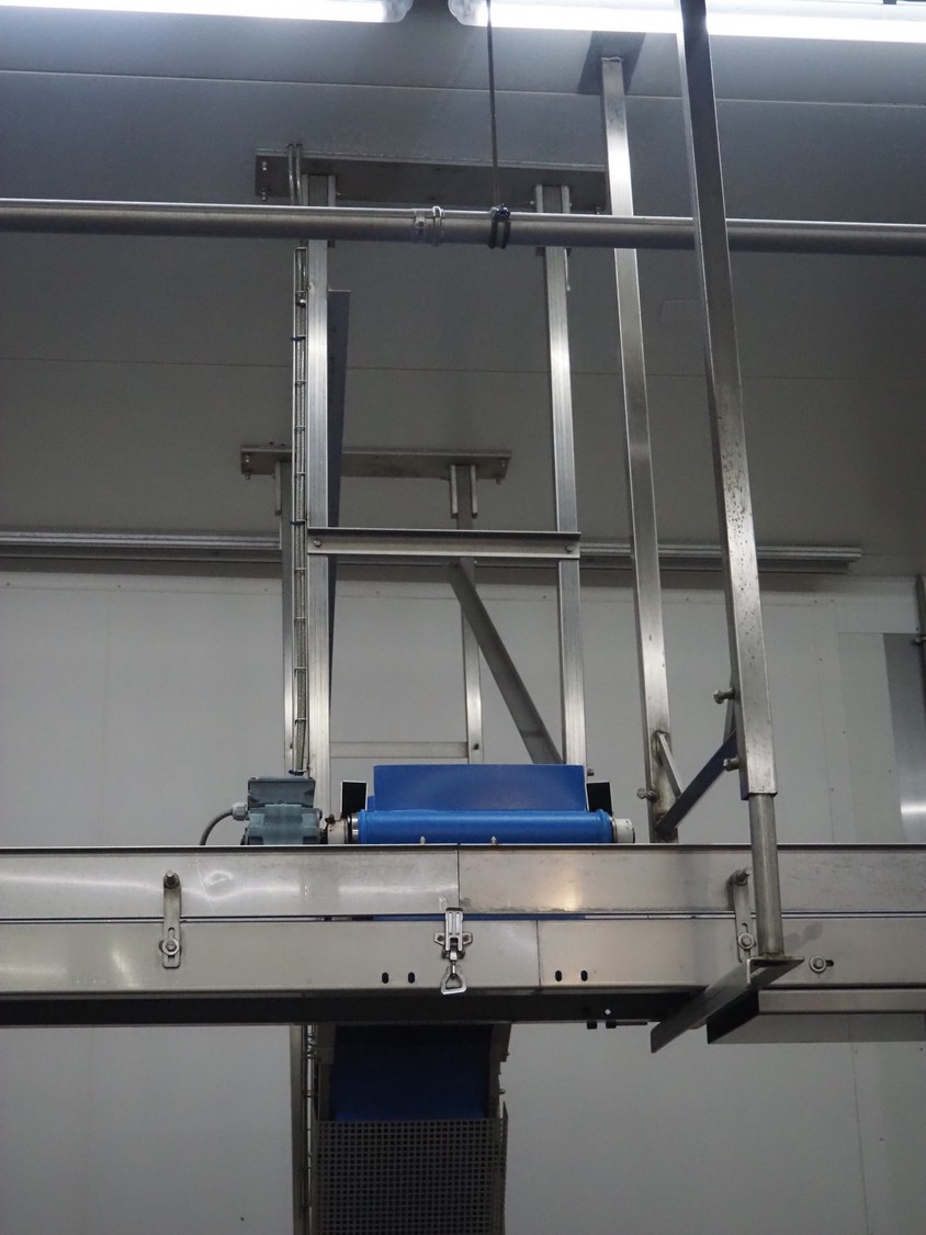 SW Fӧrdersysteme roof mounted elevating belt, s/s frame, plastic belt with dividers, distance between dividers: 200 mm, divider height: 80 mm, belt width: 350 mm, elevating height: 2700 mm, total dimensions: 3700 mm x 600 mm x 3000 mm.