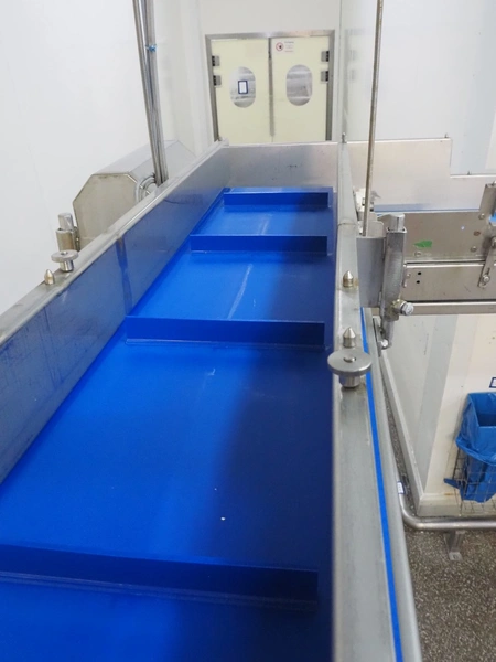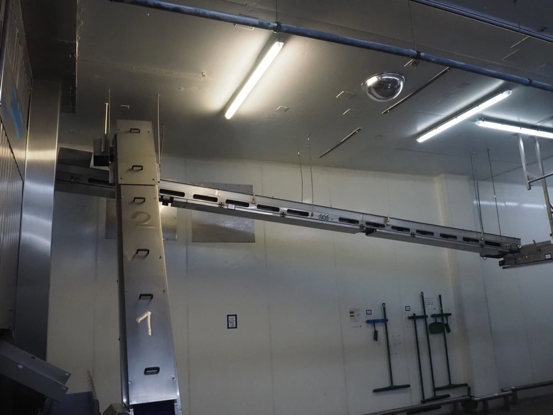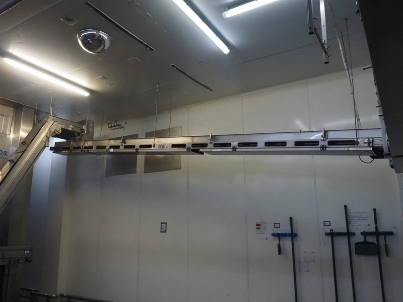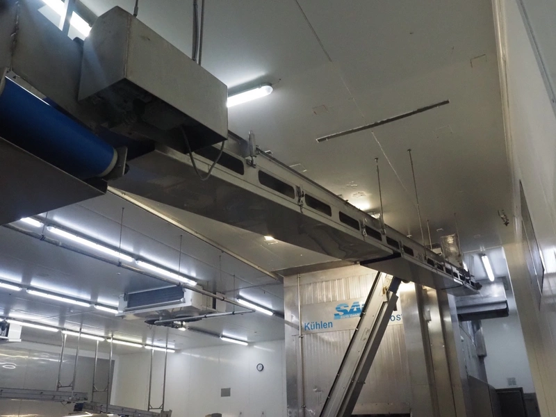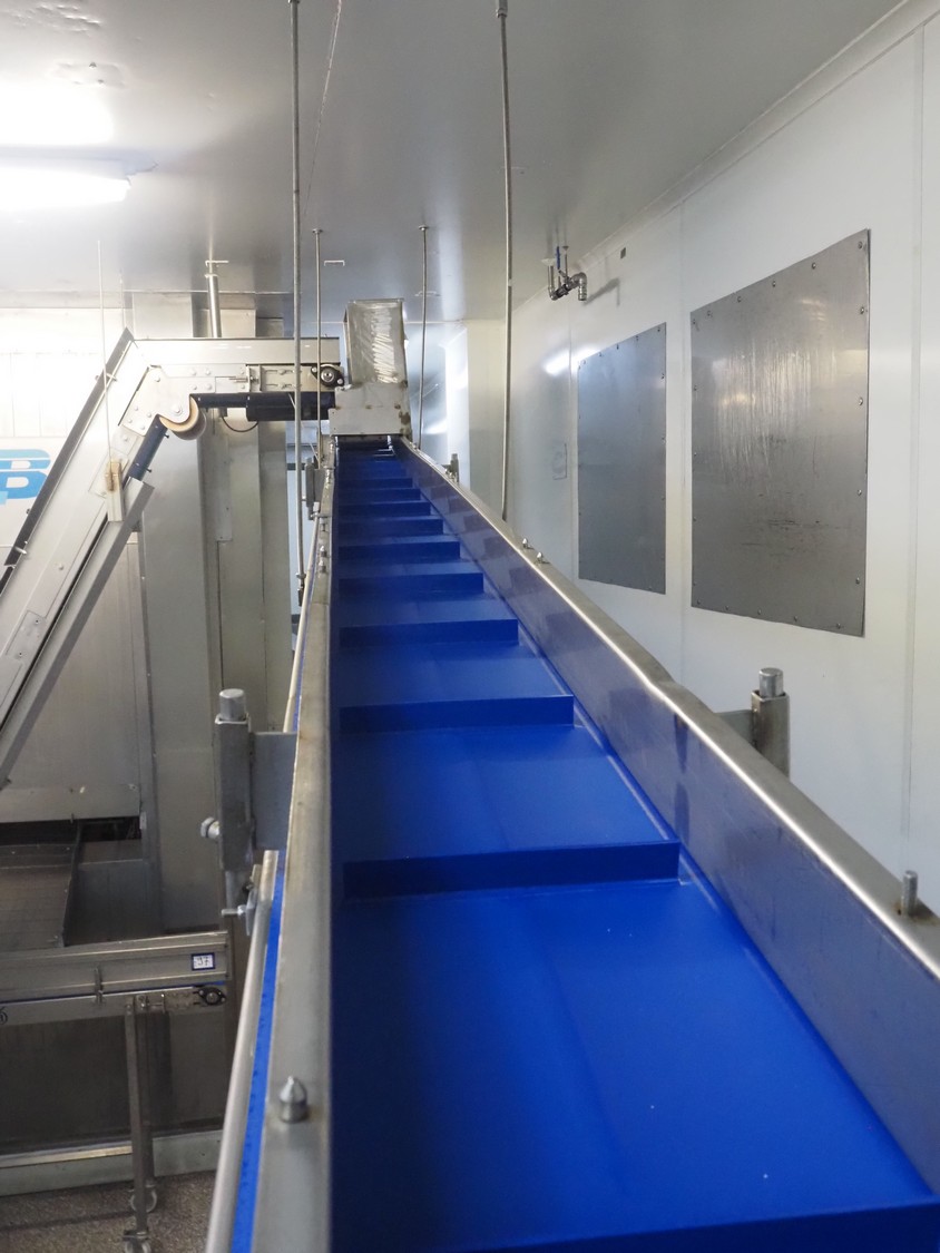 ACB Solutions roof mounted de-elevating belt with dividers, s/s frame, plastic belt, belt width: 280 mm, divider height: 30 mm, distance between dividers: 300 mm, total belt length: 6800 mm.