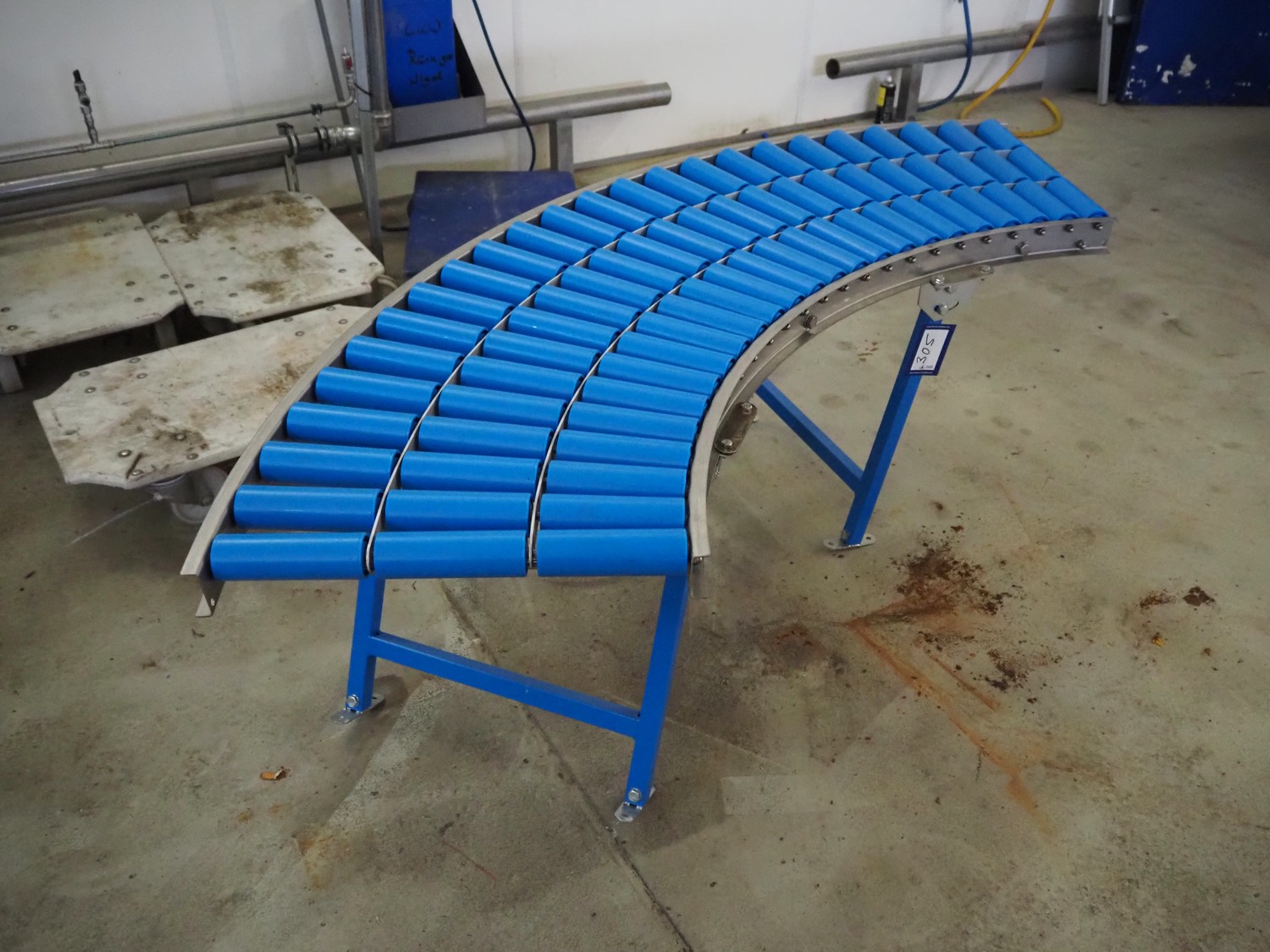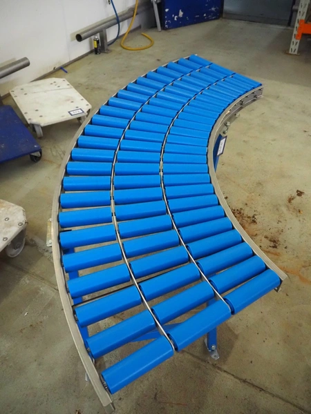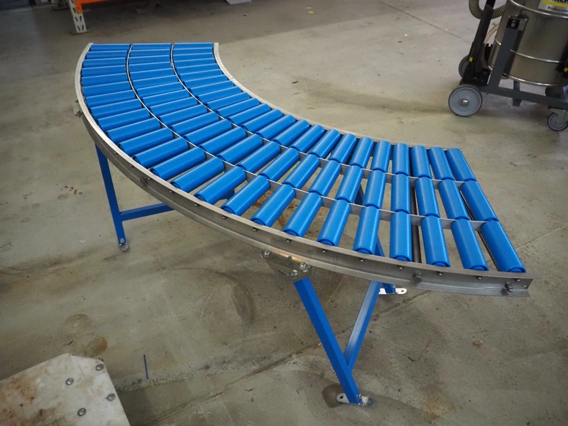 45° curved roller conveyor, s/s frame, plastic rollers, roller width: 155 mm, total dimensions: 1800 mm x 750 mm x 600 mm.