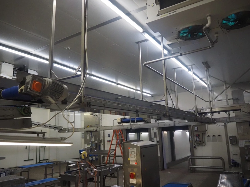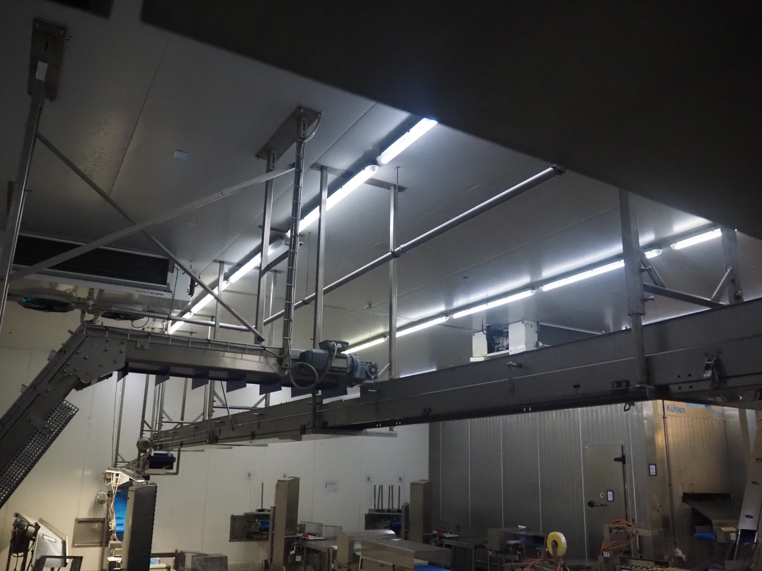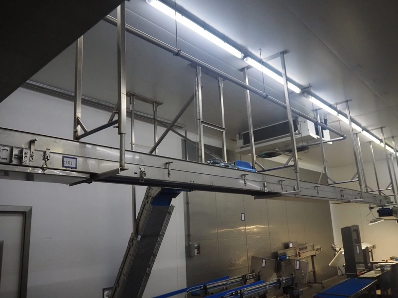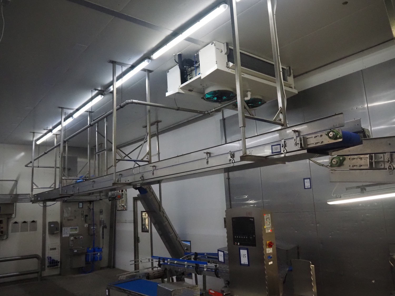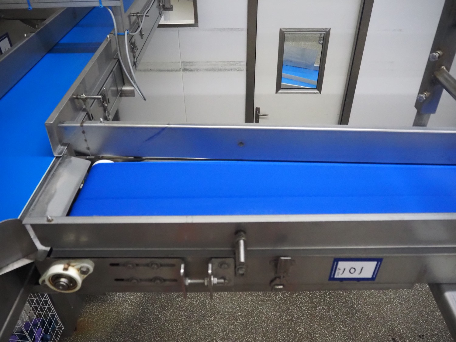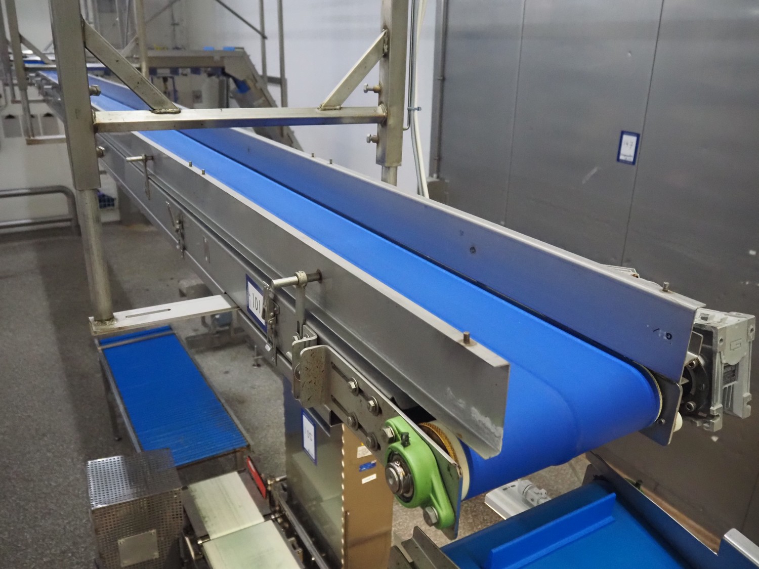 Roof mounted transport belt, s/s frame, plastic belt, belt width: 300 mm, total belt length: approximately 8250 mm.