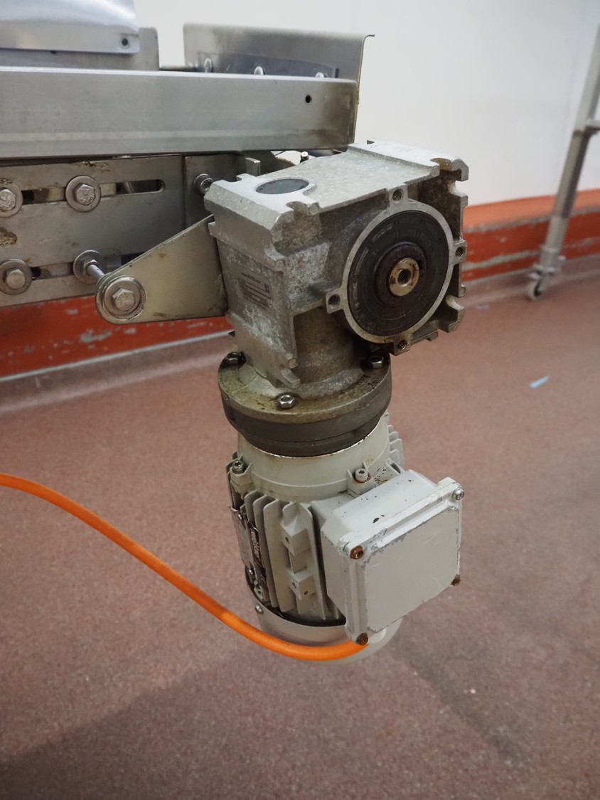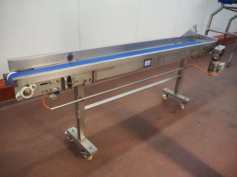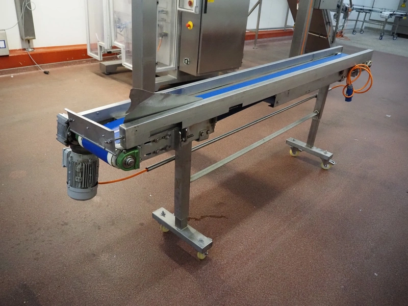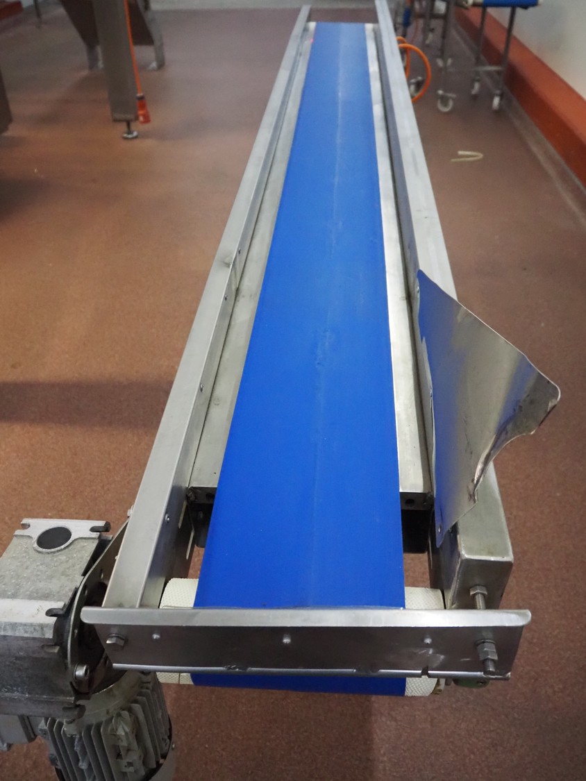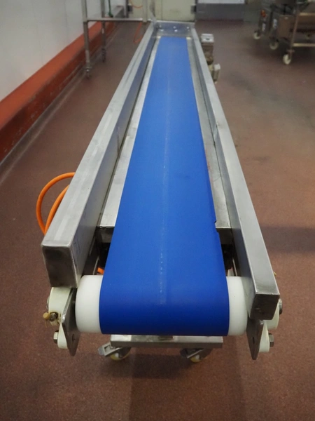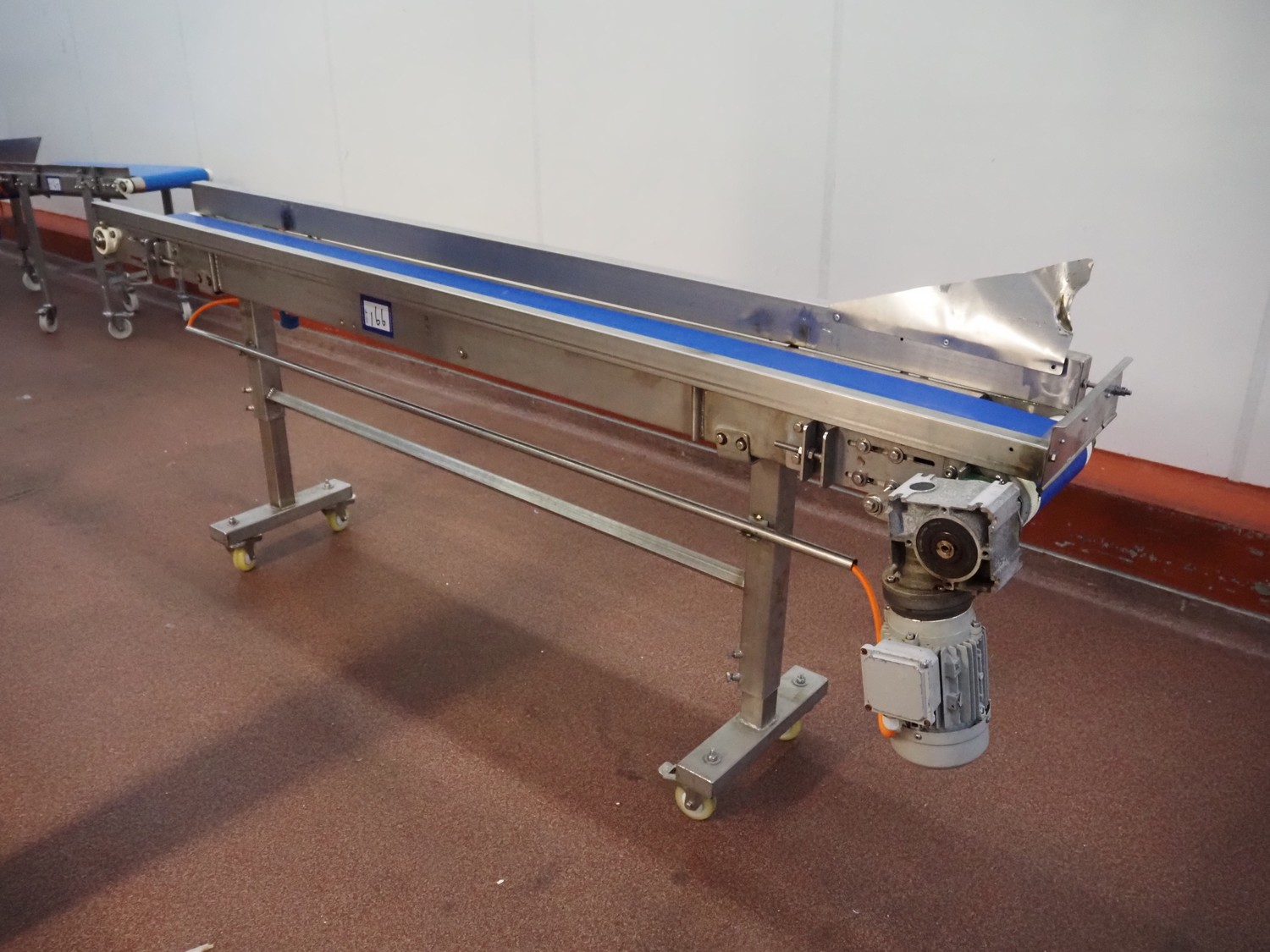 Mobile transport belt, s/s frame, plastic belt, belt width: 180 mm, total dimensions: 2550 mm x 550 mm x 980 mm.