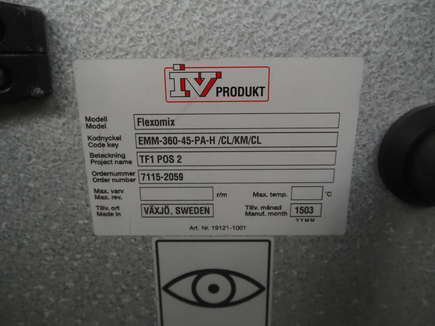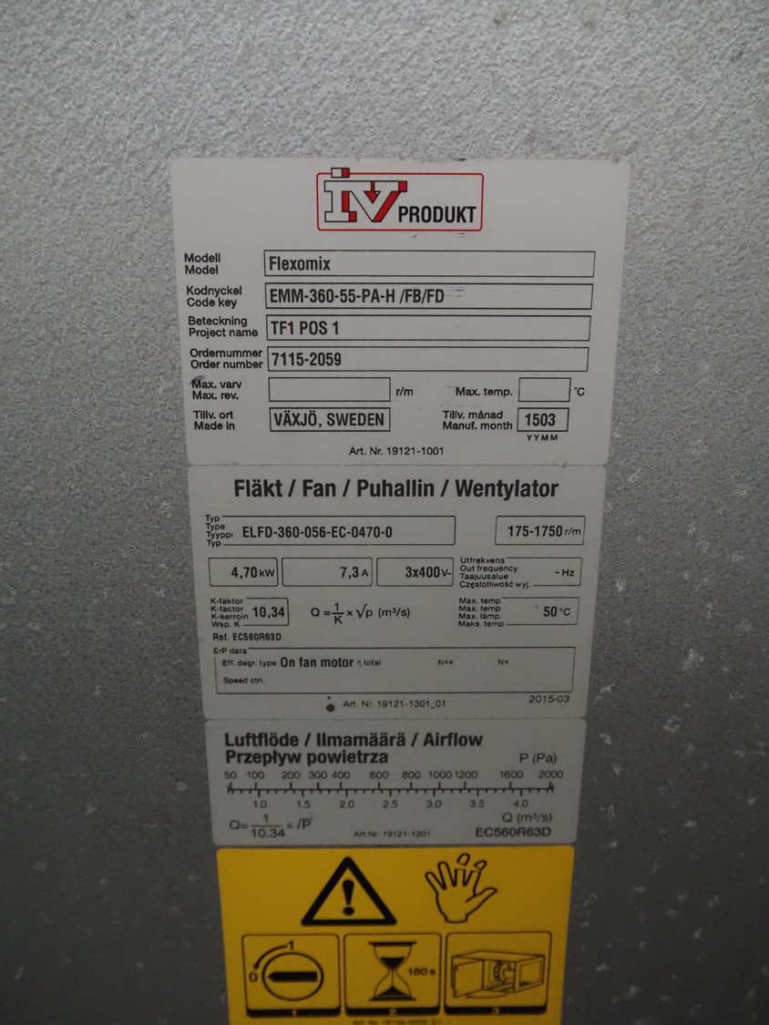 IV Produkt air treatment cabinet, model: Flexomix, order number: 7115-2059, year of construction: 03-2015, 400 V, 3 Ph, 7.3 A, 4.70 kW, dimensions: 3250 mm x 1750 mm x 1200 mm.