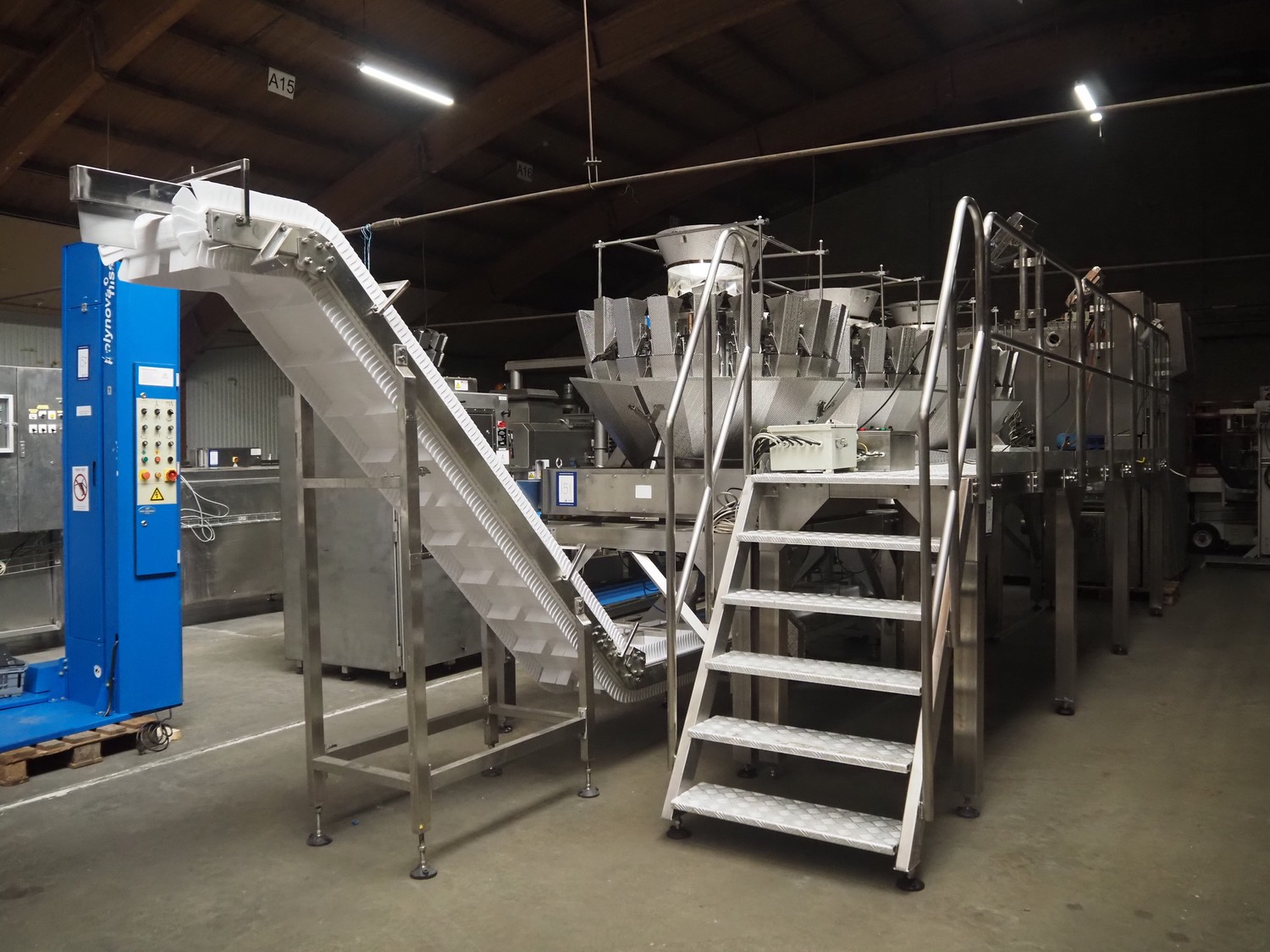 (3x) 20 heads multihead weighers, Elevating belt, S/s working platform.