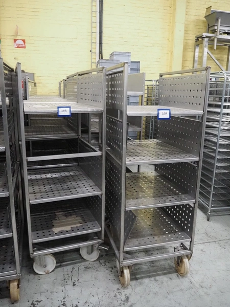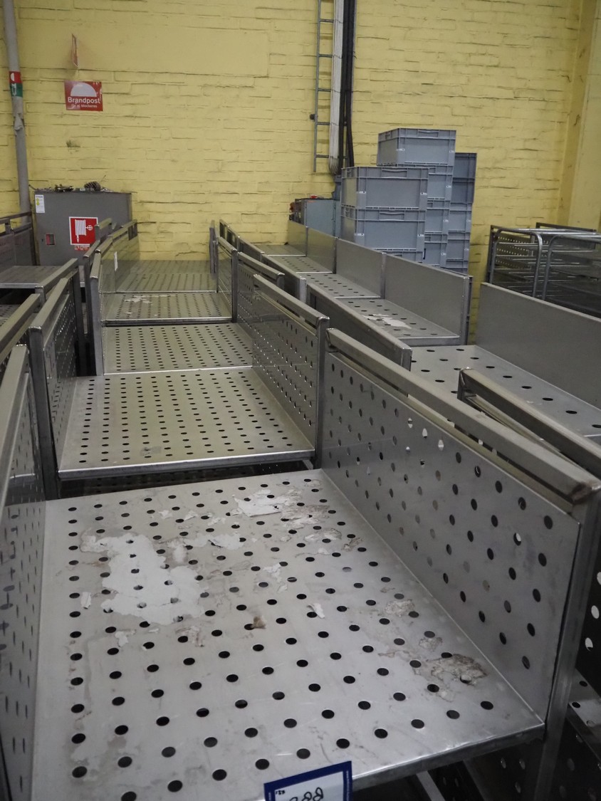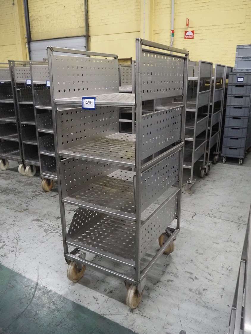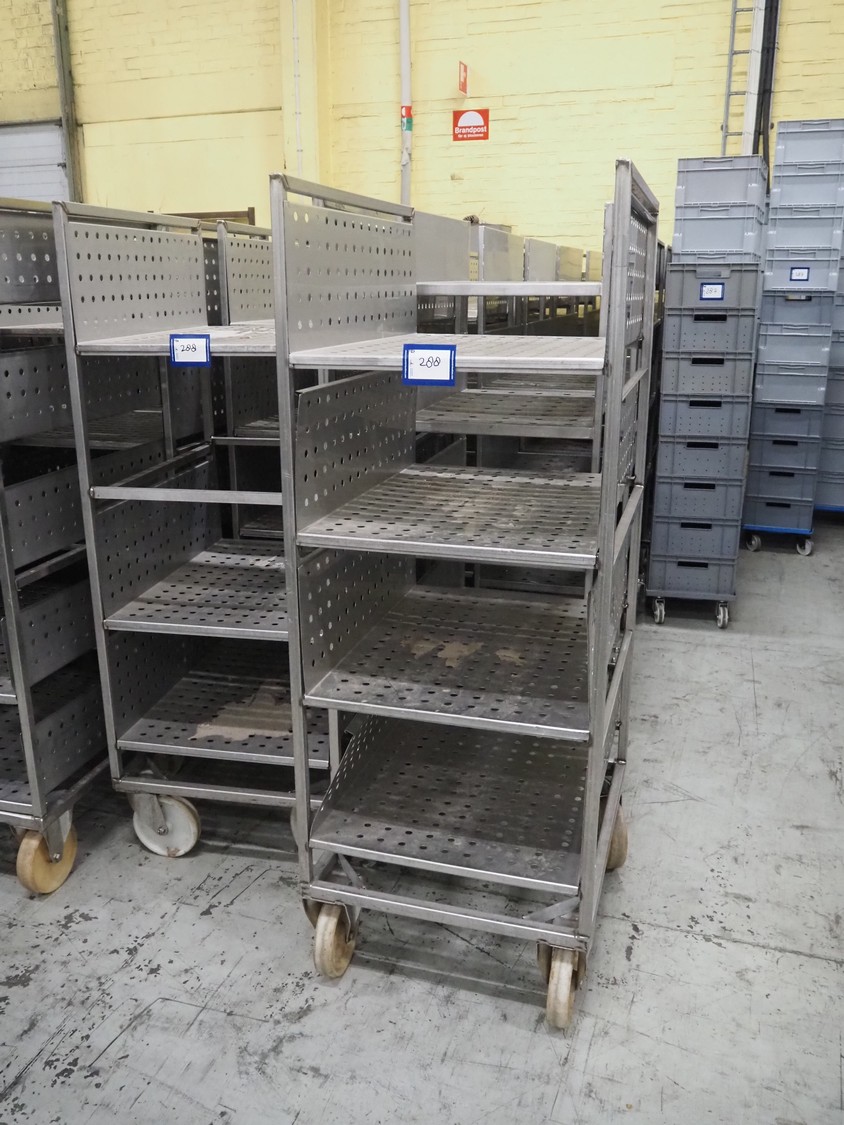 12 s/s trolleys with 4 floors, floor dimensions: 800 mm x 590 mm, total dimensions: (12x) 800 mm x 650 mm x 1580 mm.