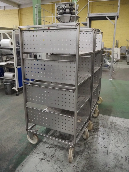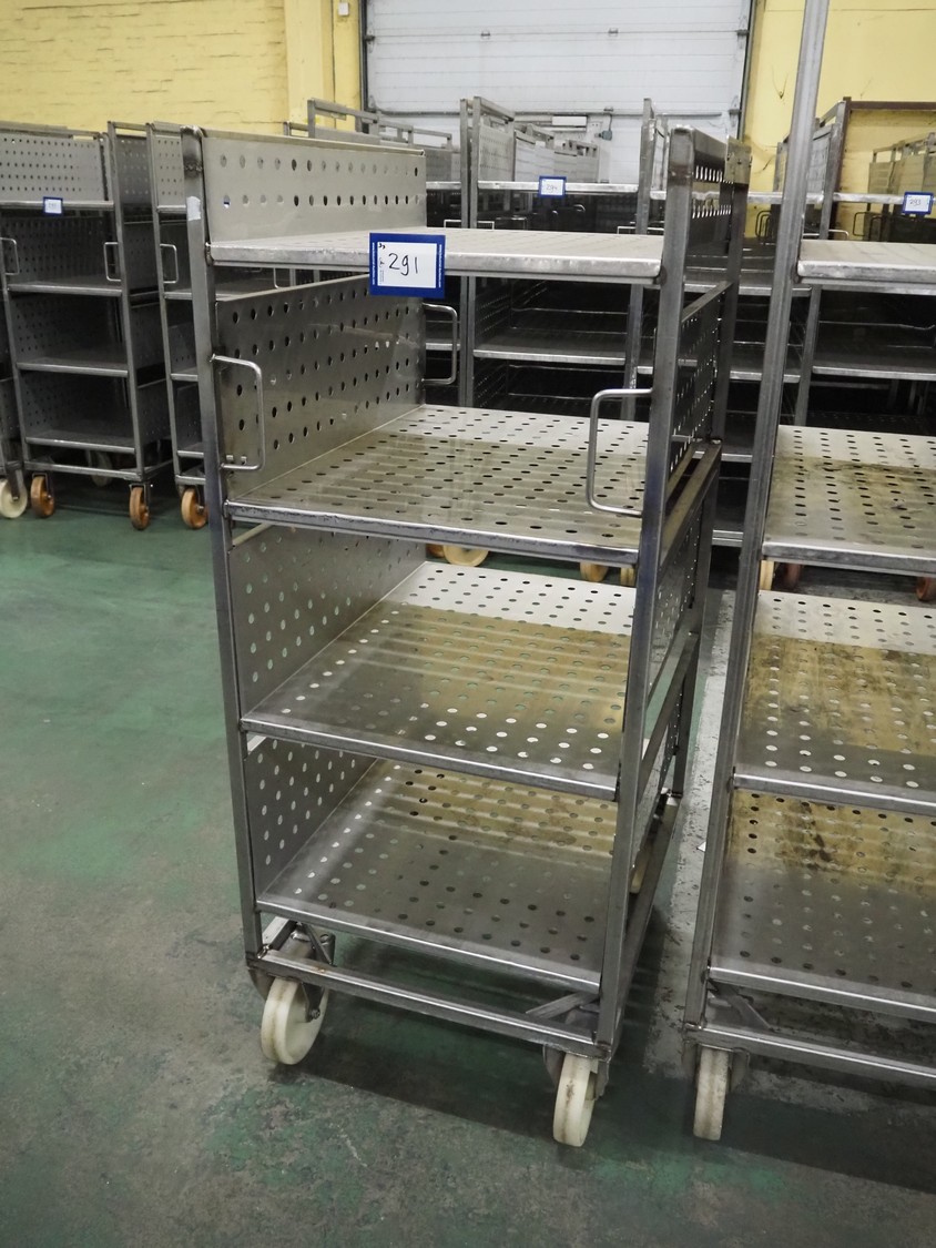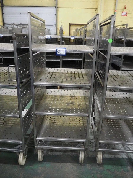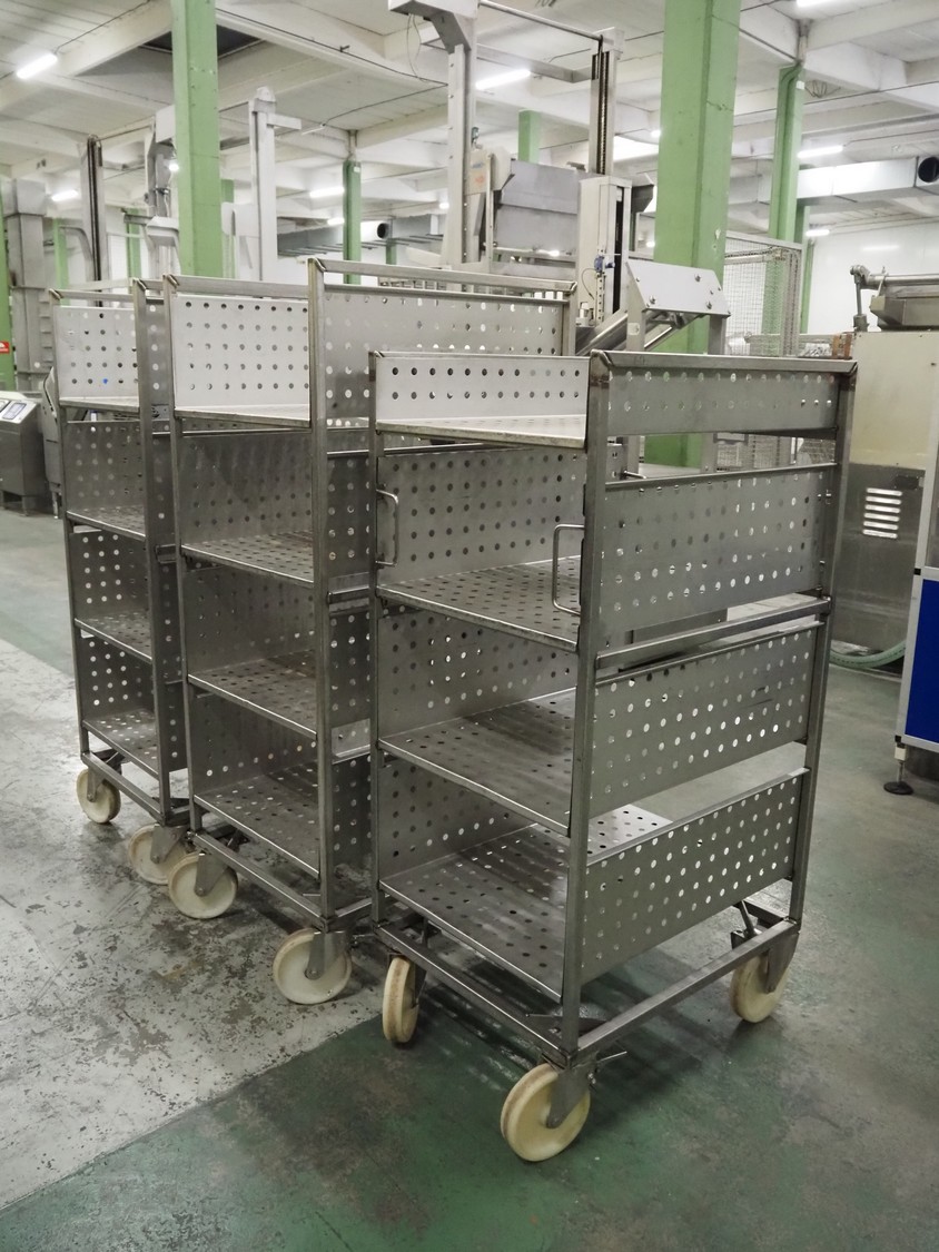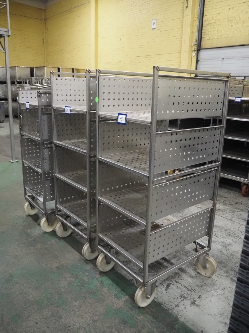 3 s/s trolleys with 4 floors, floor dimensions: 800 mm x 590 mm, total dimensions: (3x) 800 mm x 650 mm x 1580 mm.