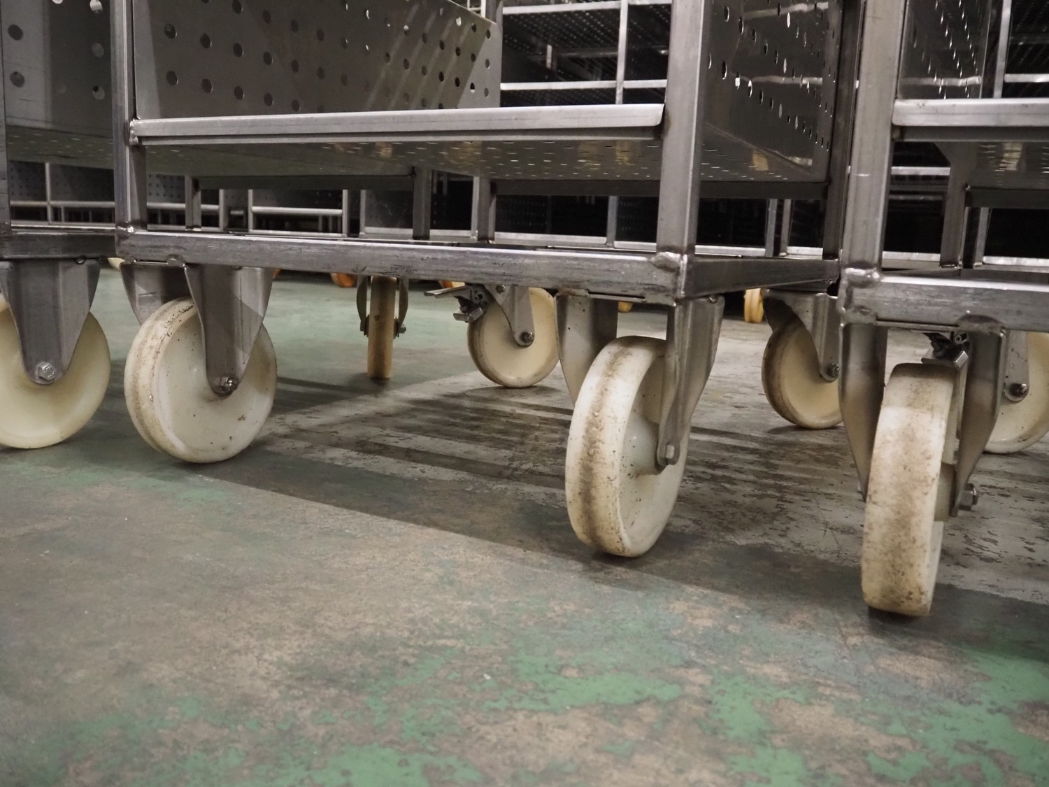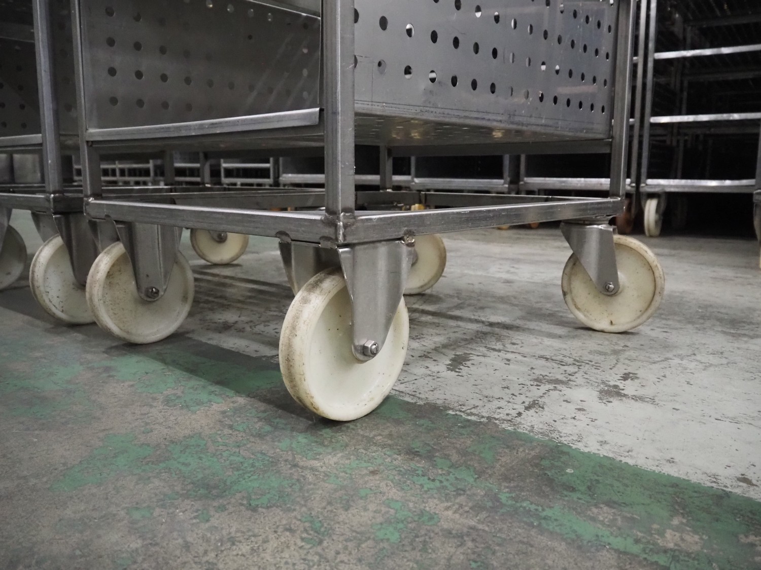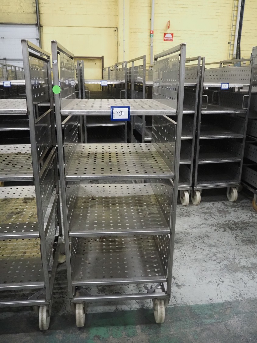 3 s/s trolleys with 4 floors, floor dimensions: 800 mm x 590 mm, total dimensions: (3x) 800 mm x 650 mm x 1580 mm.