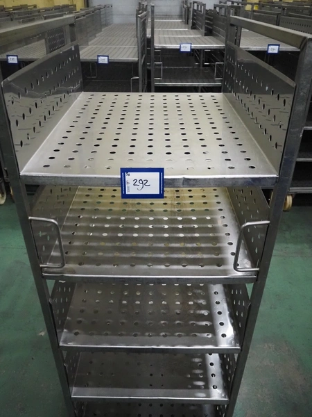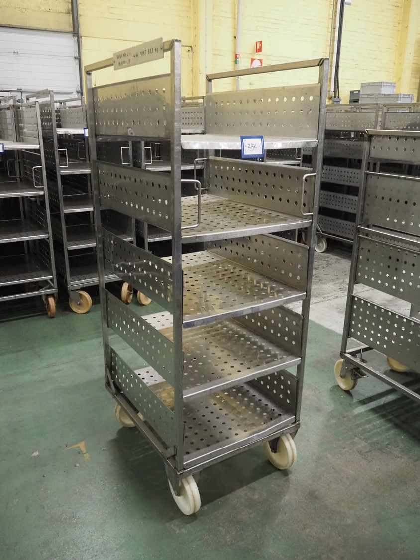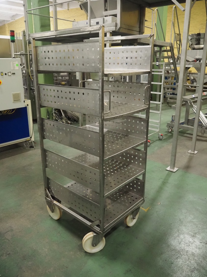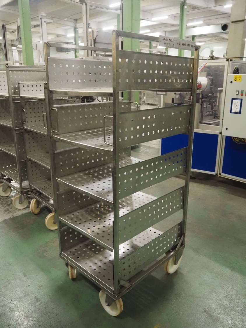 5 s/s trolleys with 4 floors, floor dimensions: 800 mm x 590 mm, total dimensions: (5x) 800 mm x 650 mm x 1580 mm.