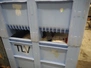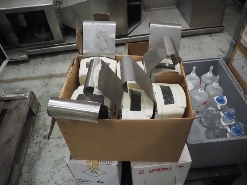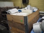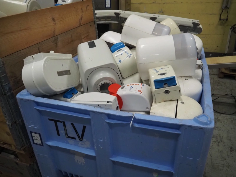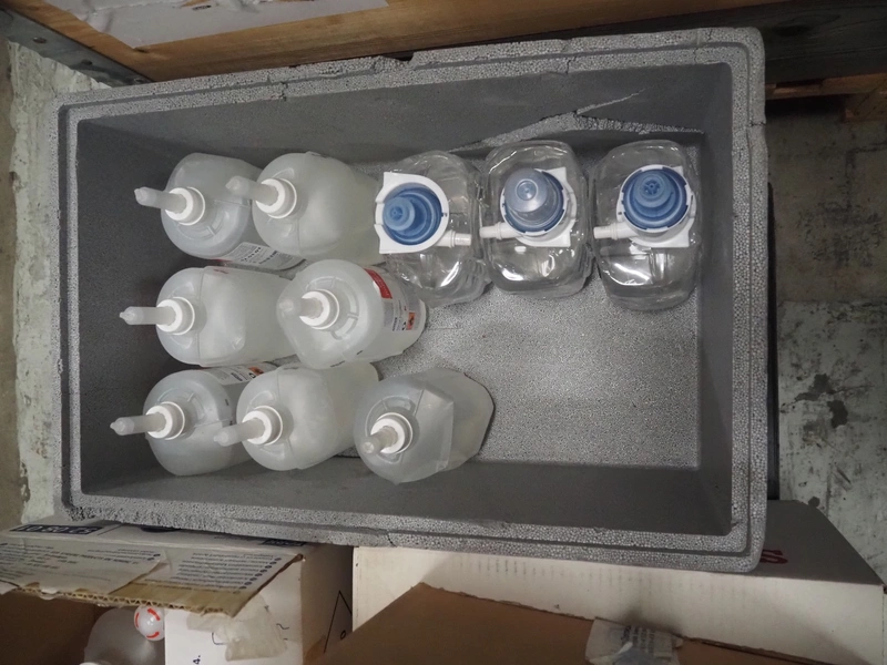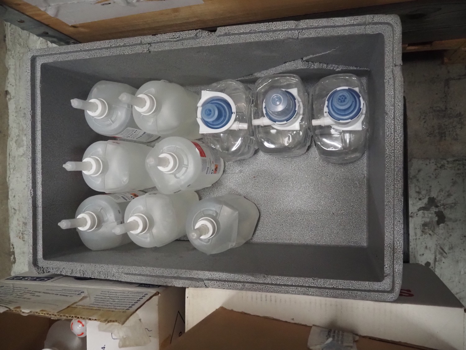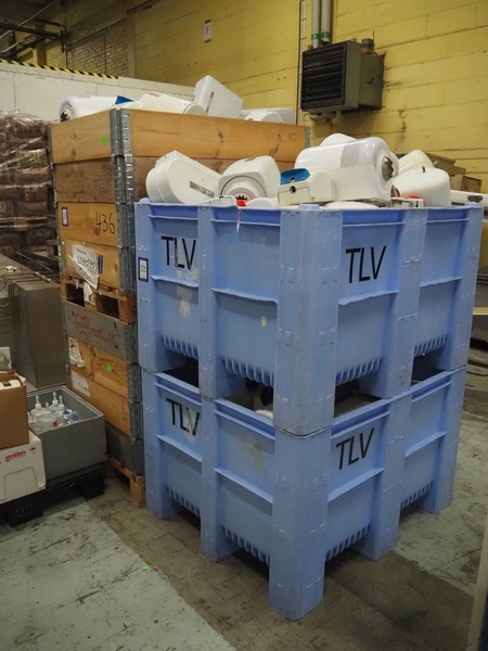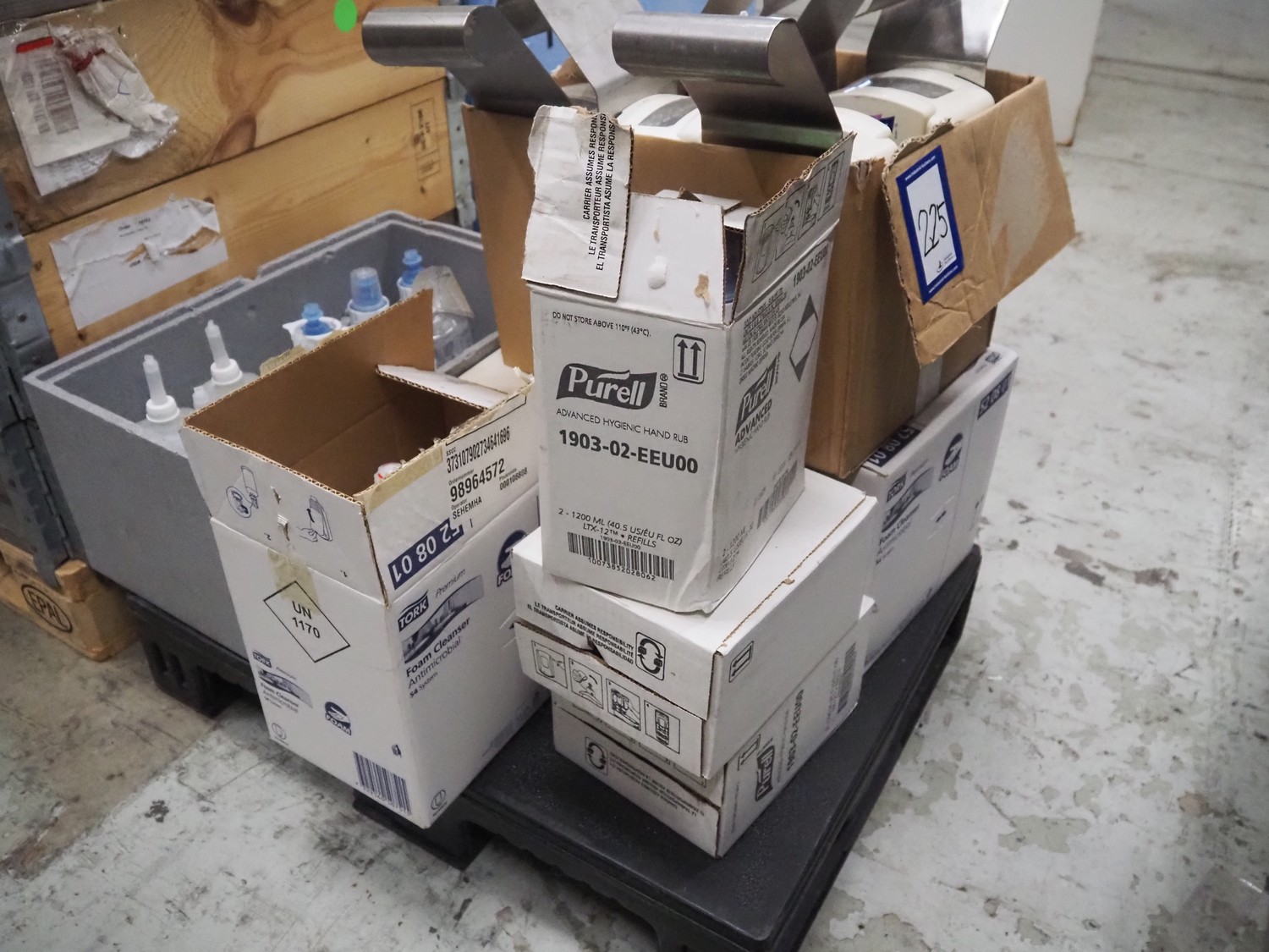 2 plastic pallet boxes, 2 wooden pallets with frames and 1 plastic pallet with large amount of soap and paper dispensers.