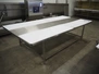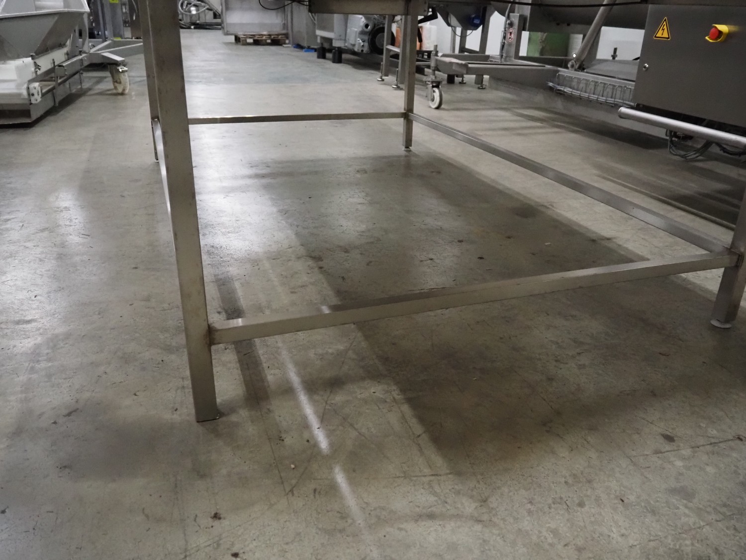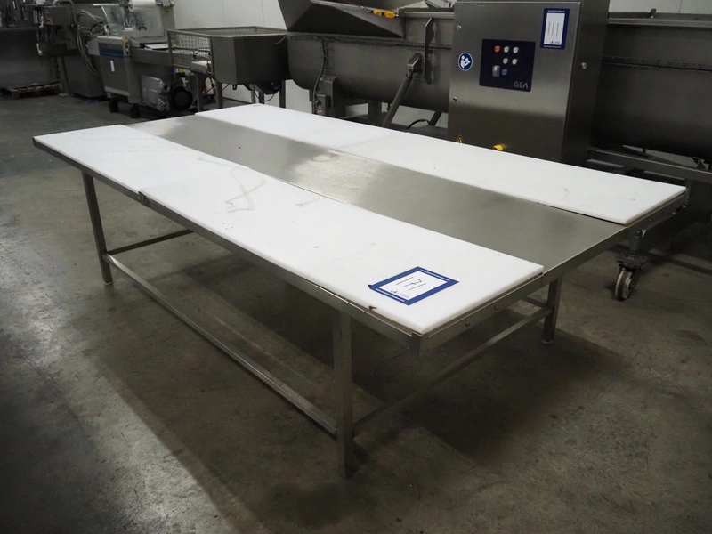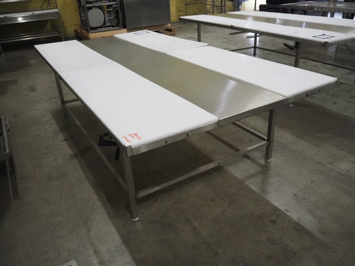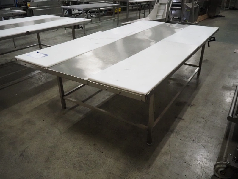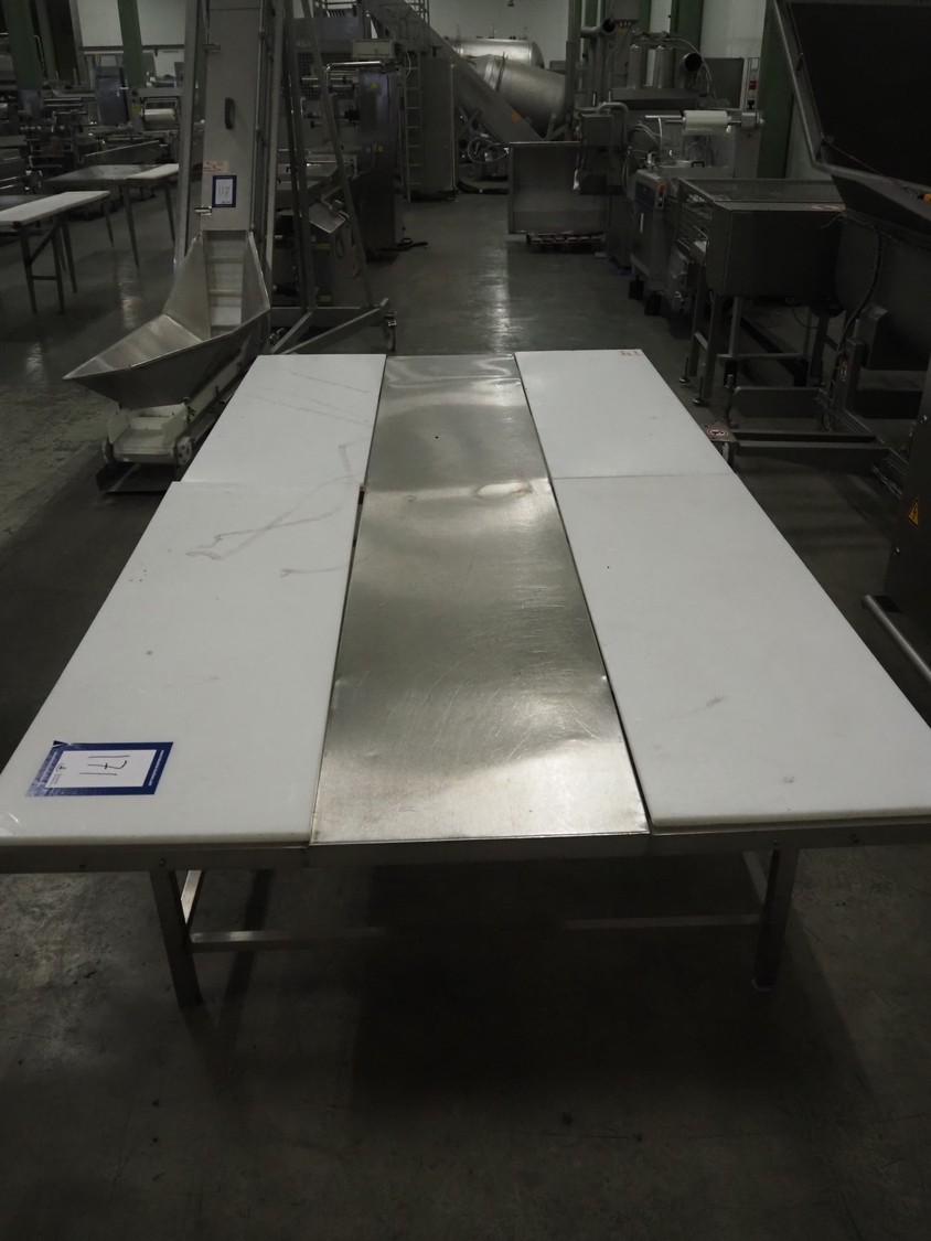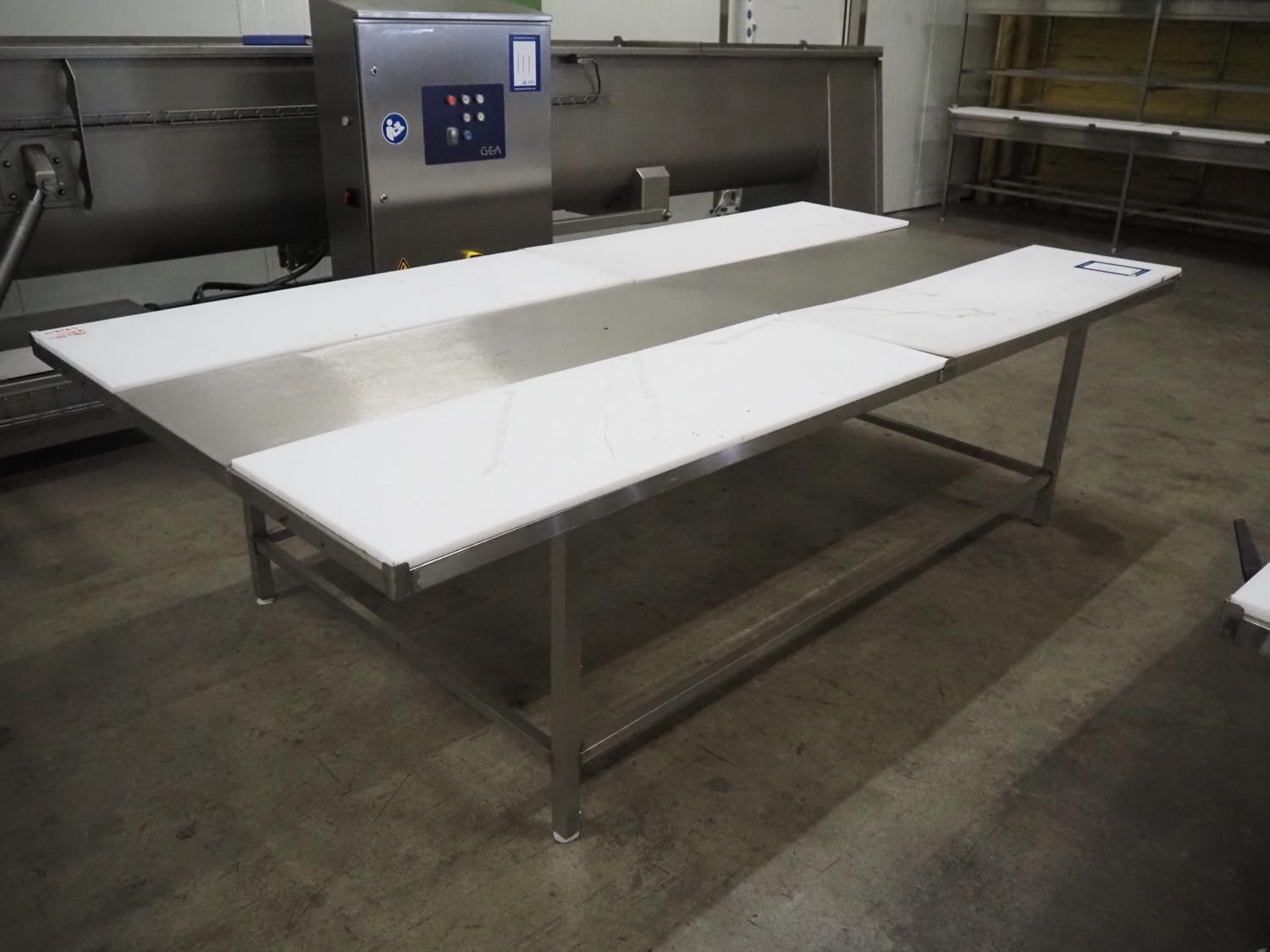 S/s table with 2 plastic worktops, dimensions: 2900 mm x 1500 mm x 800 mm.