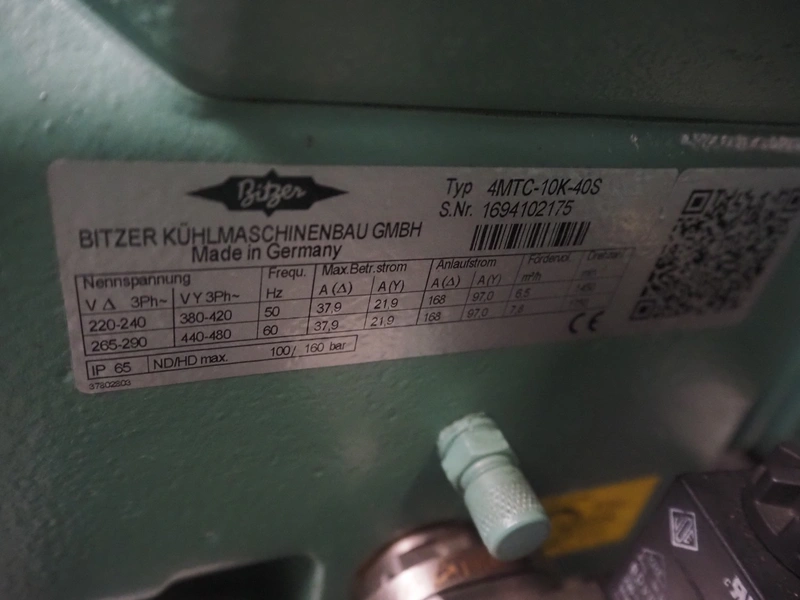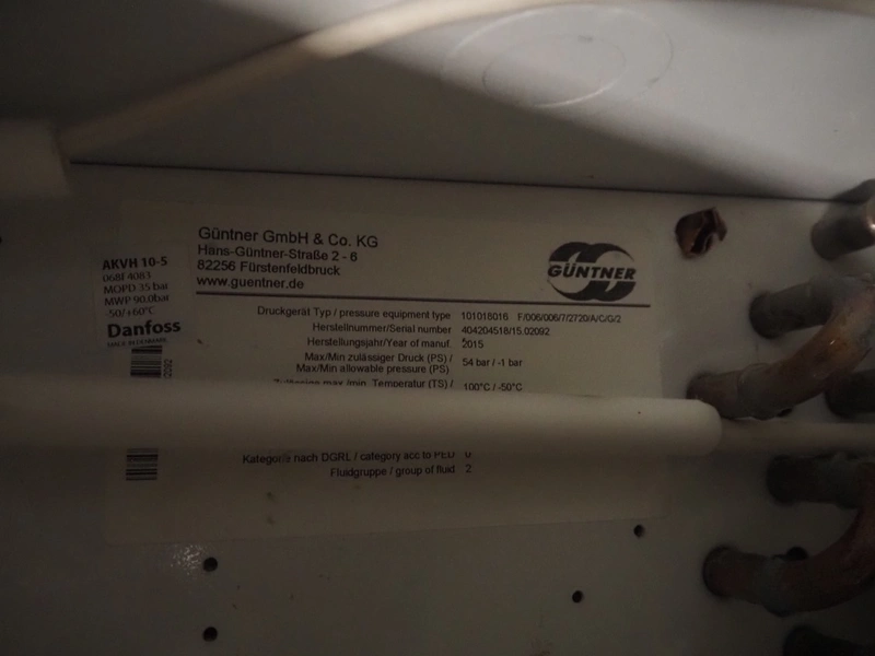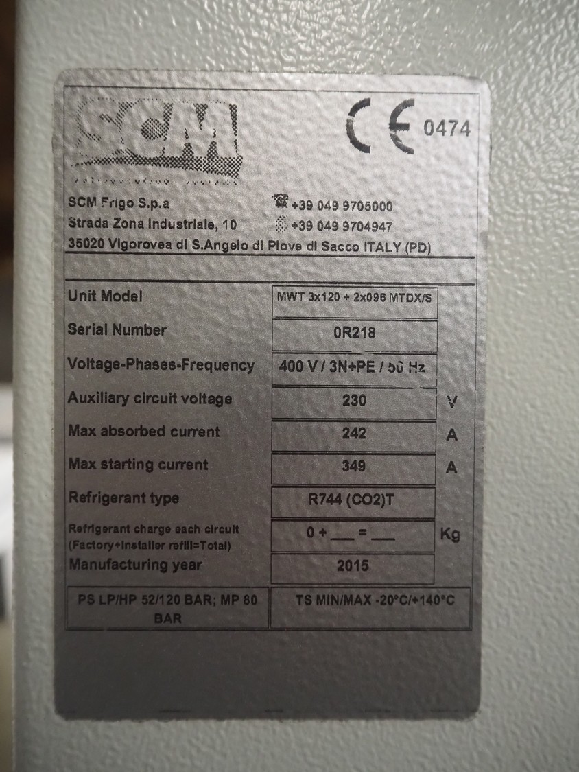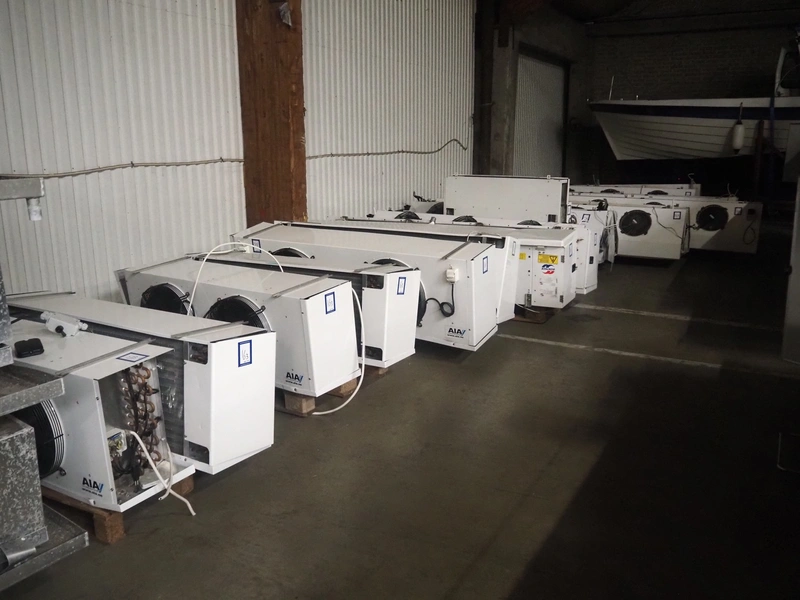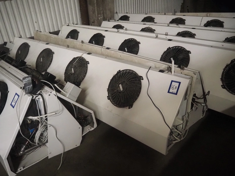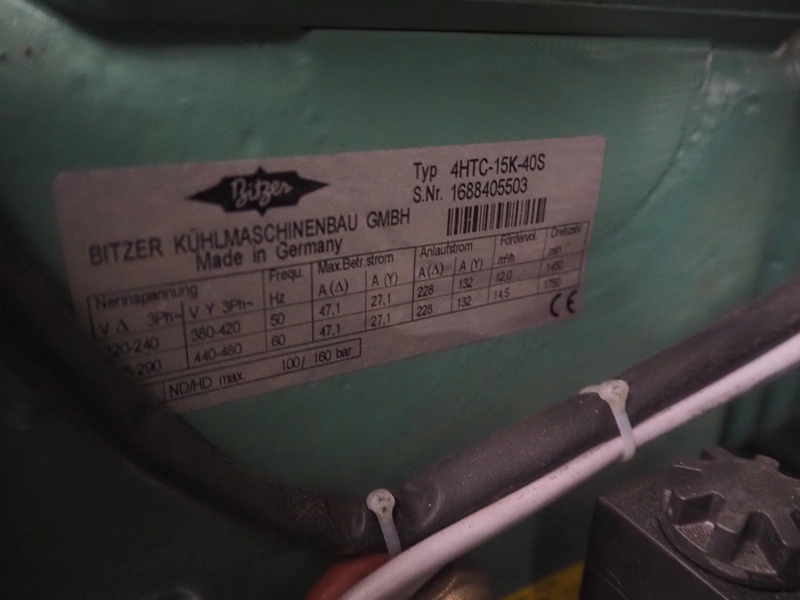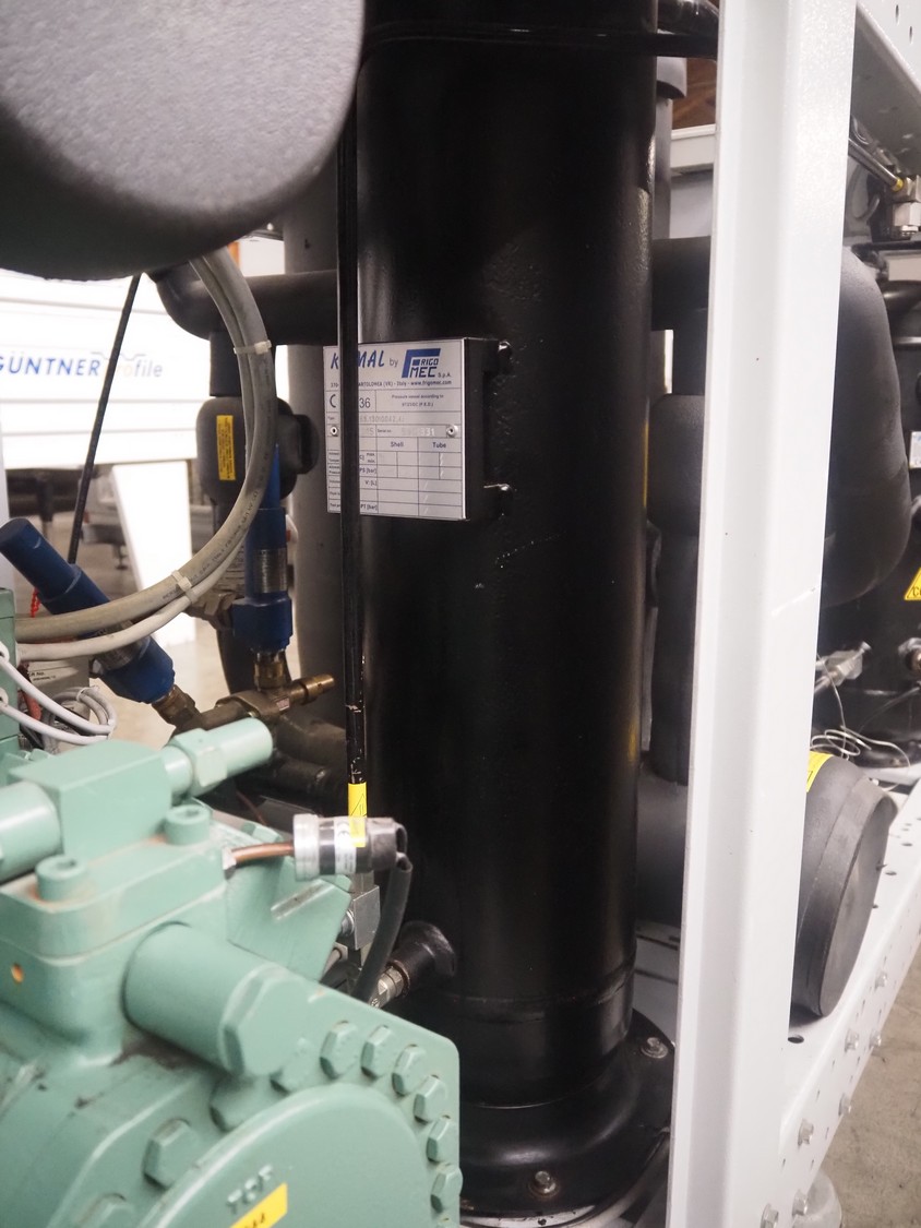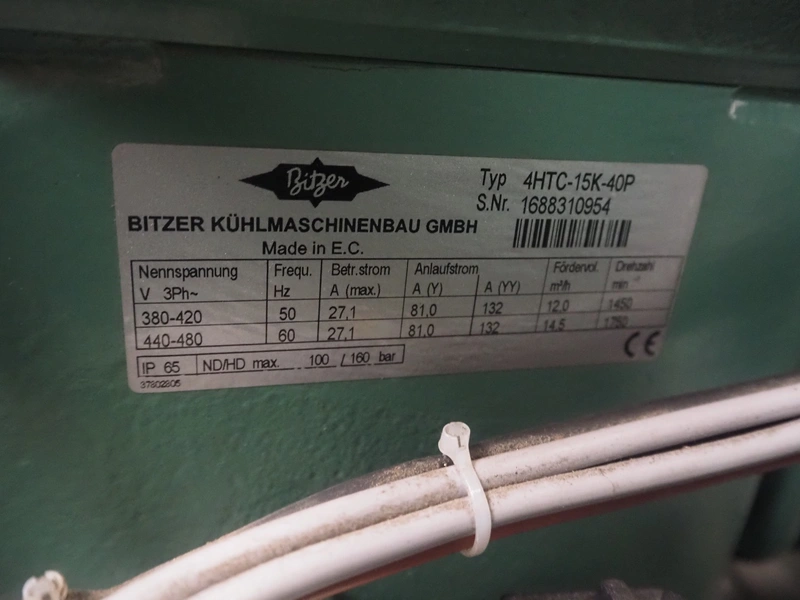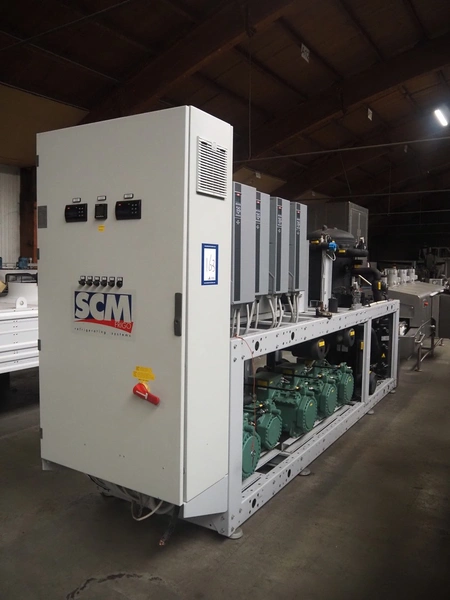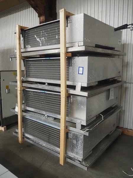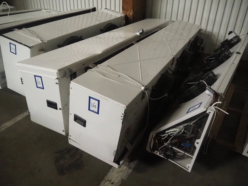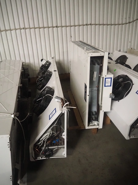 Complete cooling installation consisting of: SCM Frigo S.p.a. cooling compressor rack consisting of 5 Bitzer cooling compressors, type compressors: (3x) 4HTC-15K-40S and (2x) 4HTC-15K-40S, dimensions: 4450 mm x 1000 mm x 2000 mm, Güntner roof condenser, 3 fans, dimensions: 4450 mm x 1000 mm x 2200 mm, 31 evaporators, among others: AIA, Searle and Güntner, dimensions: (11x) 2300 mm x 350 mm x 550 mm, (4x) 2550 mm x 420 mm x 550 mm, (4x) 1500 mm x 400 mm x 520 mm, (1x) 1340 mm x 850 mm x 260 mm, (11x) 1400 mm x 1600 mm x 400 mm, switch cabinet, dimensions: 1000 mm x 1000 mm x 300 mm, pallet with parts.