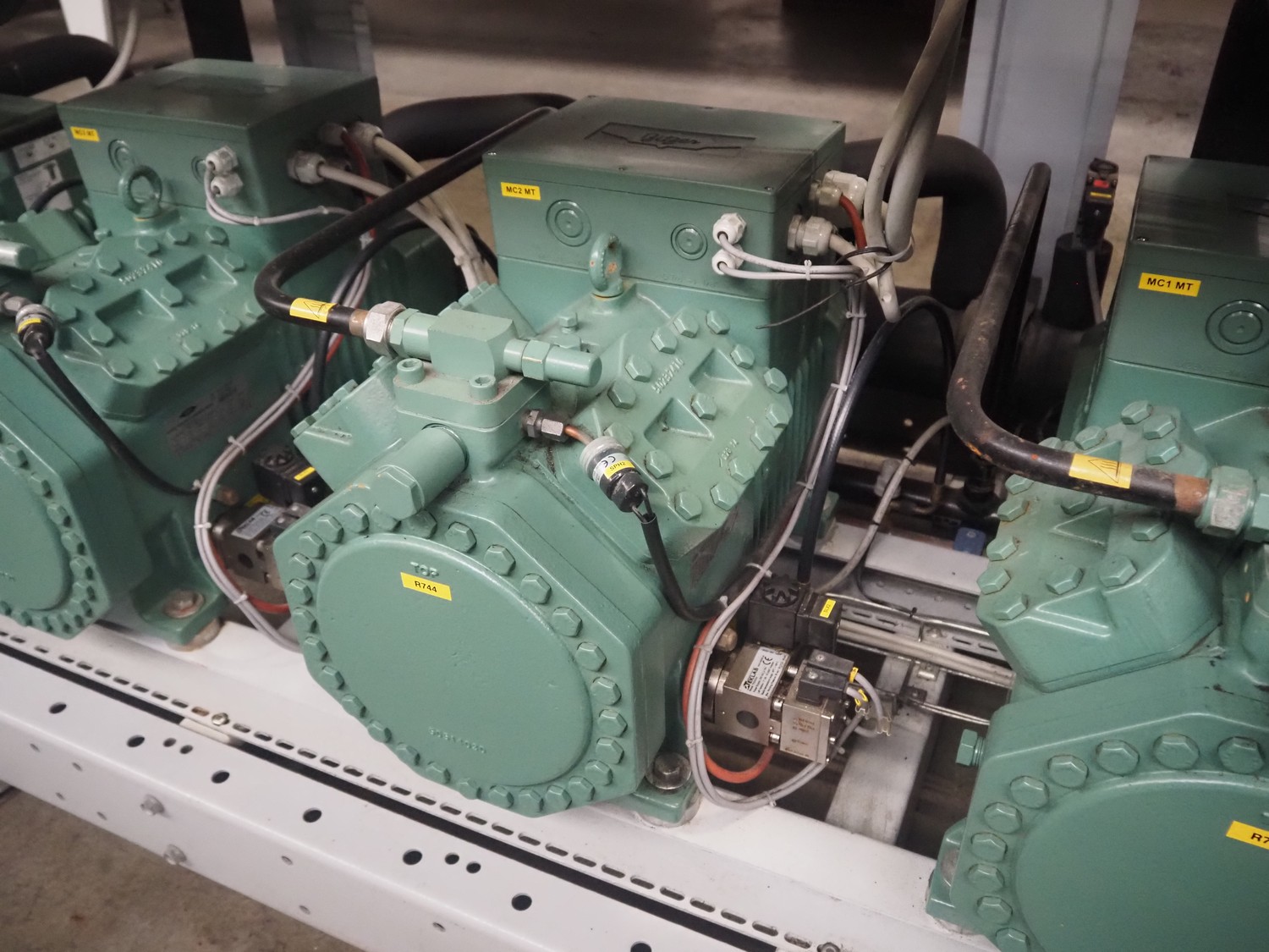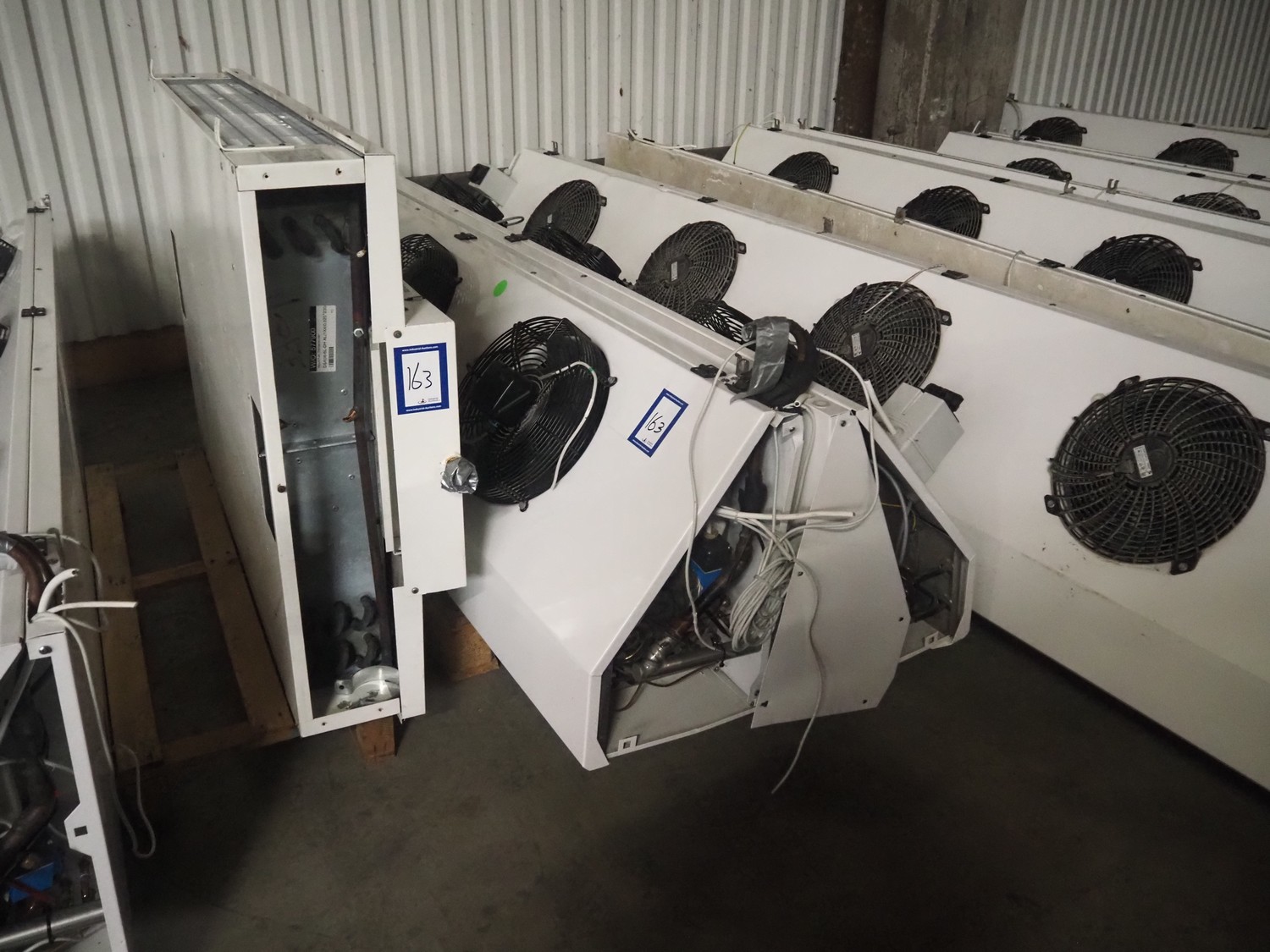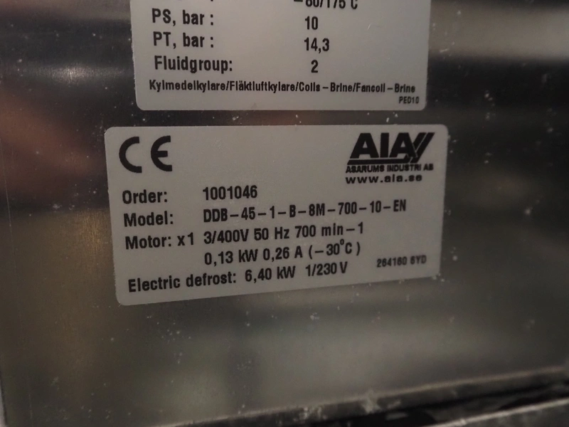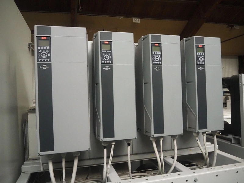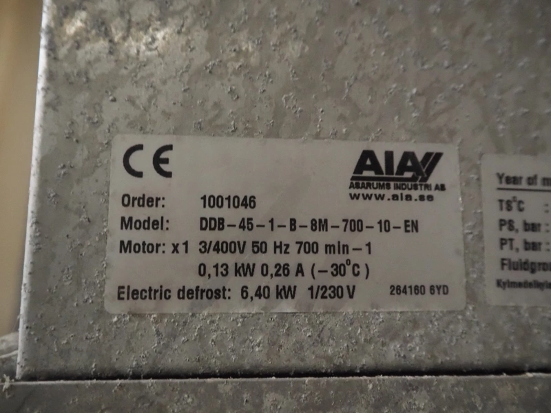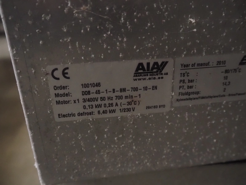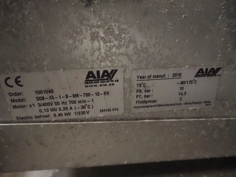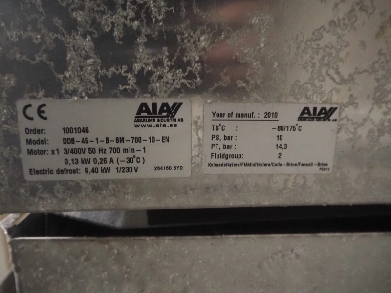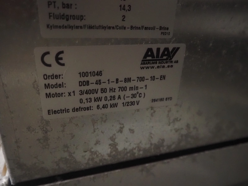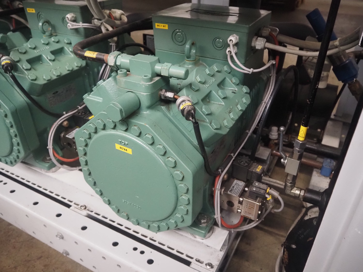 Complete cooling installation consisting of: SCM Frigo S.p.a. cooling compressor rack consisting of 5 Bitzer cooling compressors, type compressors: (3x) 4HTC-15K-40S and (2x) 4HTC-15K-40S, dimensions: 4450 mm x 1000 mm x 2000 mm, Güntner roof condenser, 3 fans, dimensions: 4450 mm x 1000 mm x 2200 mm, 31 evaporators, among others: AIA, Searle and Güntner, dimensions: (11x) 2300 mm x 350 mm x 550 mm, (4x) 2550 mm x 420 mm x 550 mm, (4x) 1500 mm x 400 mm x 520 mm, (1x) 1340 mm x 850 mm x 260 mm, (11x) 1400 mm x 1600 mm x 400 mm, switch cabinet, dimensions: 1000 mm x 1000 mm x 300 mm, pallet with parts.