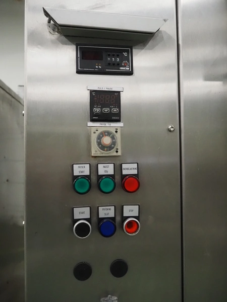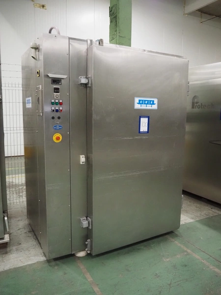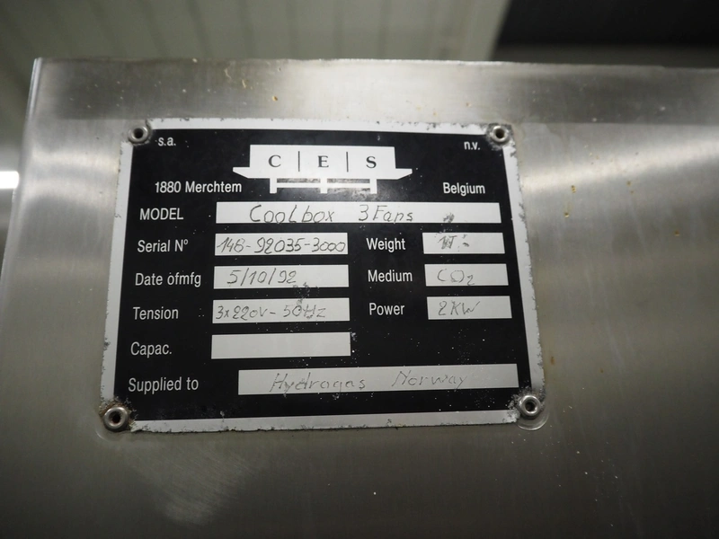 CES nitrogen freezer, model: coolbox 3 fans, serial number:148-92035-3000, year of construction: 1992, 220 V, 3 Ph, 2 kW, weight: 1000 kg, inside dimensions: 1200 mm x 1150 mm x 2180 mm, total dimensions: 1950 mm x 1500 mm x 2400 mm.