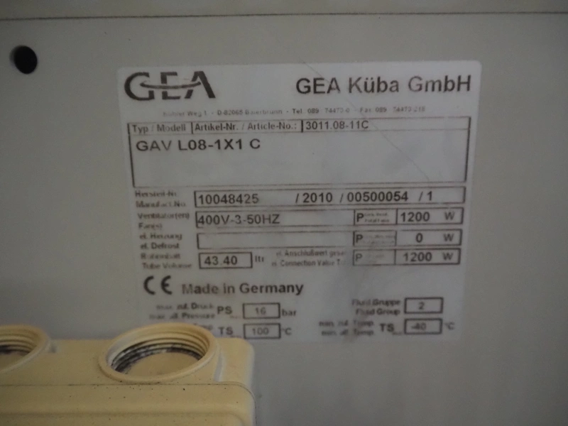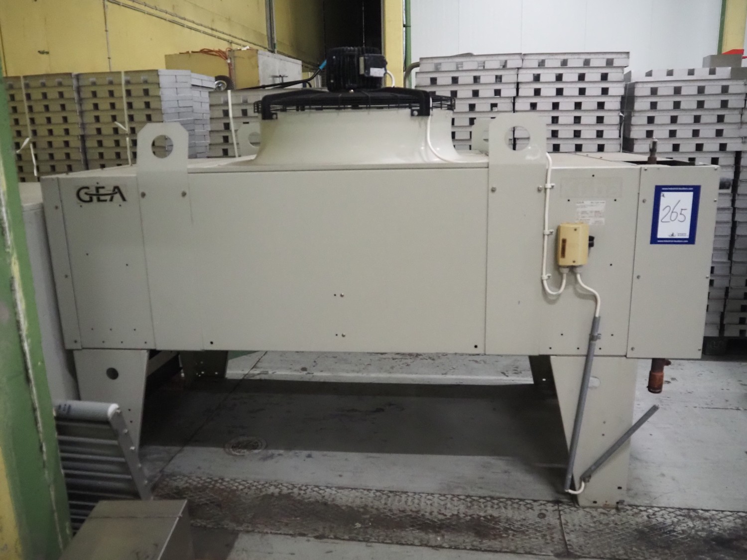 GEA roof condenser, type: GAV L08-1X1 C, number: 10048425, year of construction: 2010, 400 V, 3 Ph, 50 Hz, 1200 W, volume: 43.40 liter, dimensions: 2400 mm x 1300 mm x 1700 mm.