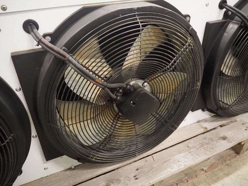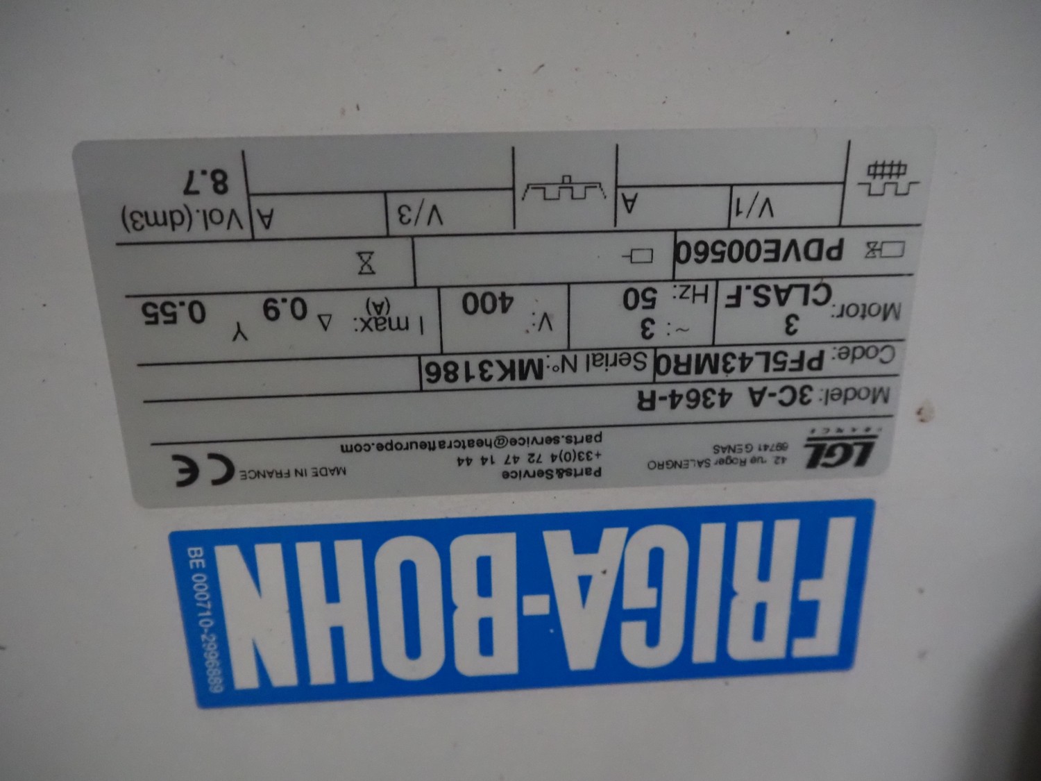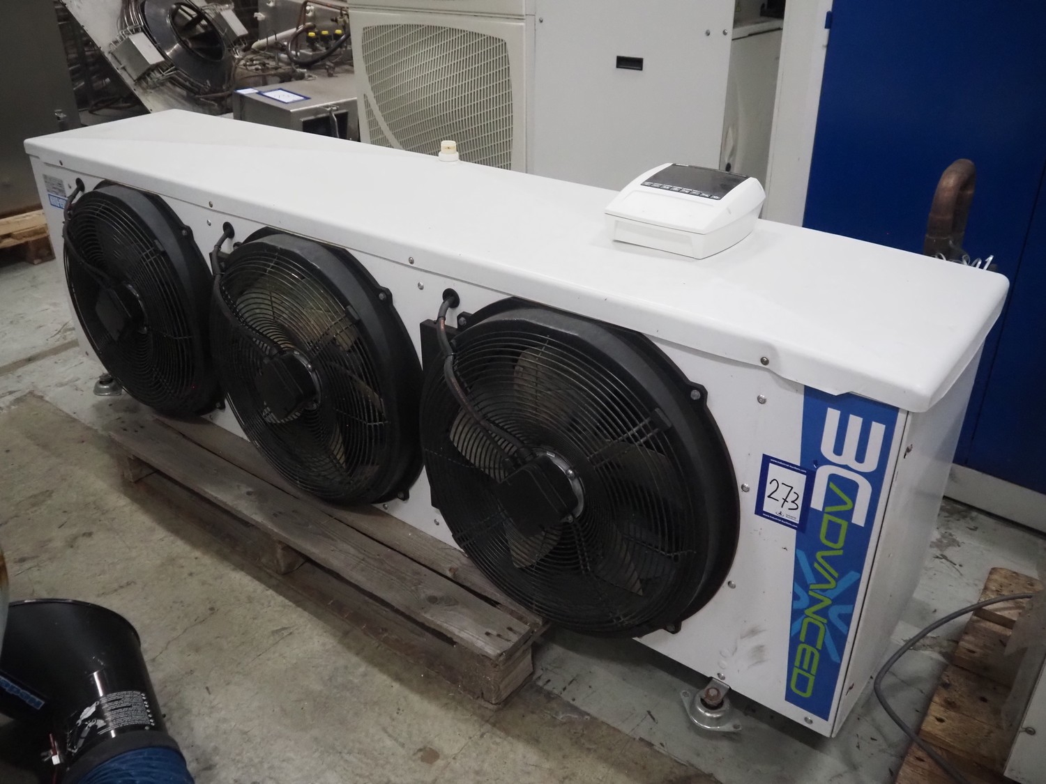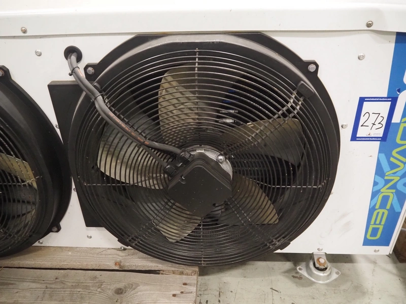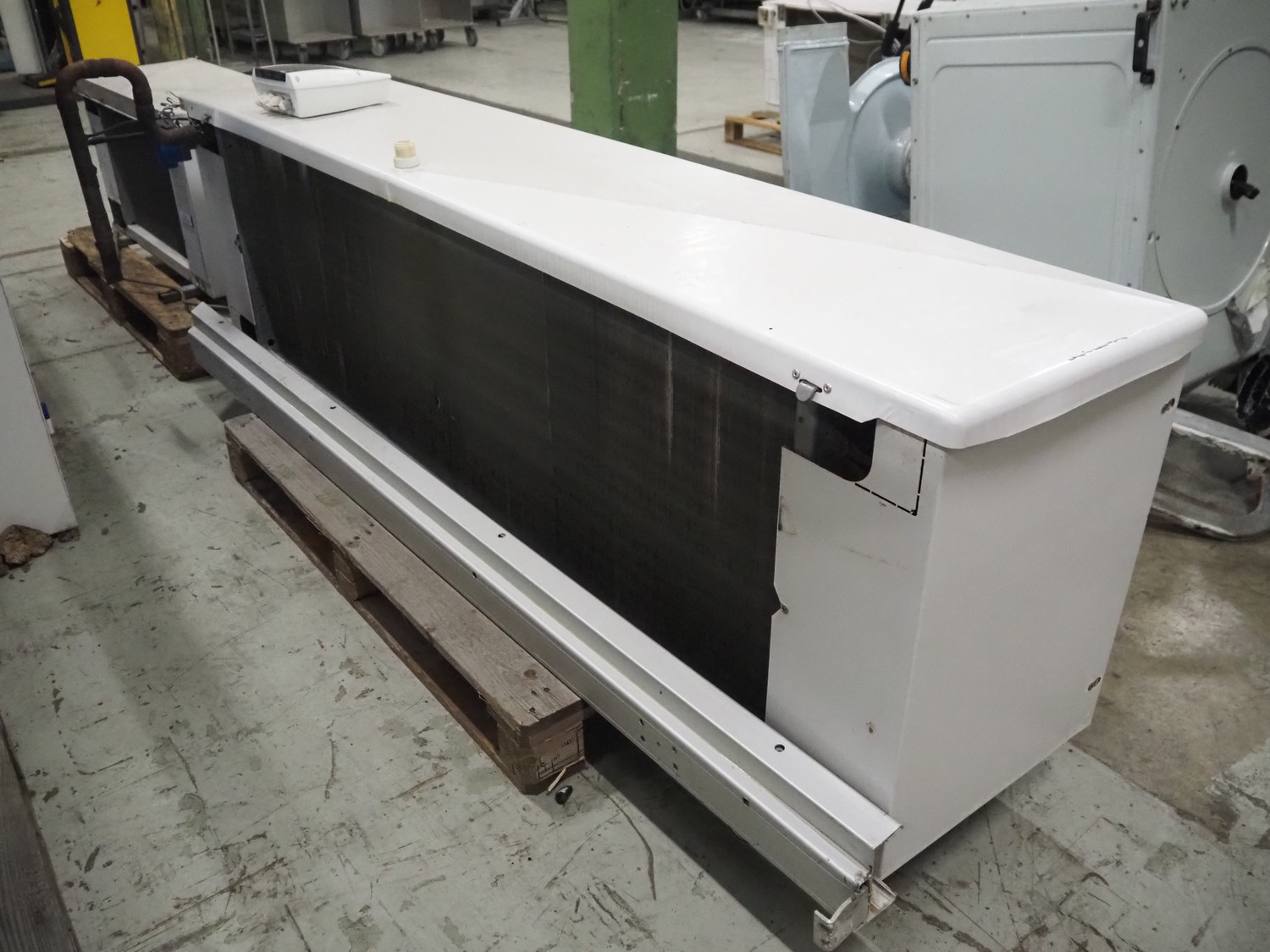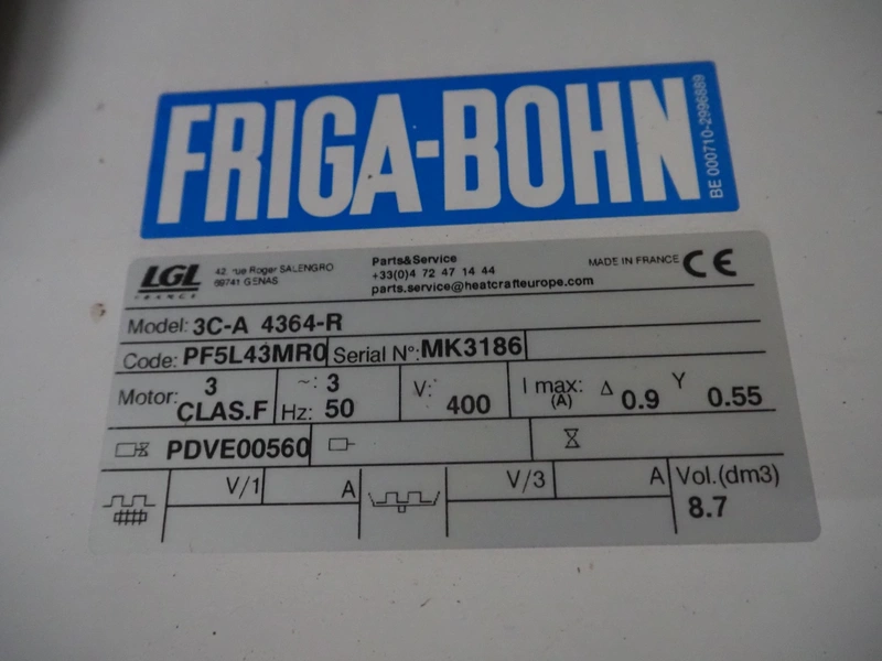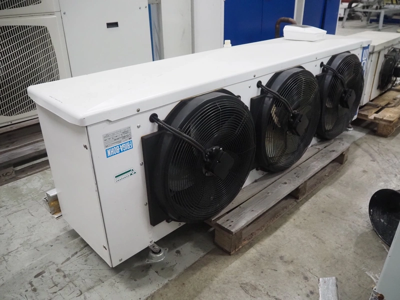 Friga-Bohn evaporator with 3 fans, model: 3C-A 4364-R, serial number: MK3186, 400 V, 3 Ph, 50 Hz, 0.9/0.55 A, tube volume: 8.7 dm3, 3 fans, dimensions: 2200 mm x 750 mm x 670 mm.