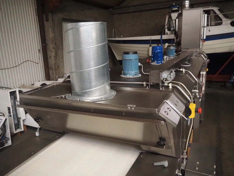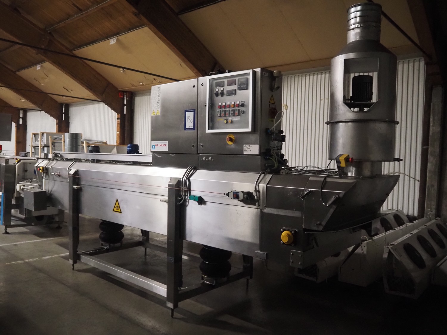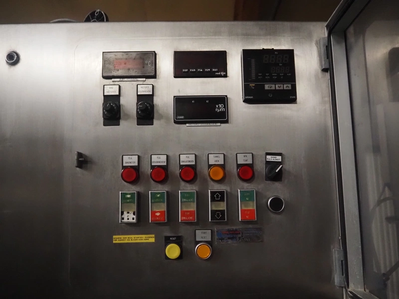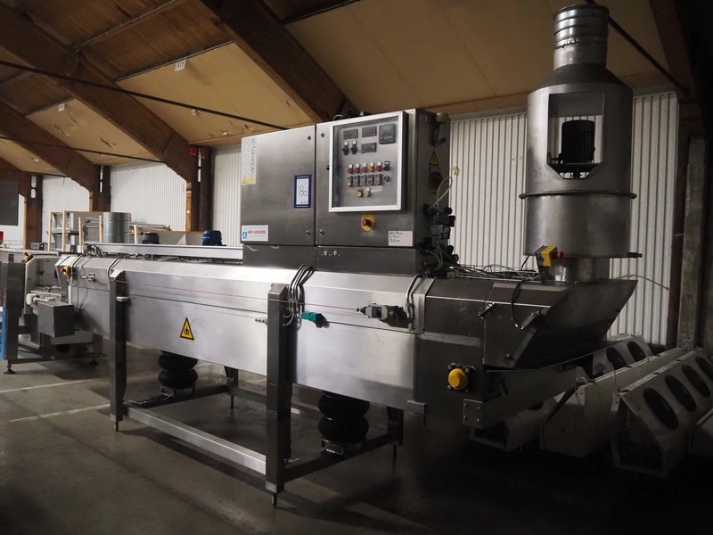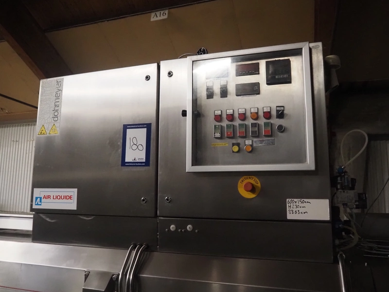 CES Group liquid nitrogen freezing tunnel, type: CES-LT-LIN-8mx0.66-PODB, serial number: CES 238, year of construction: December 1998, 400 V, 3 Ph, 9 kW, weight: 3500 kg, plastic mesh belt, belt width: 680 mm, clearance: 640 mm x 50 mm, total dimensions: 5850 mm x 1450 mm x 2880 mm.