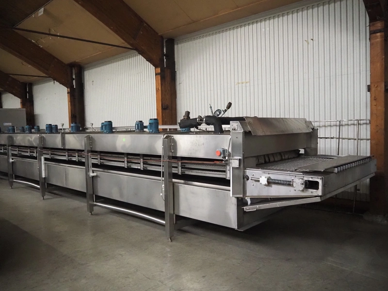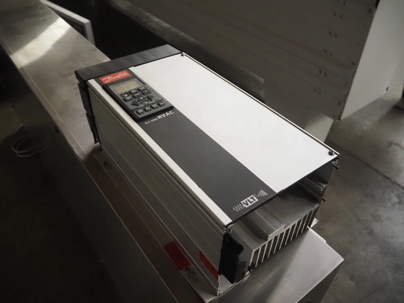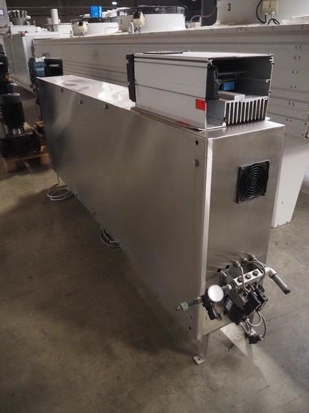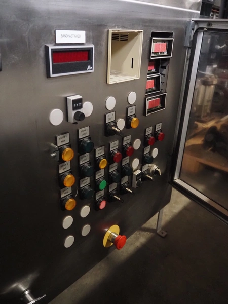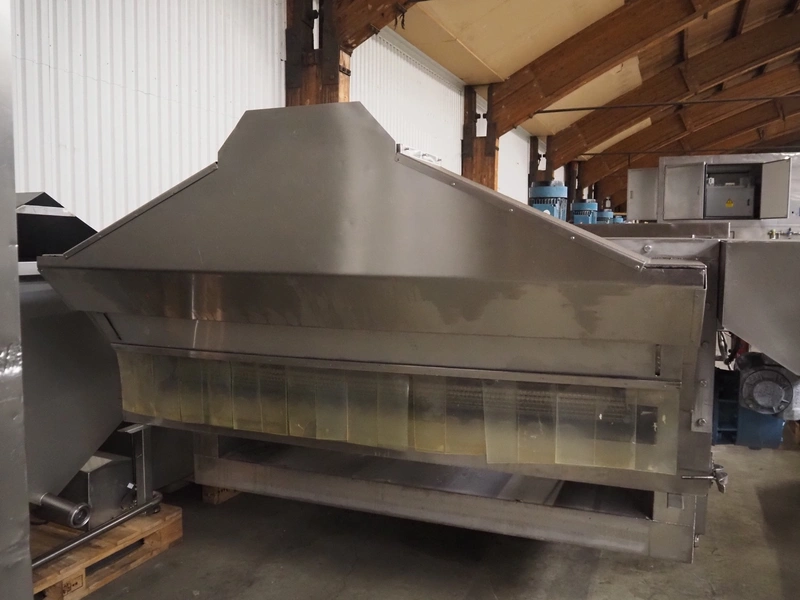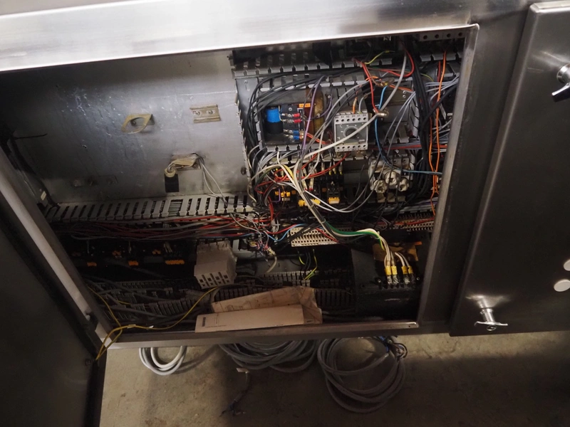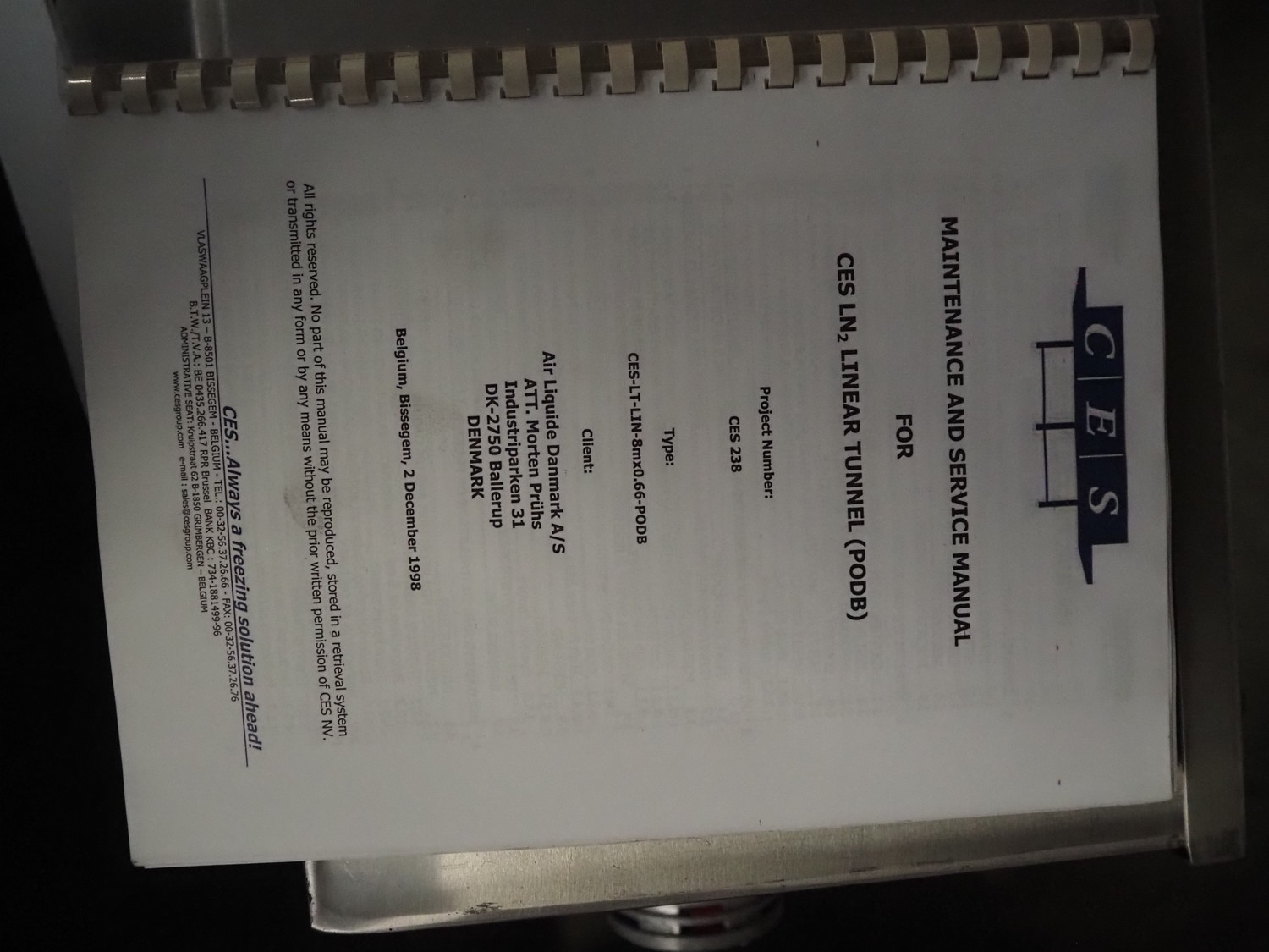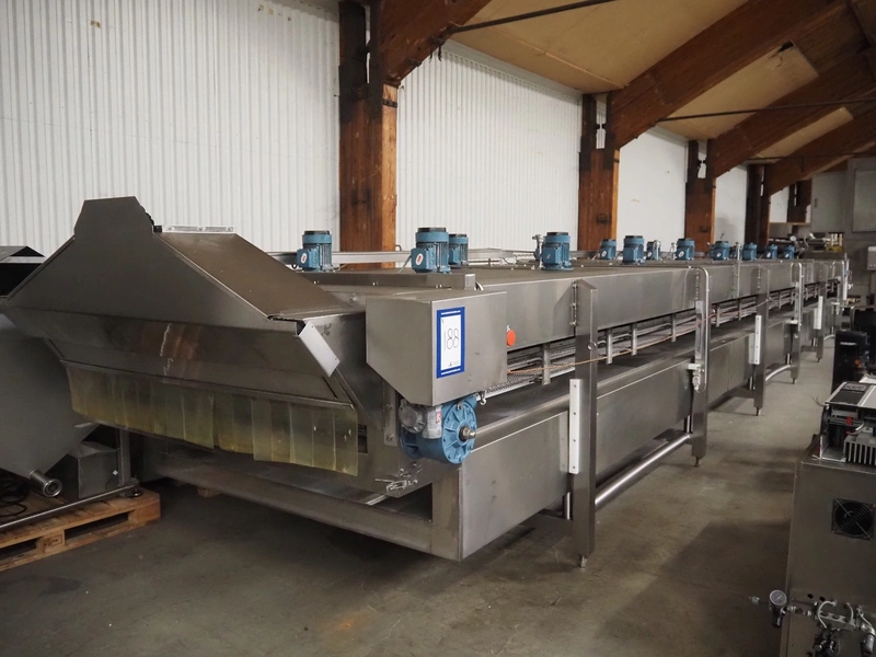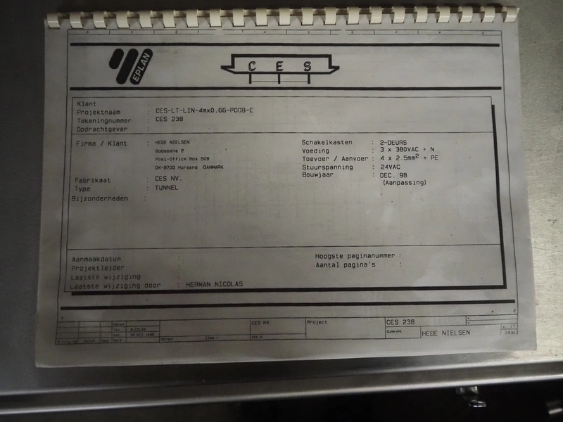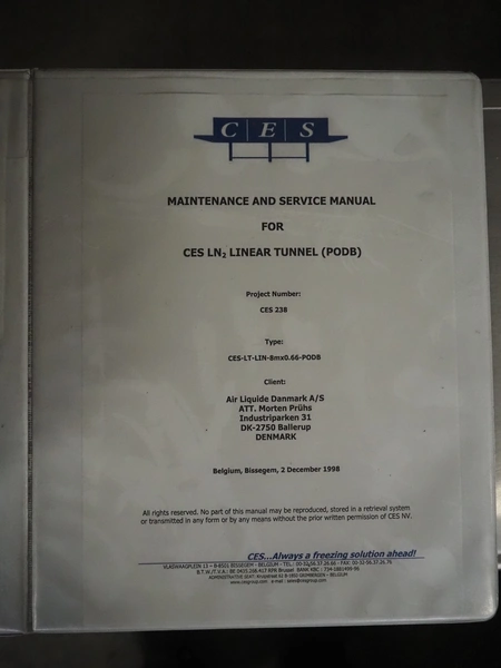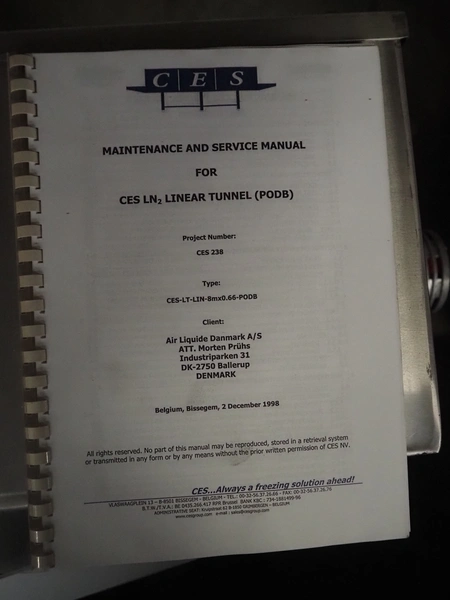 CES Group nitrogen freezing tunnel, type: CES-LT-LIN-8mx0.66-PODB, year of construction: 2-12-1998, 380 V, 3 Ph, s/s mesh belt, belt width: 1570 mm, clearance: 1500 mm x 140 mm, total dimensions: 13750 mm x 2300 mm x 1700 mm. Including s/s switch cabinet, dimensions switch cabinet: 2250 mm x 310 mm x 850 mm and Danfoss frequency convertor, dimensions frequency convertor: 250 mm x 200 mm x 500 mm.
