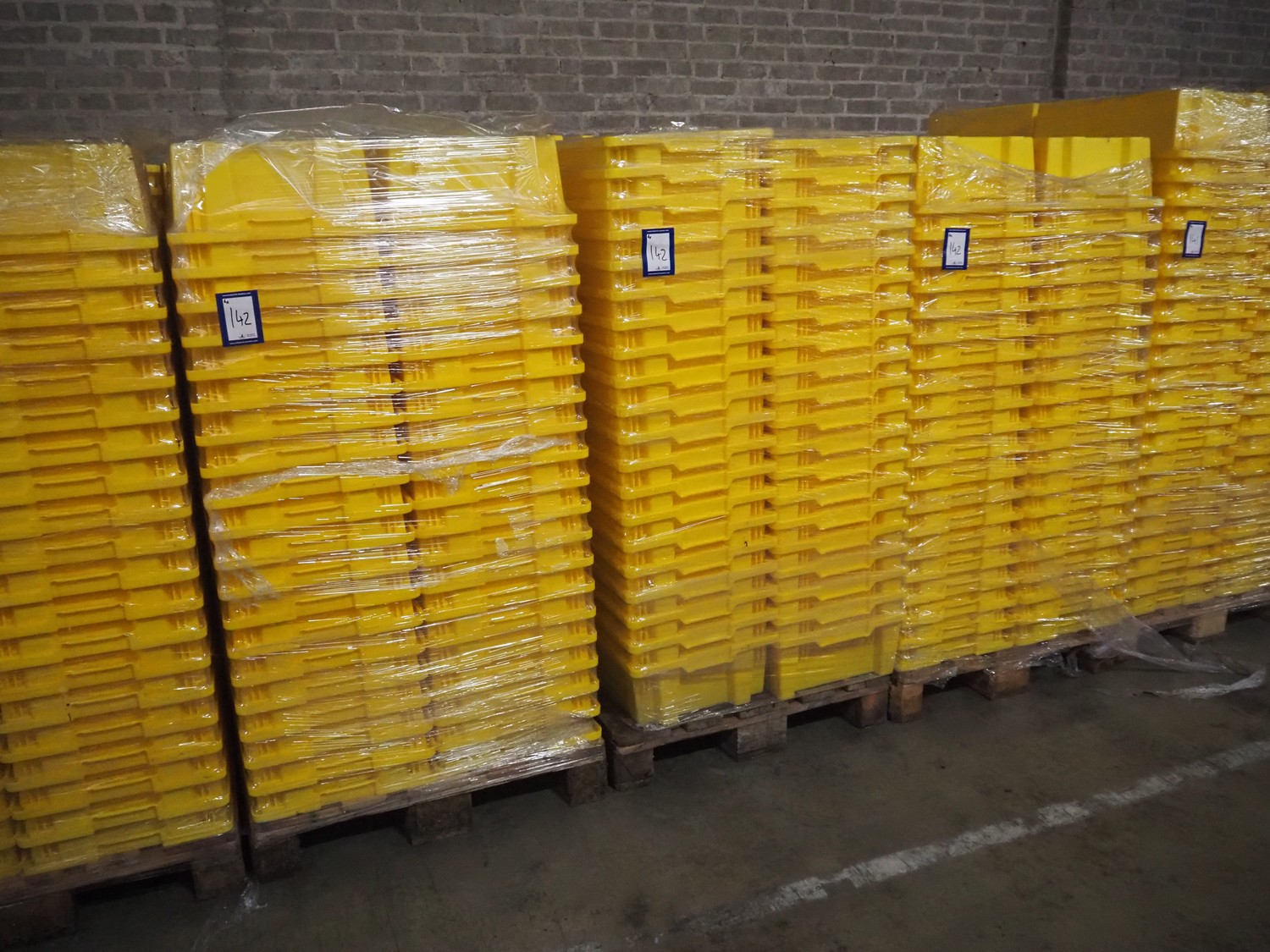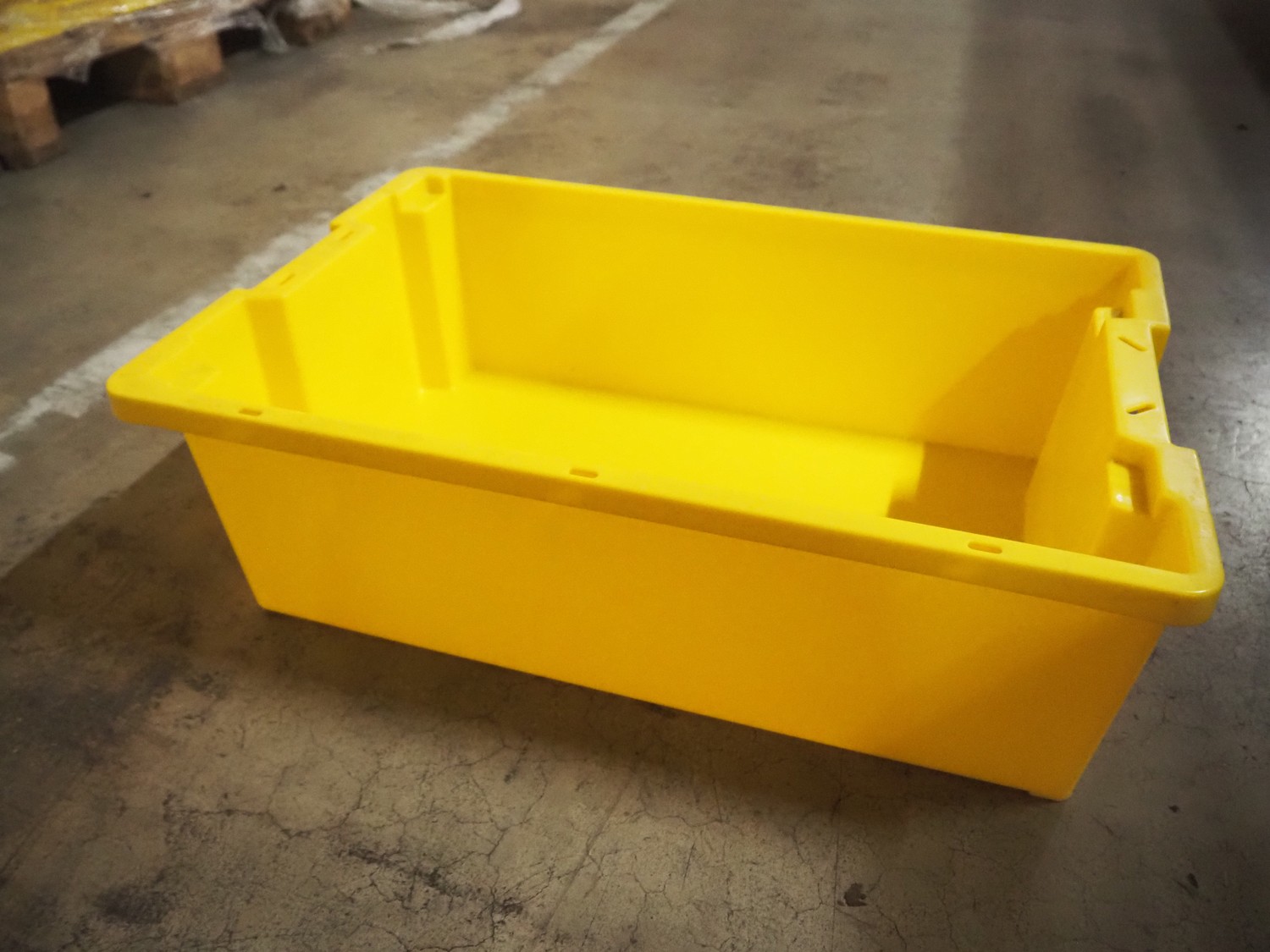 6 pallets with approximately 480 plastic crates, crate dimensions: 400 mm x 600 mm x 180 mm.