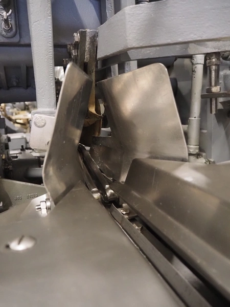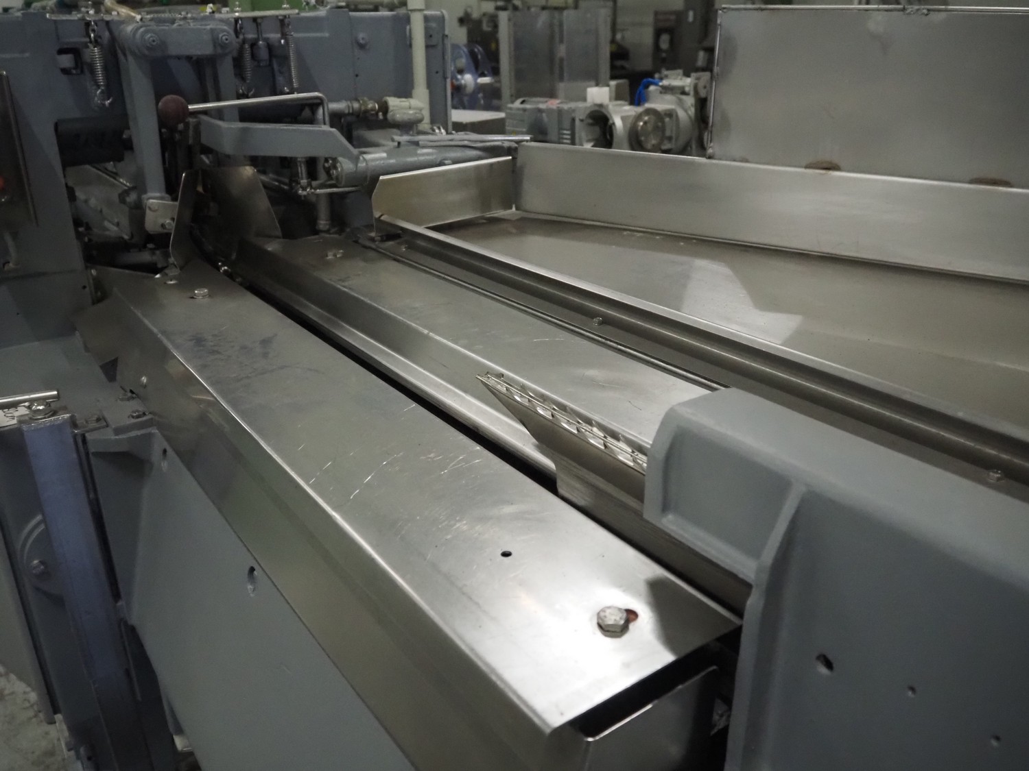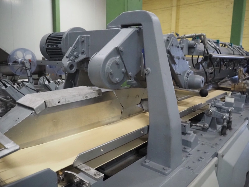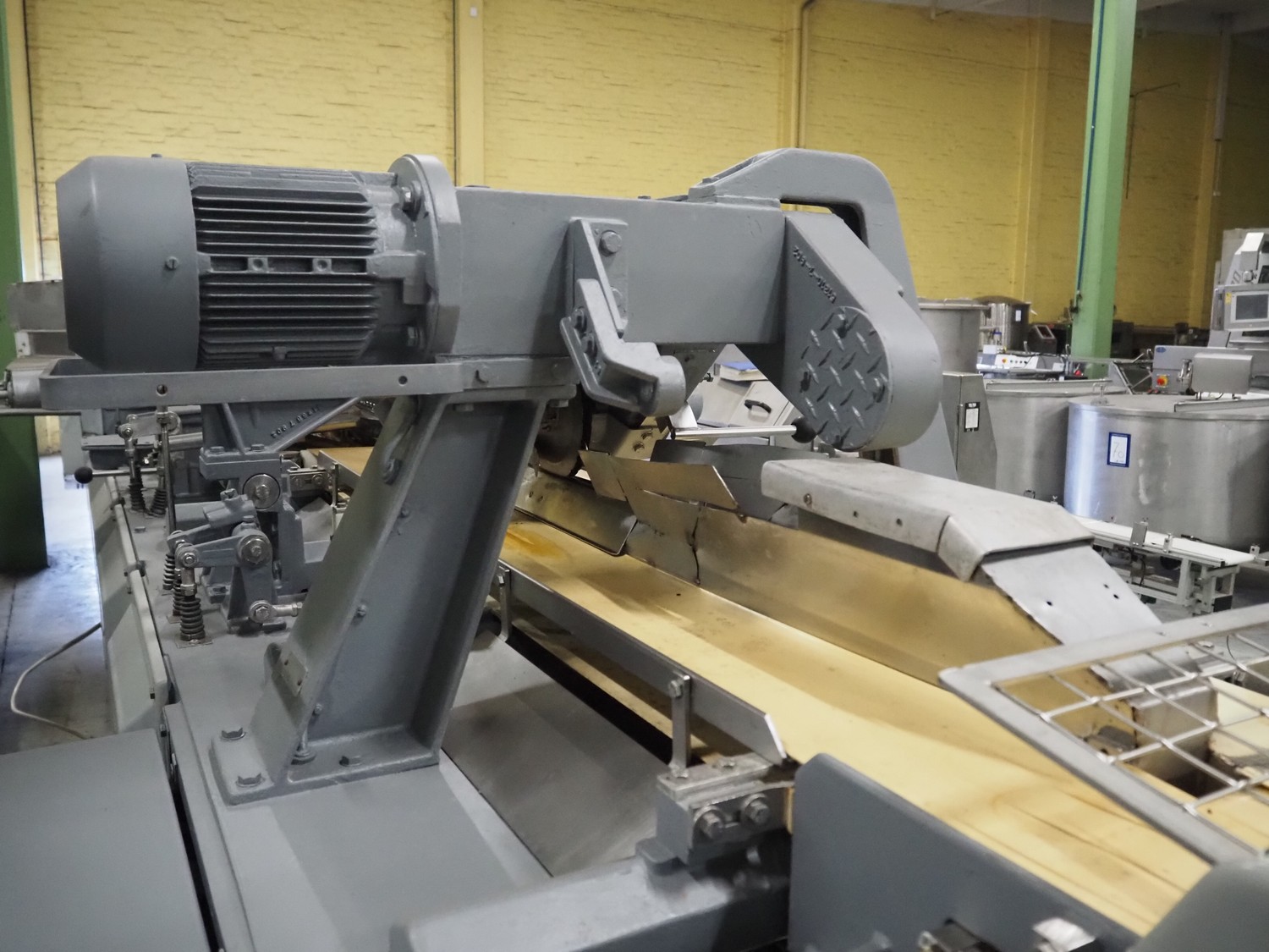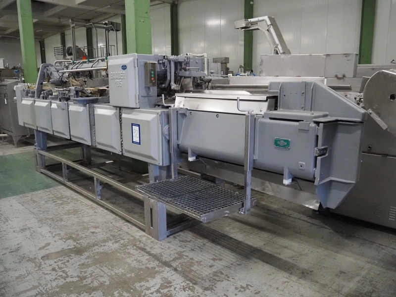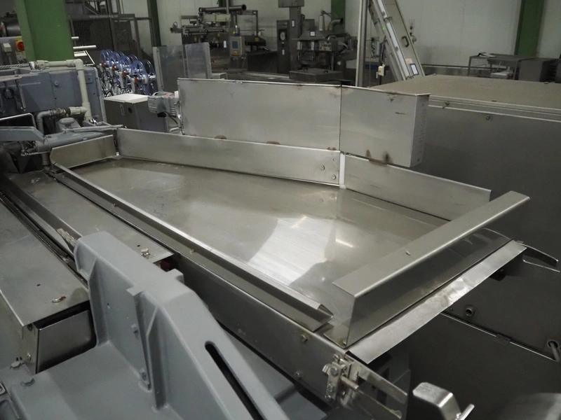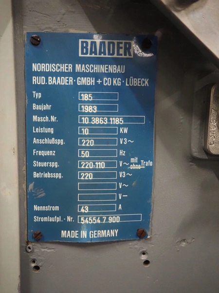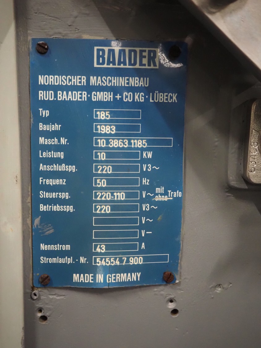 Baader whitefish filleting machine, type: 185, machine number: 10 3863 1185, year of construction: 1983, 220 V, 3 Ph, 50 Hz, 43 A, 10 kW, plastic belt, belt width: (2x) 160 mm, s/s mesh outfeed belt, belt width: 365 mm, total dimensions: 7000 mm x 1400 mm x 1900 mm.