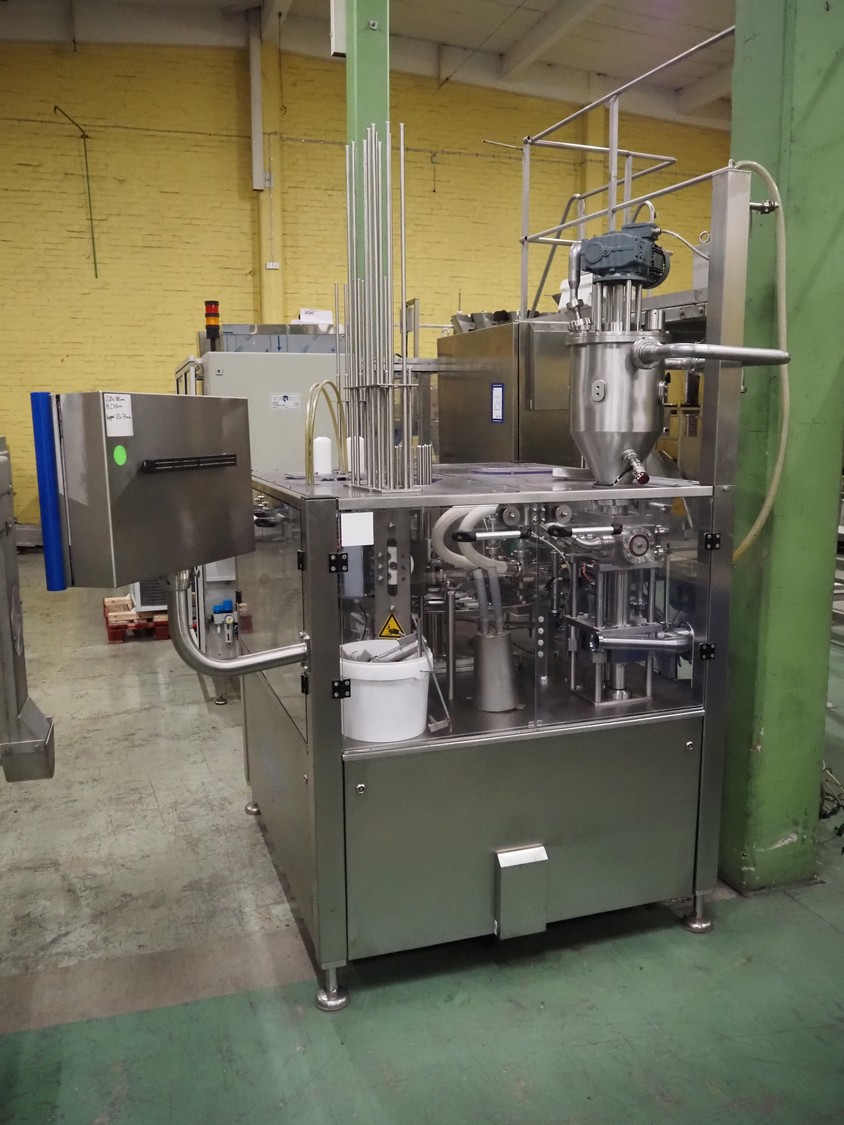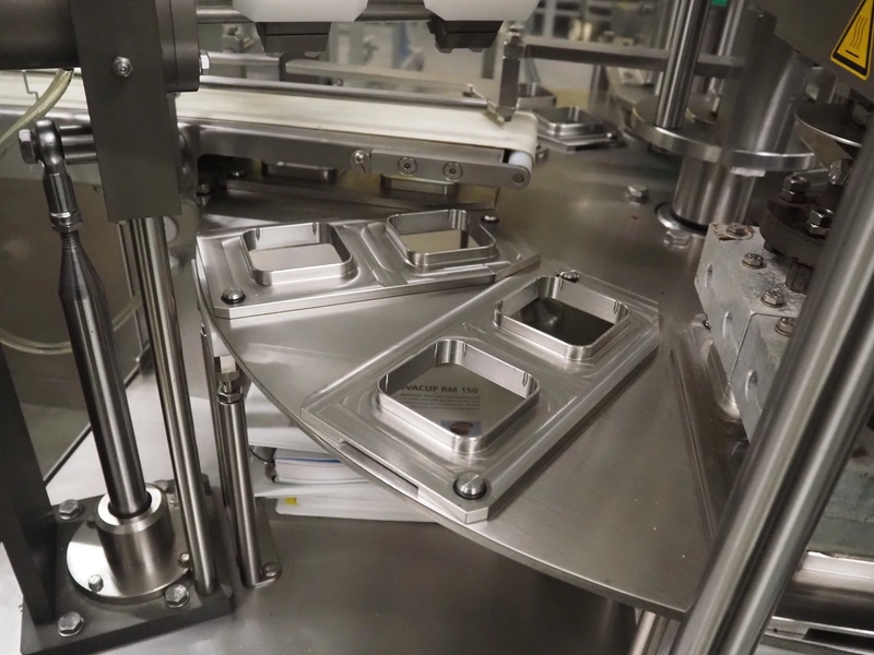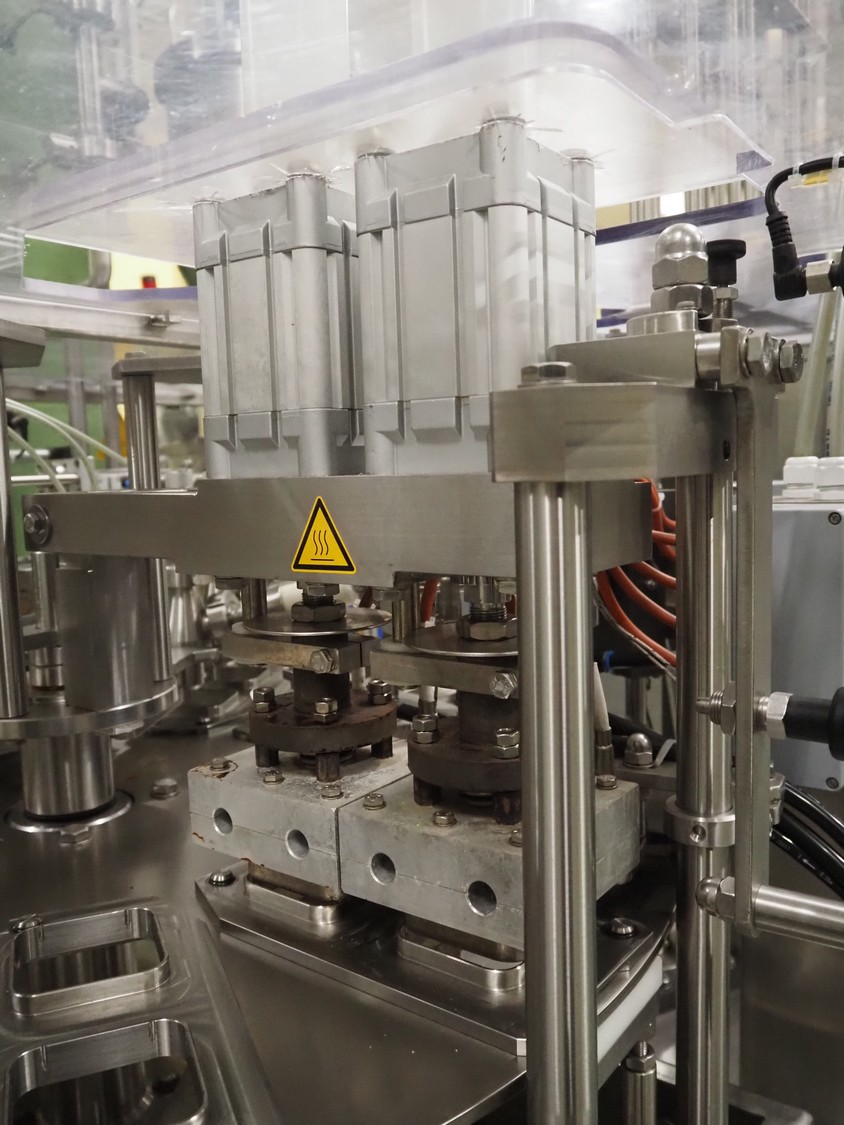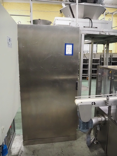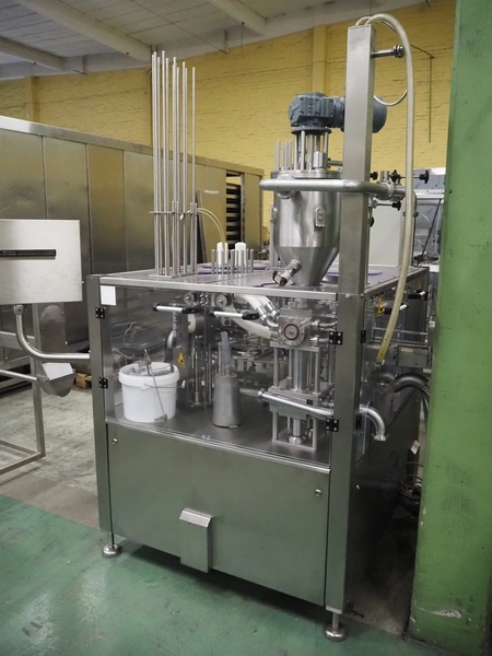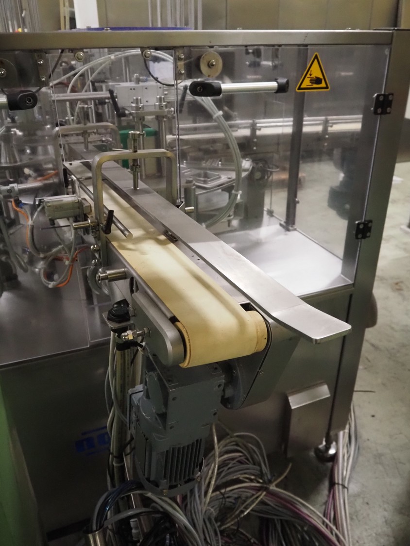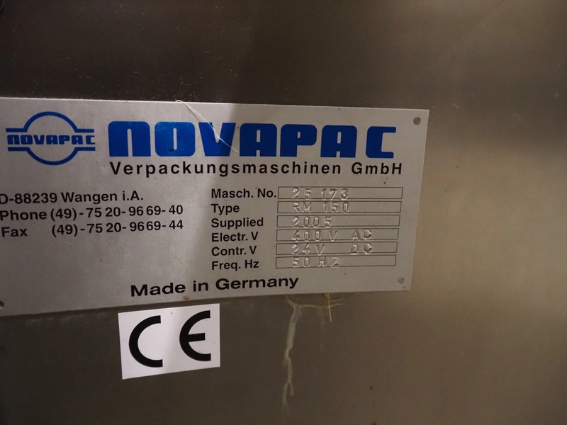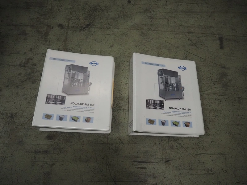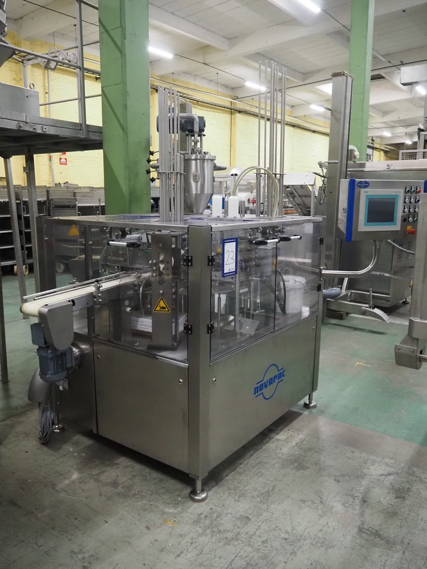 Novapac cup filling and sealing machine, type: RM 150, machine number: 25 178, year of construction: 2005, 400 V, 50 Hz, denester: 85 mm x 85 mm, dyes: (2x) 72 mm x 72 mm, plastic belt, belt width: (2x) 100 mm, total dimensions: 2400 mm x 2350 mm x 2370 mm. S/s switch cabinet, dimensions: 1000 mm x 400 mm x 2150 mm, s/s control panel, dimensions: 800 mm x 350 mm x 800 mm.