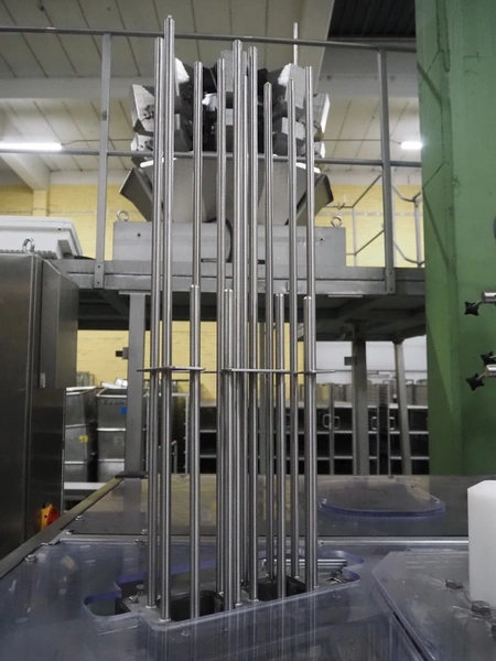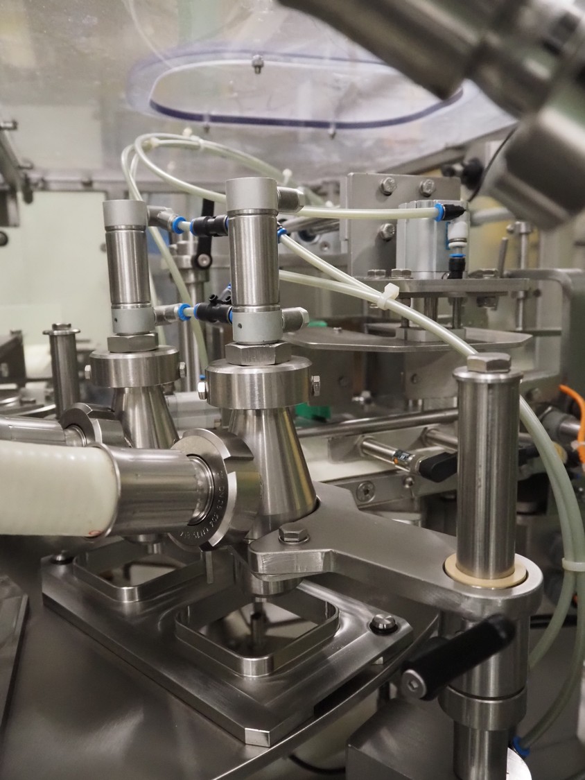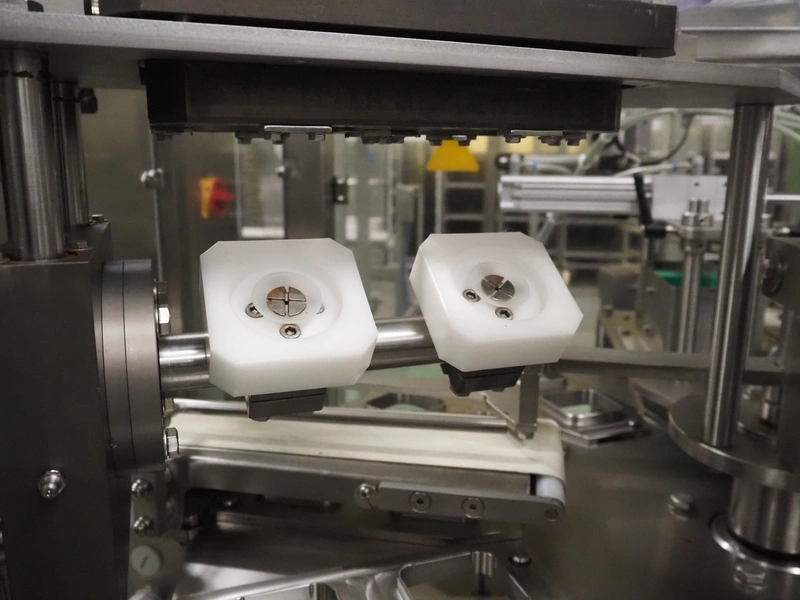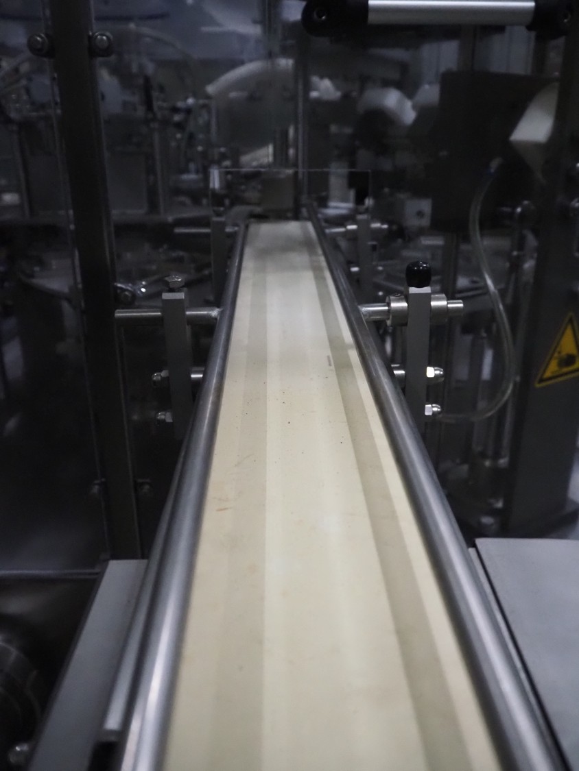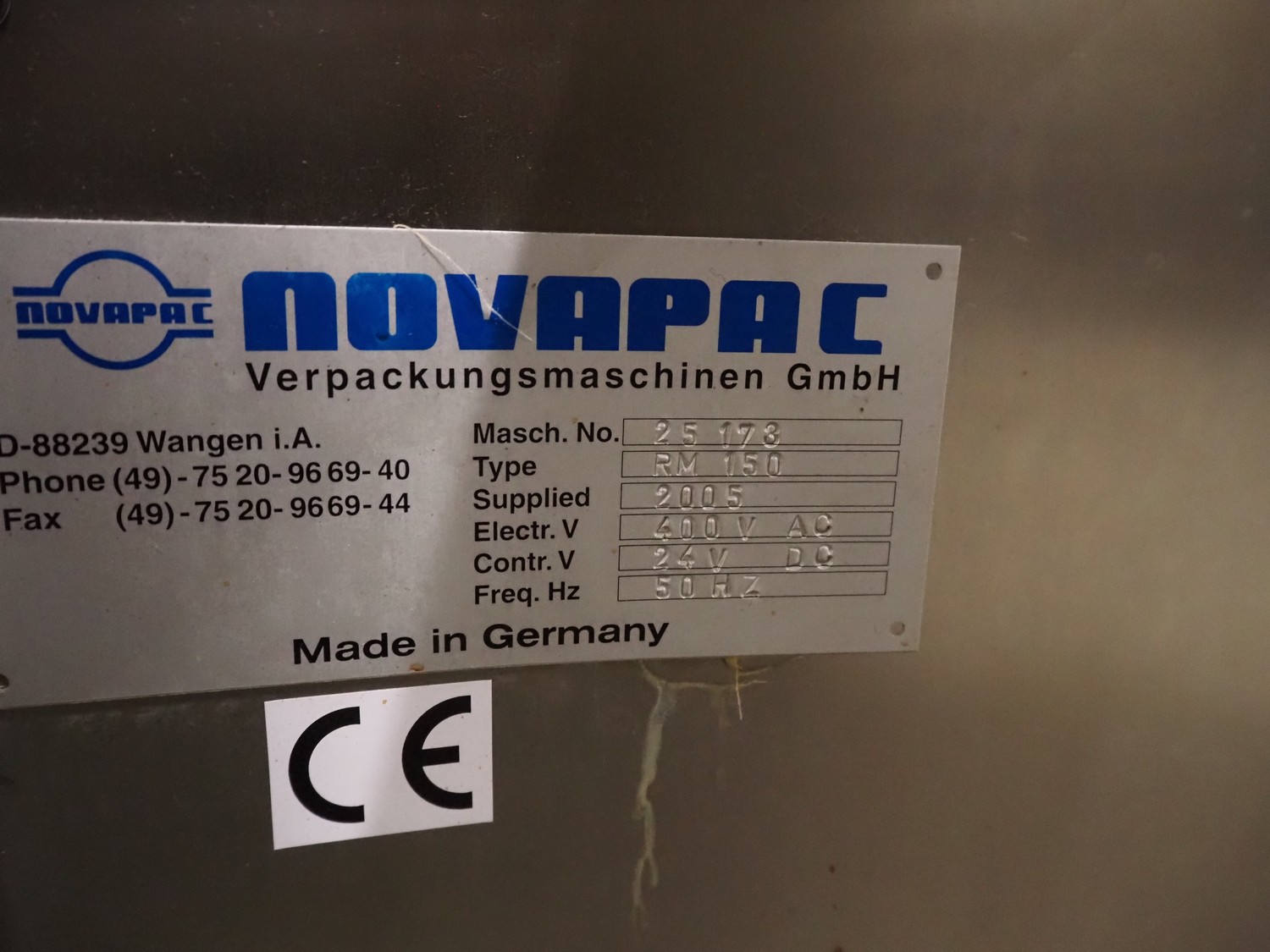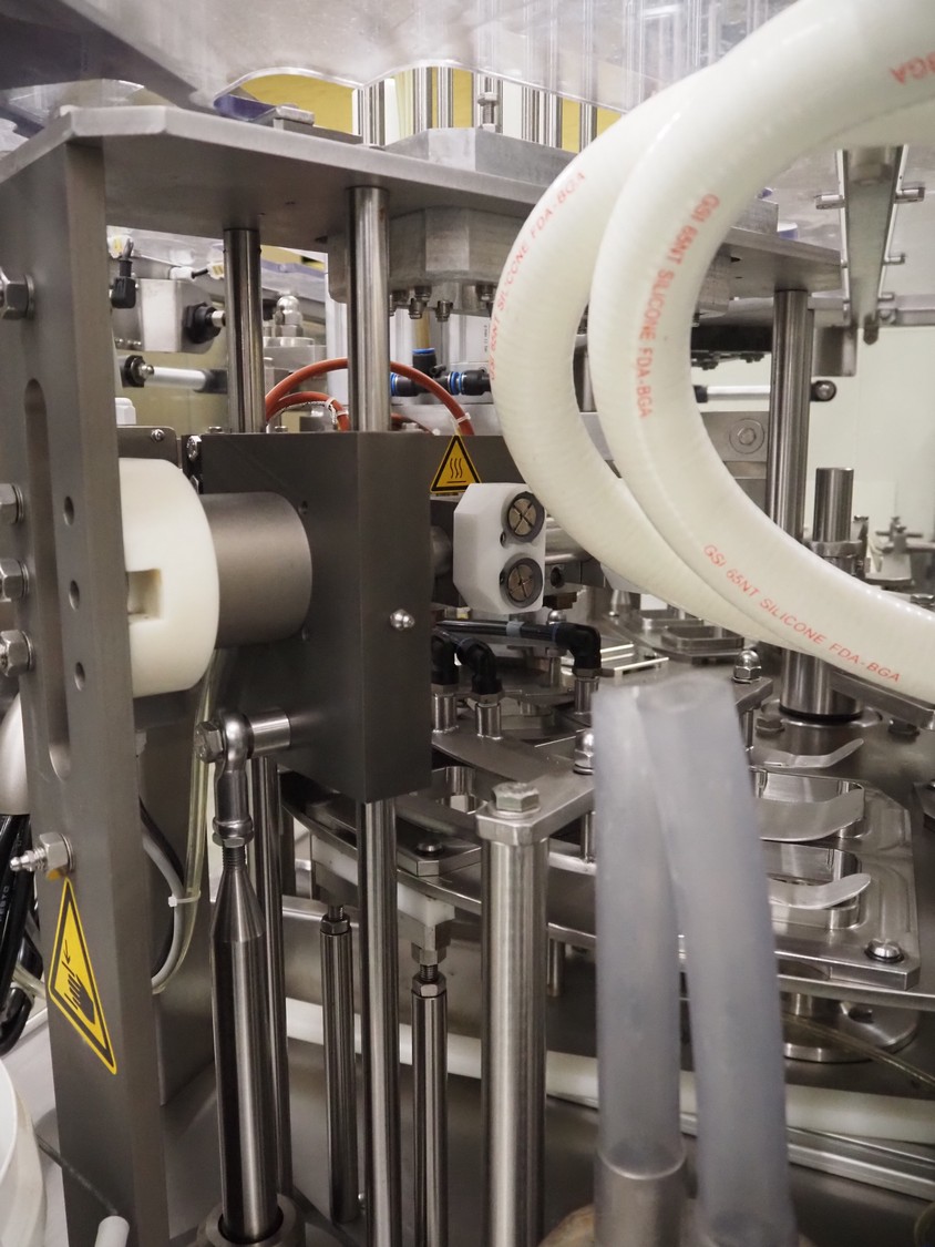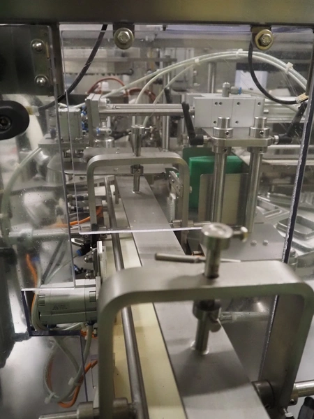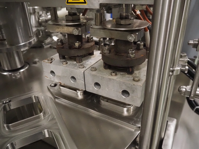Novapac cup filling and sealing machine, type: RM 150, machine number: 25 178, year of construction: 2005, 400 V, 50 Hz, denester: 85 mm x 85 mm, dyes: (2x) 72 mm x 72 mm, plastic belt, belt width: (2x) 100 mm, total dimensions: 2400 mm x 2350 mm x 2370 mm. S/s switch cabinet, dimensions: 1000 mm x 400 mm x 2150 mm, s/s control panel, dimensions: 800 mm x 350 mm x 800 mm.