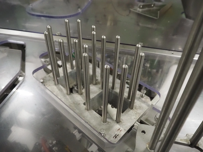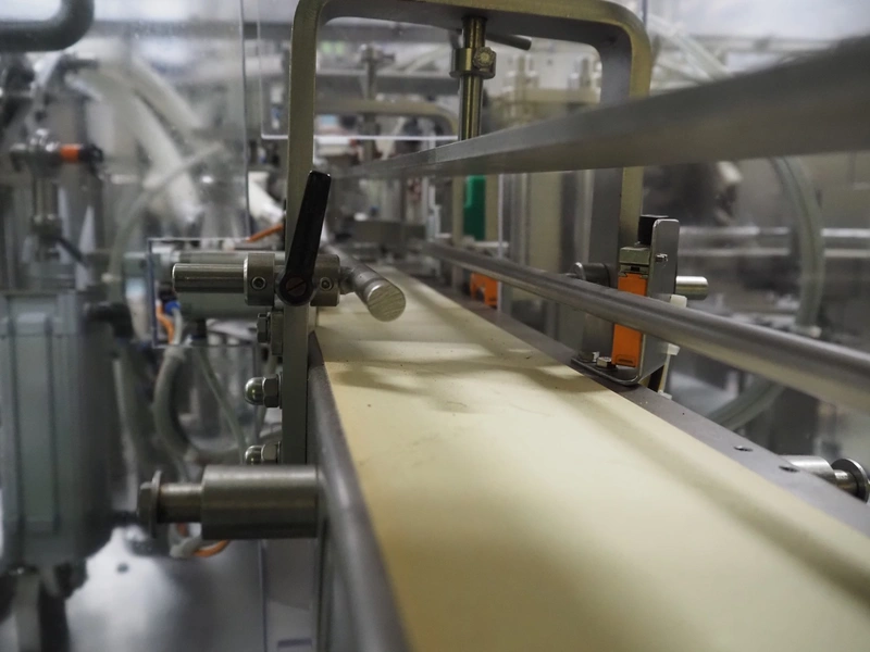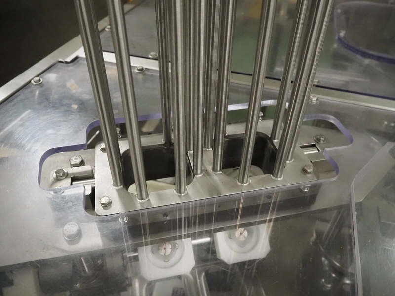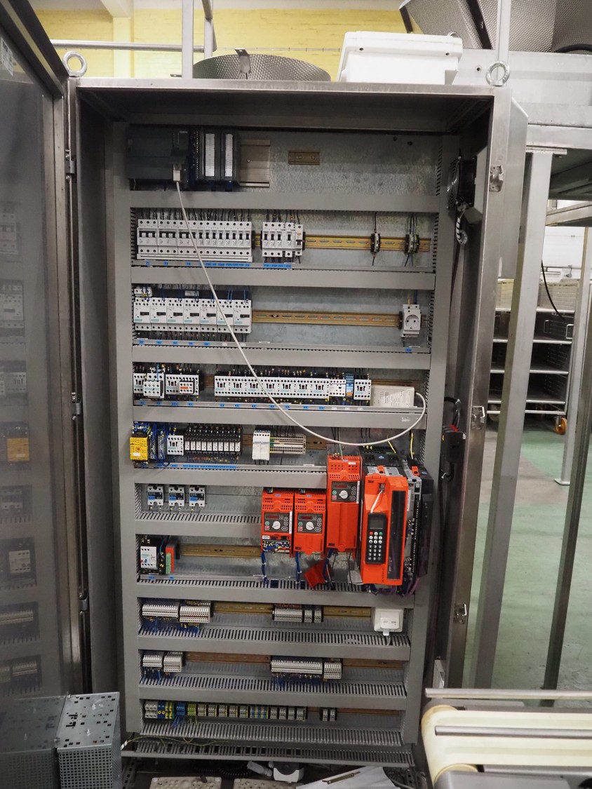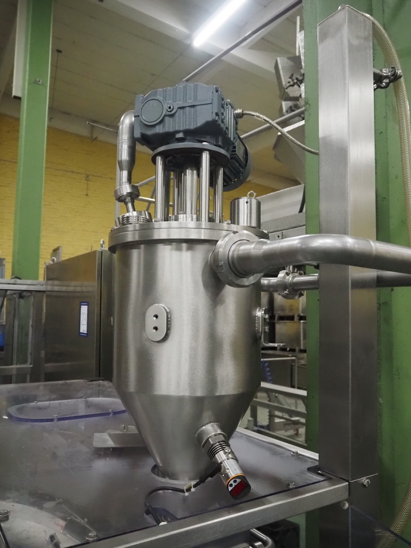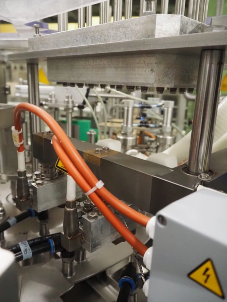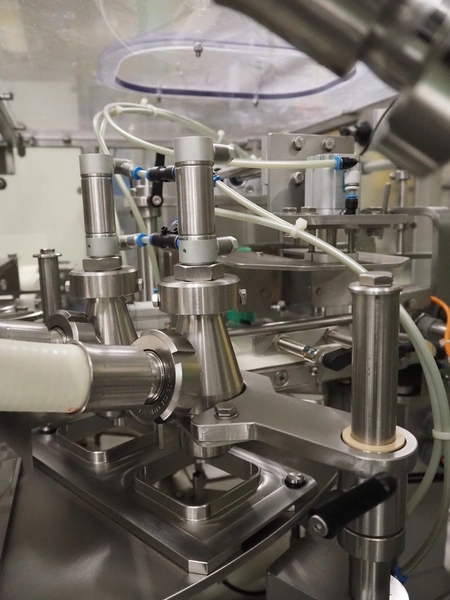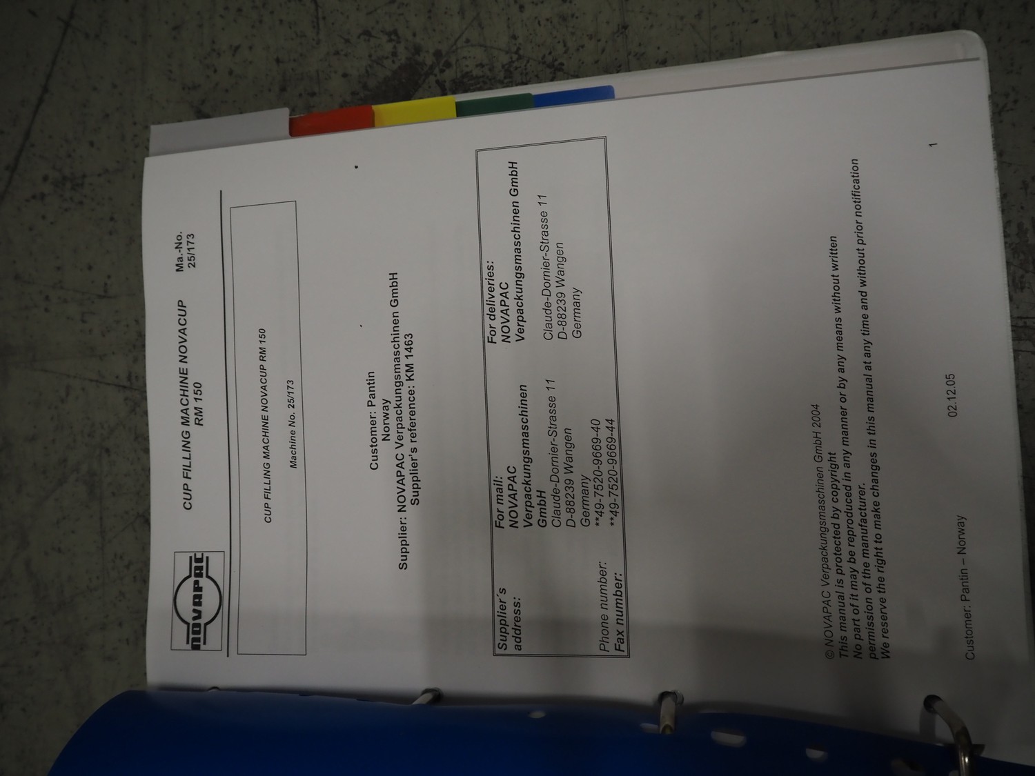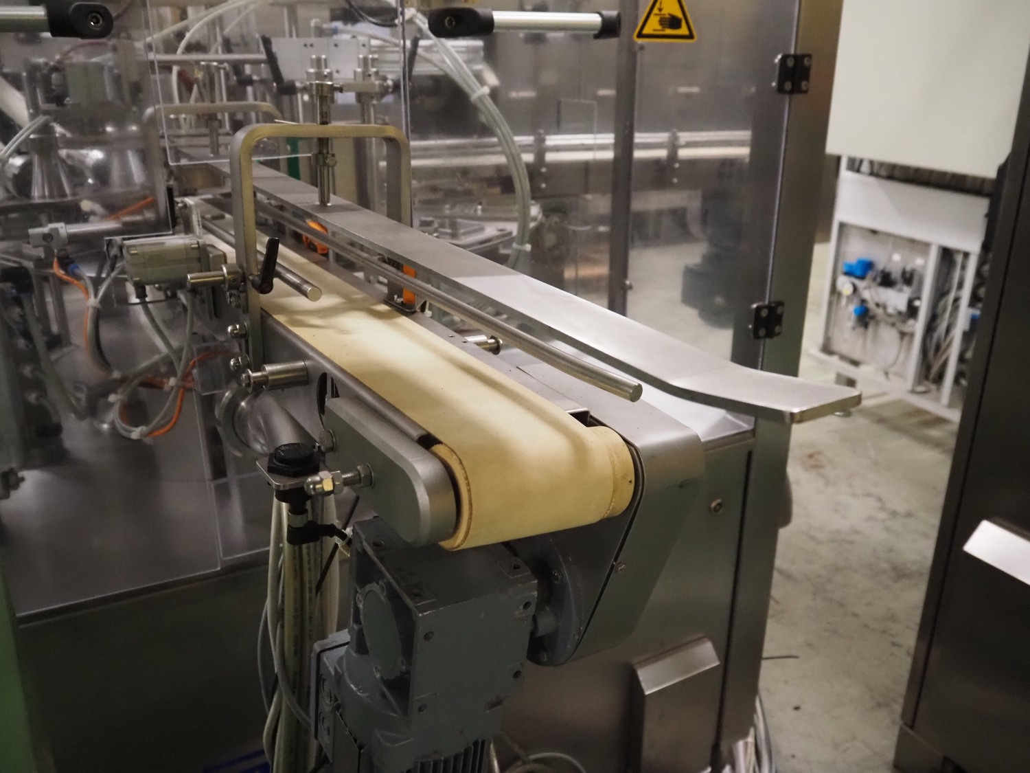 Novapac cup filling and sealing machine, type: RM 150, machine number: 25 178, year of construction: 2005, 400 V, 50 Hz, denester: 85 mm x 85 mm, dyes: (2x) 72 mm x 72 mm, plastic belt, belt width: (2x) 100 mm, total dimensions: 2400 mm x 2350 mm x 2370 mm. S/s switch cabinet, dimensions: 1000 mm x 400 mm x 2150 mm, s/s control panel, dimensions: 800 mm x 350 mm x 800 mm.