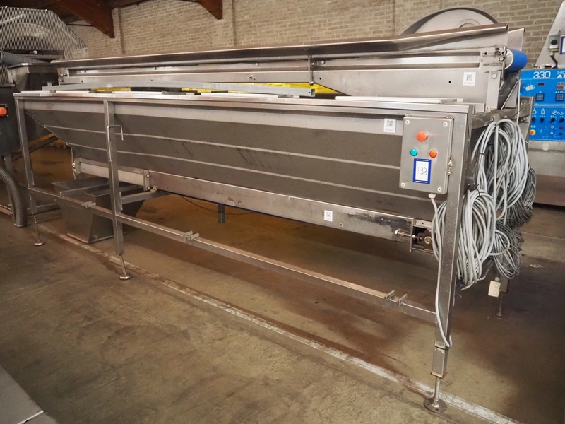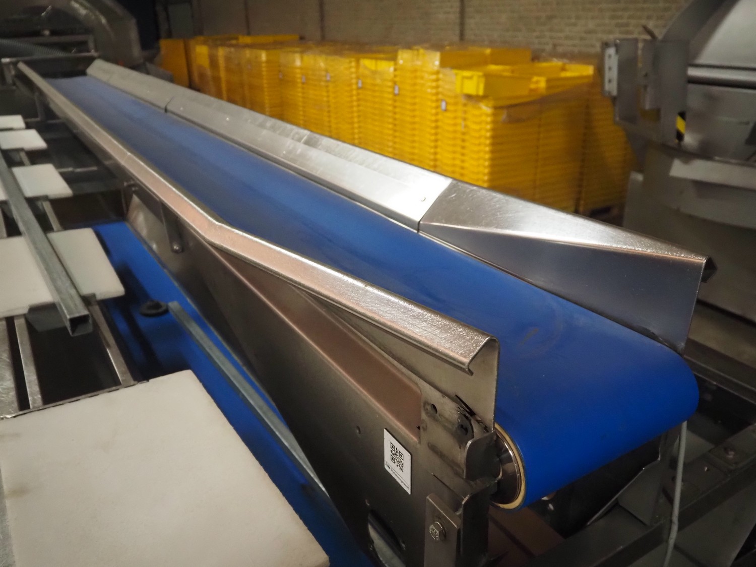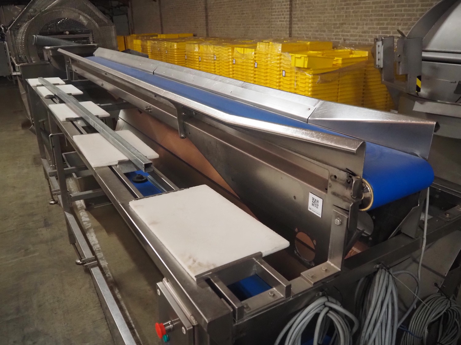 Sorting belt, s/s frame, 2x 5 stations, 2 plastic belts, belt width: 340 mm and 250 mm, total dimensions: 4070 mm x 1250 mm x 1710 mm.