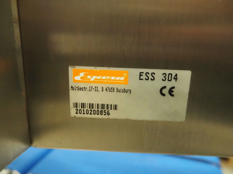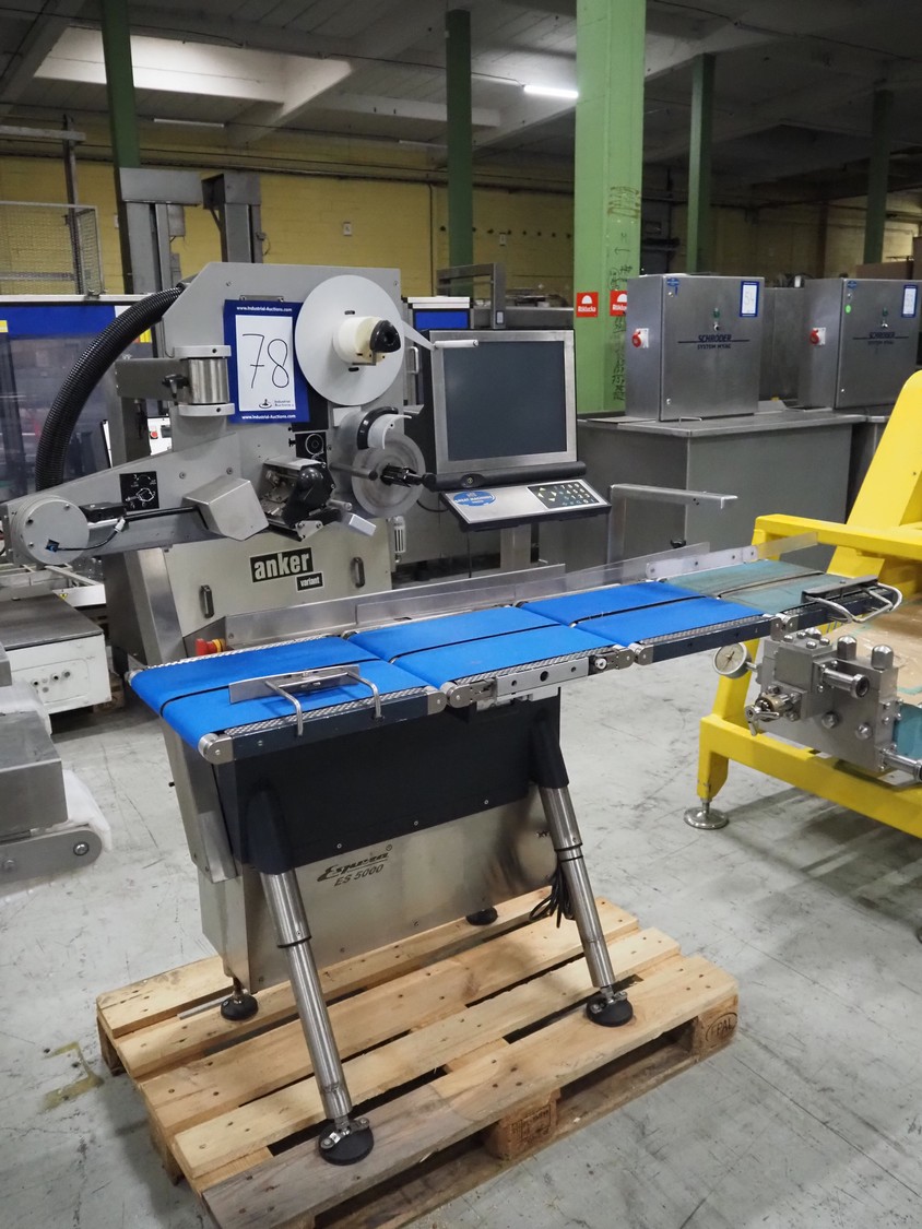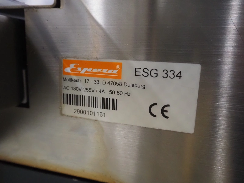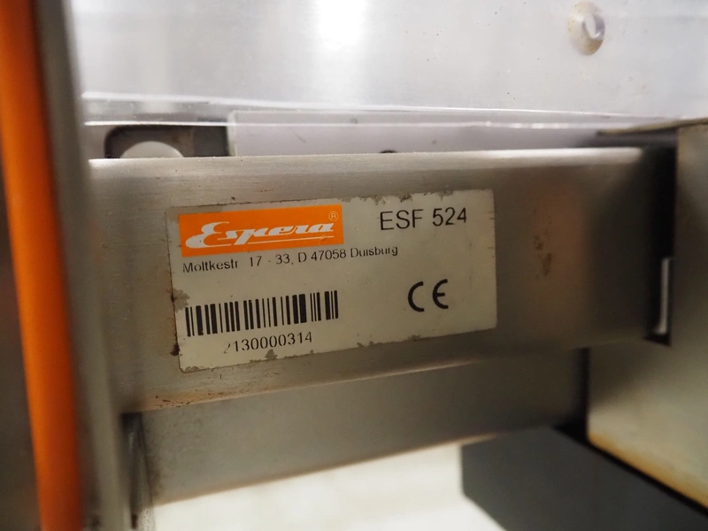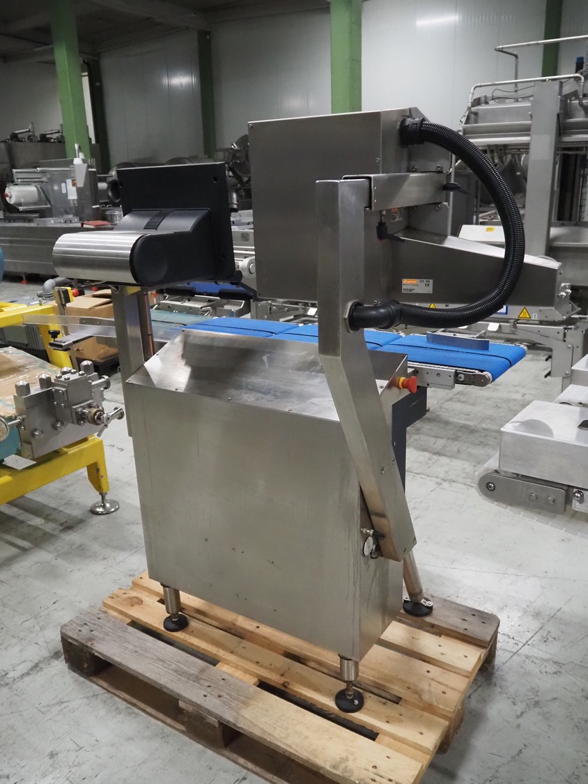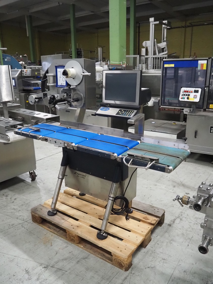 Espera checkweigher with top labeller, type machine: ES 5000, type checkweigher: ESW 2514, maximum weight: 6 kg, minimum weight: 40 gram, e = 2 gram, T = -6000 kg, type labeller, type: ESG 334, plastic belt, belt width: (2x) 150 mm, total dimensions: 1500 mm x 900 mm x 1500 mm.