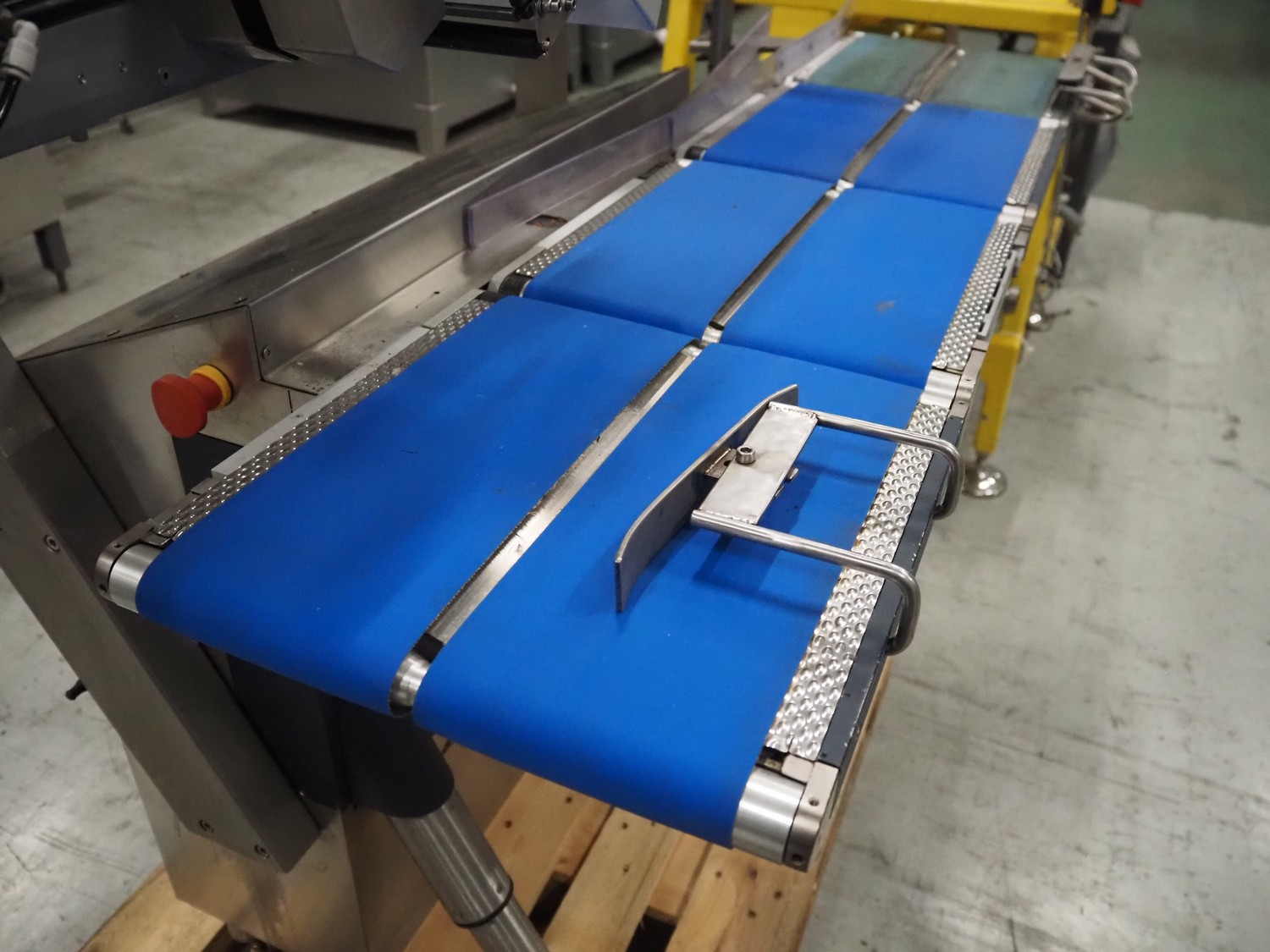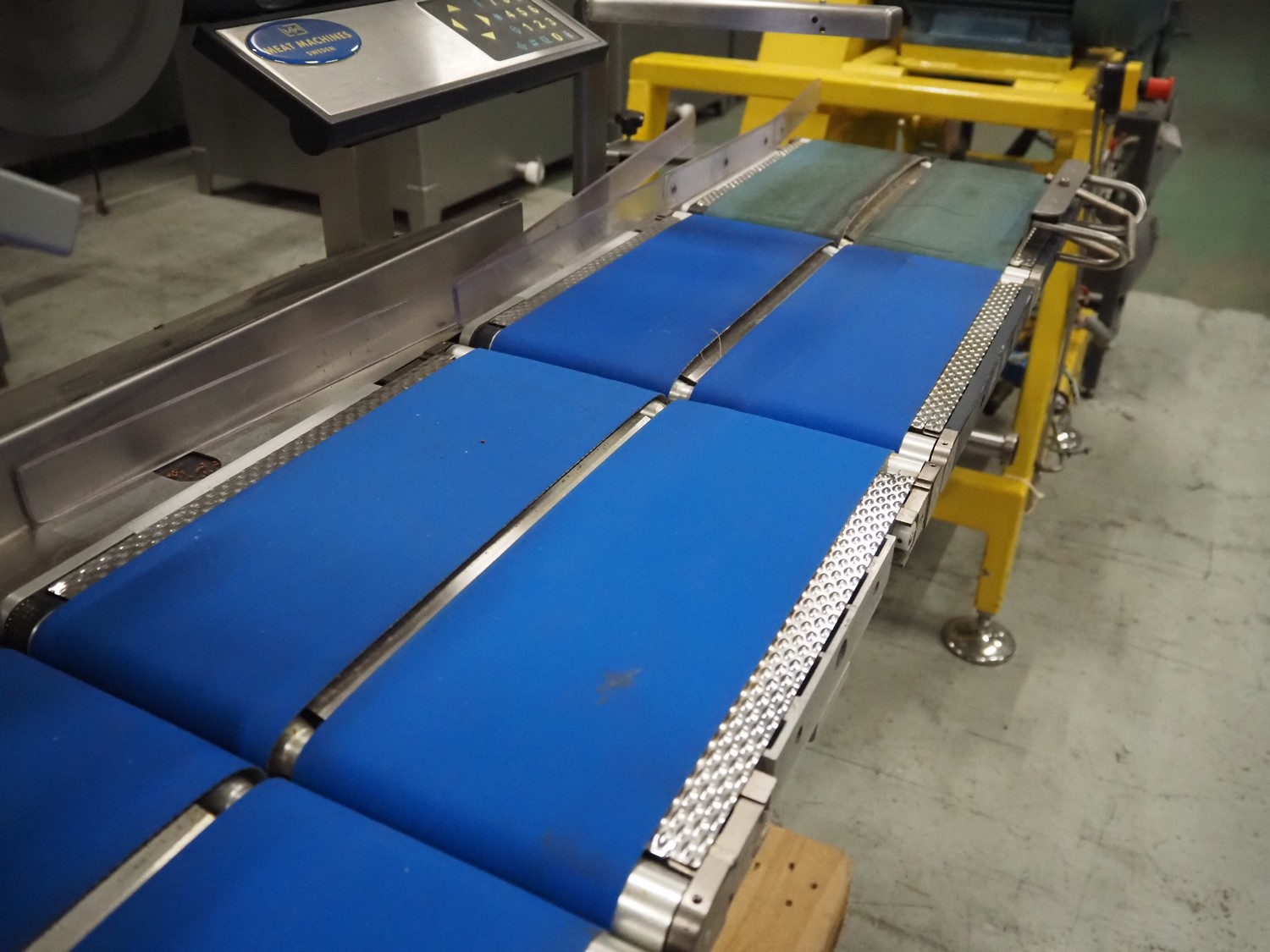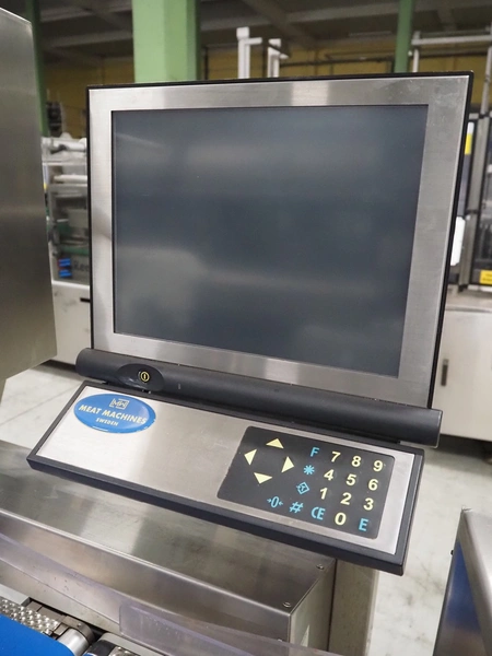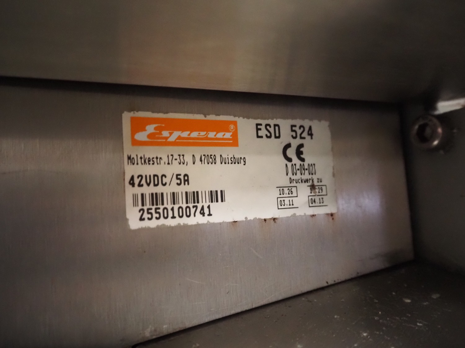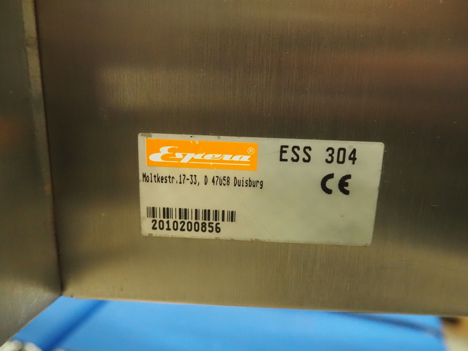 Espera checkweigher with top labeller, type machine: ES 5000, type checkweigher: ESW 2514, maximum weight: 6 kg, minimum weight: 40 gram, e = 2 gram, T = -6000 kg, type labeller, type: ESG 334, plastic belt, belt width: (2x) 150 mm, total dimensions: 1500 mm x 900 mm x 1500 mm.