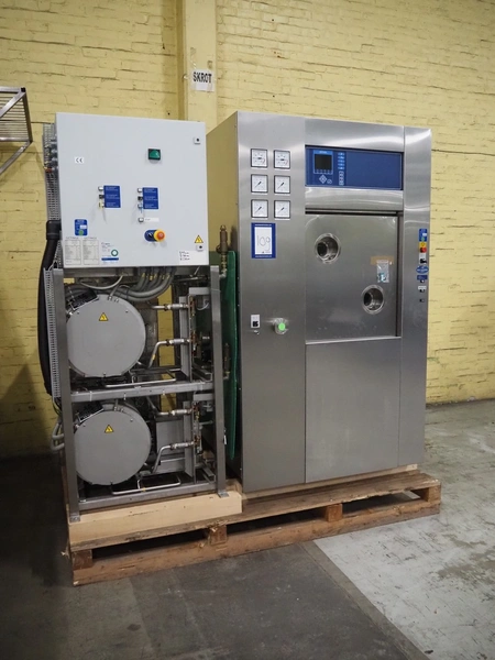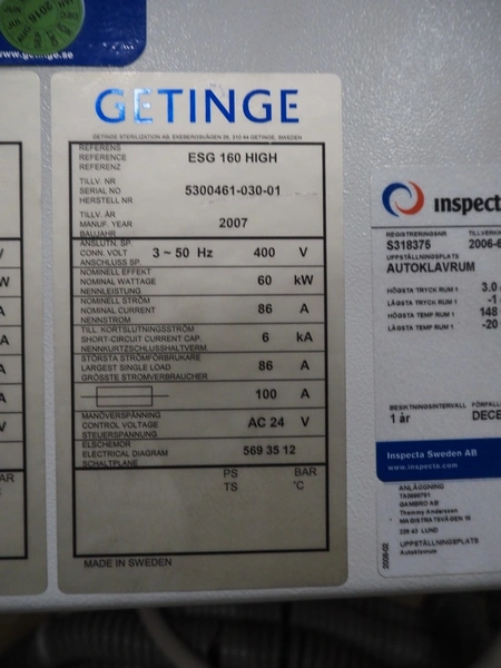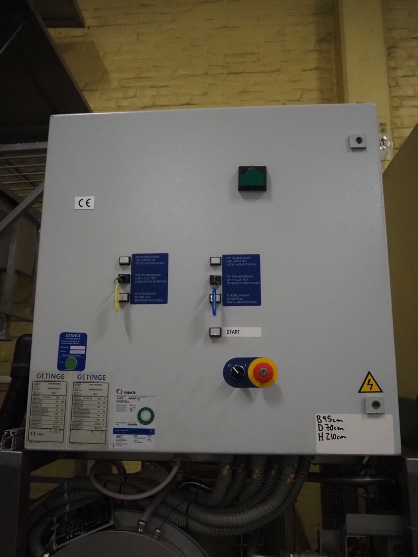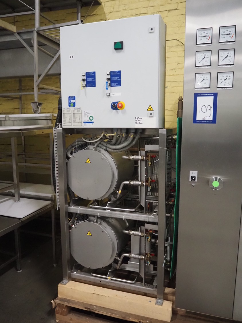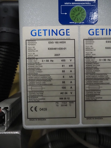 Getinge Sterilization AB autoclave with steam generator, model: GEVC 6712 AC-1, serial number: 5300461-010-01, year of construction: 2002, 400 V, 3 Ph, 50 Hz, 11 A, 5 kW, dimensions autoclave: 1860 mm x 1280 mm x 2240 mm, dimensions steam generator: 900 mm x 730 mm x 2060 mm, dimensions s/s trolley: 1450 mm x 570 mm x 1050 mm.