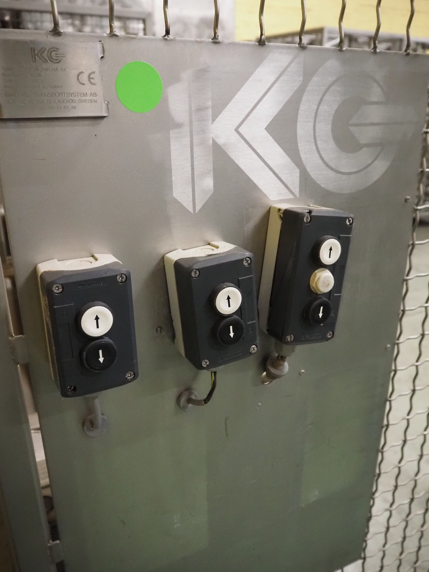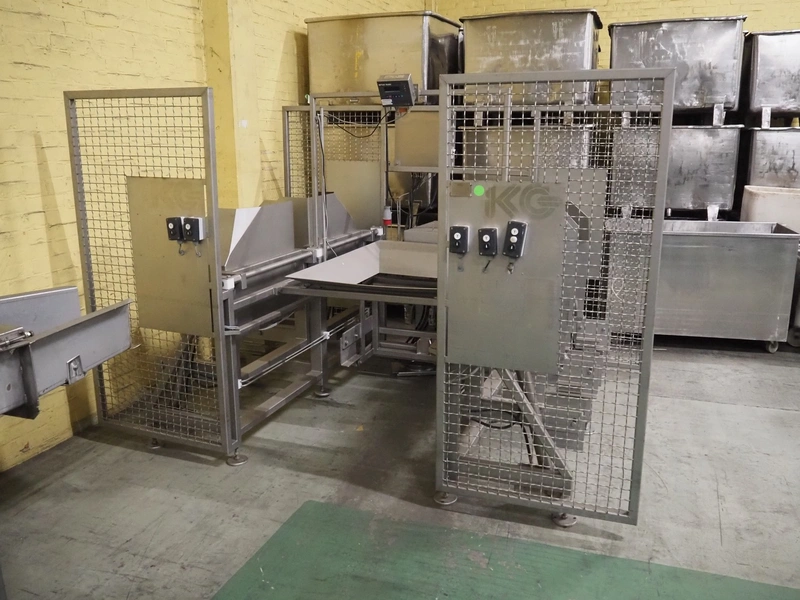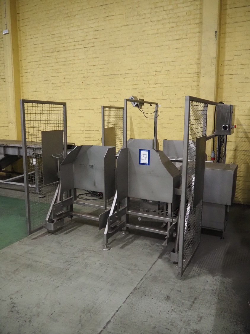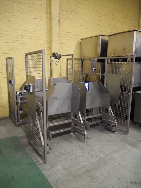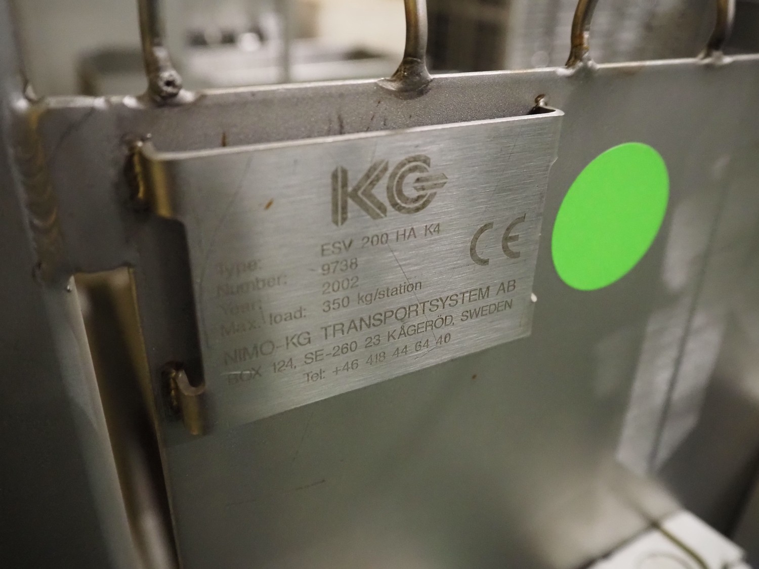 Nimo-KG transportsystem AB batching station with 4 tilting stations for 200 liter meat bins, type: ESV 200 HA K4, number: 9738, year of construction: 2002, maximum load: 350 kg per station, dimensions: 2400 mm x 2850 mm x 1950 mm.