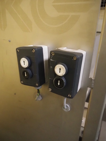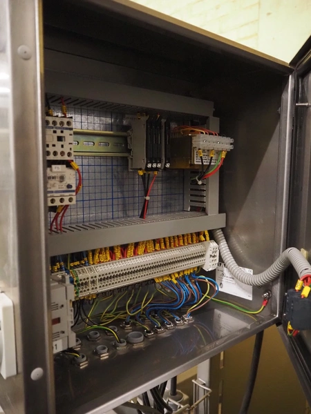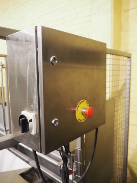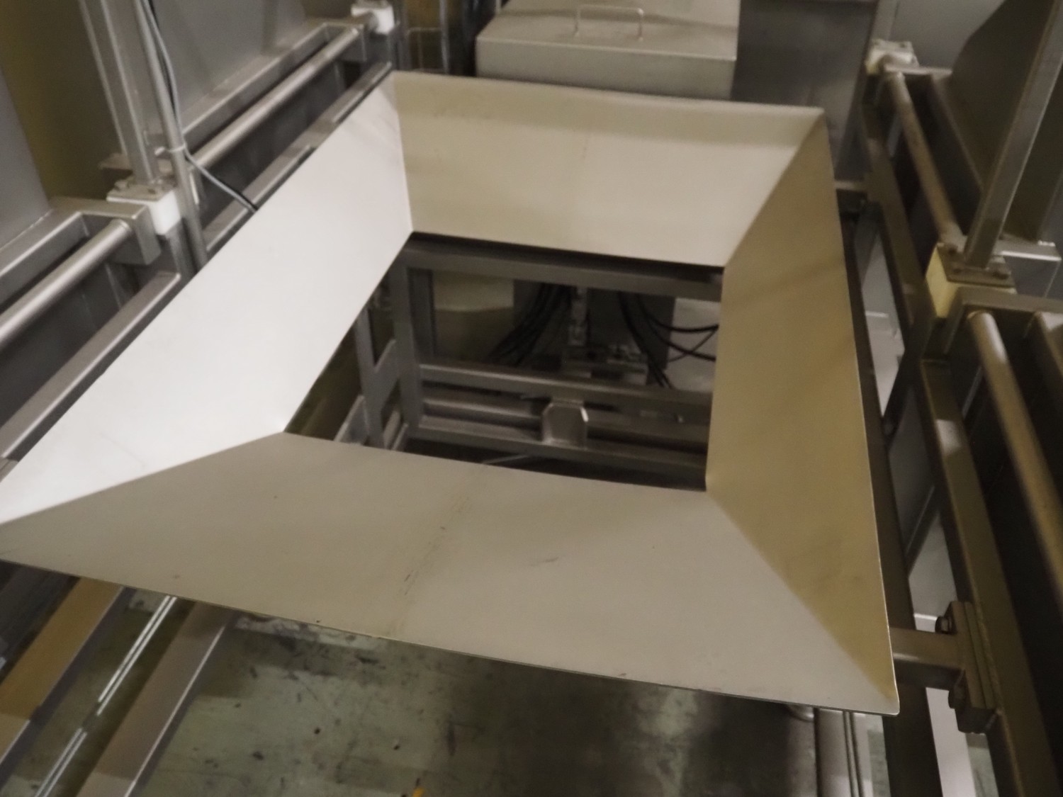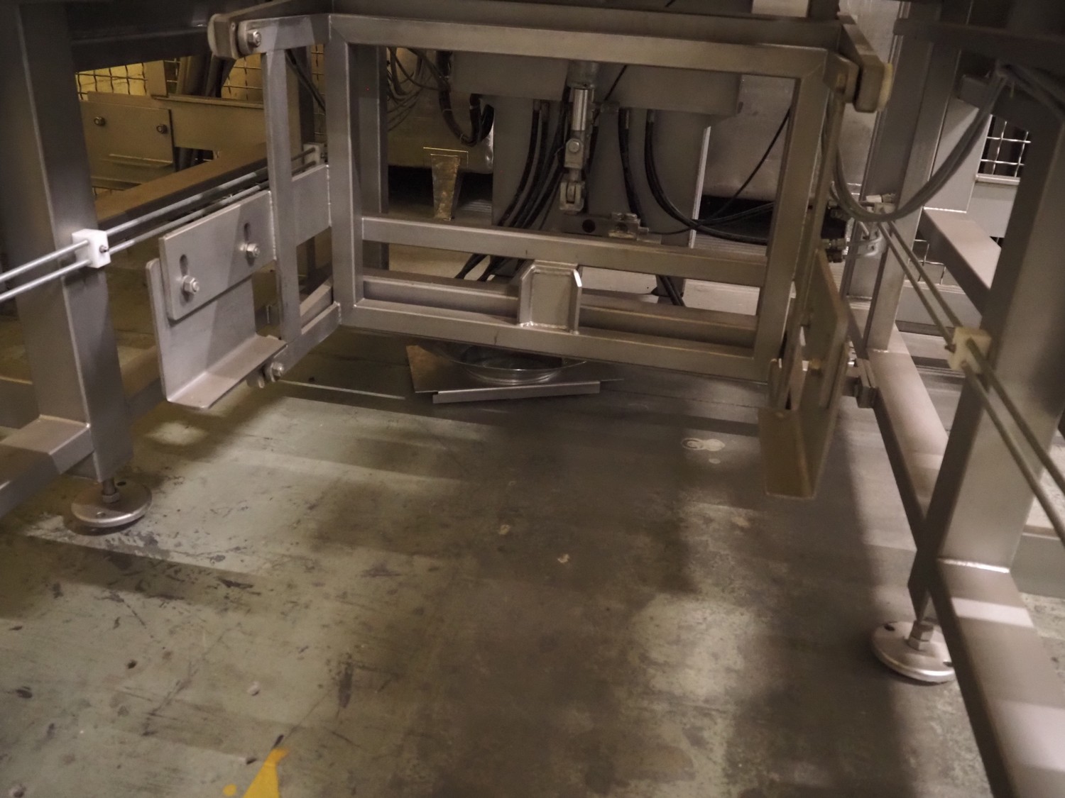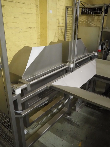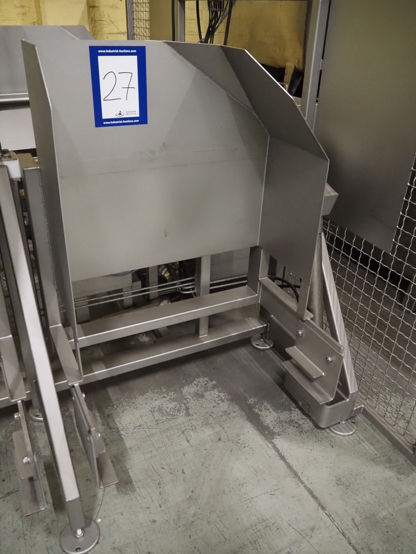 Nimo-KG transportsystem AB batching station with 4 tilting stations for 200 liter meat bins, type: ESV 200 HA K4, number: 9738, year of construction: 2002, maximum load: 350 kg per station, dimensions: 2400 mm x 2850 mm x 1950 mm.