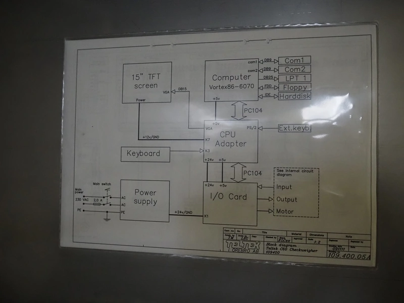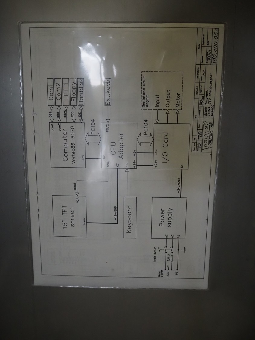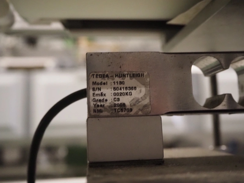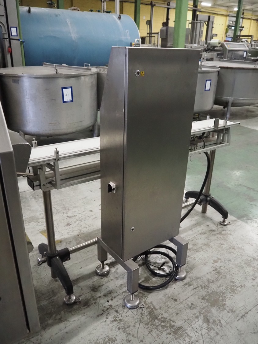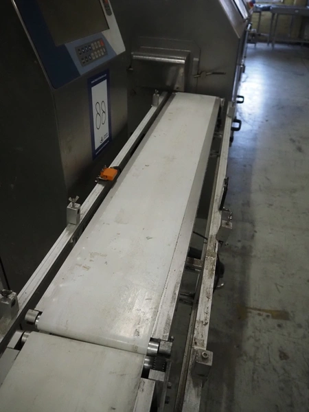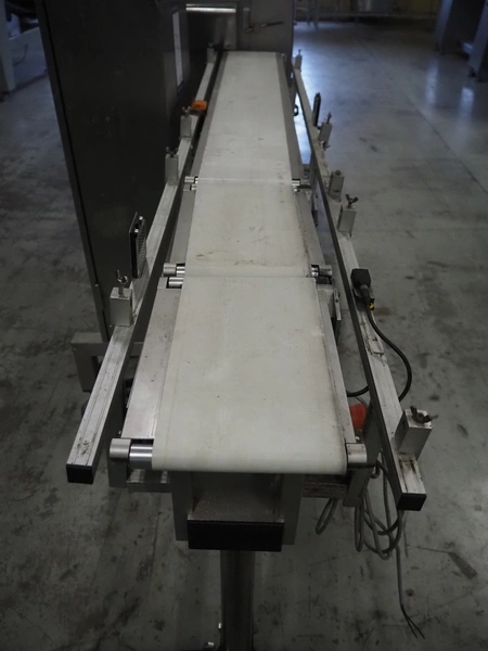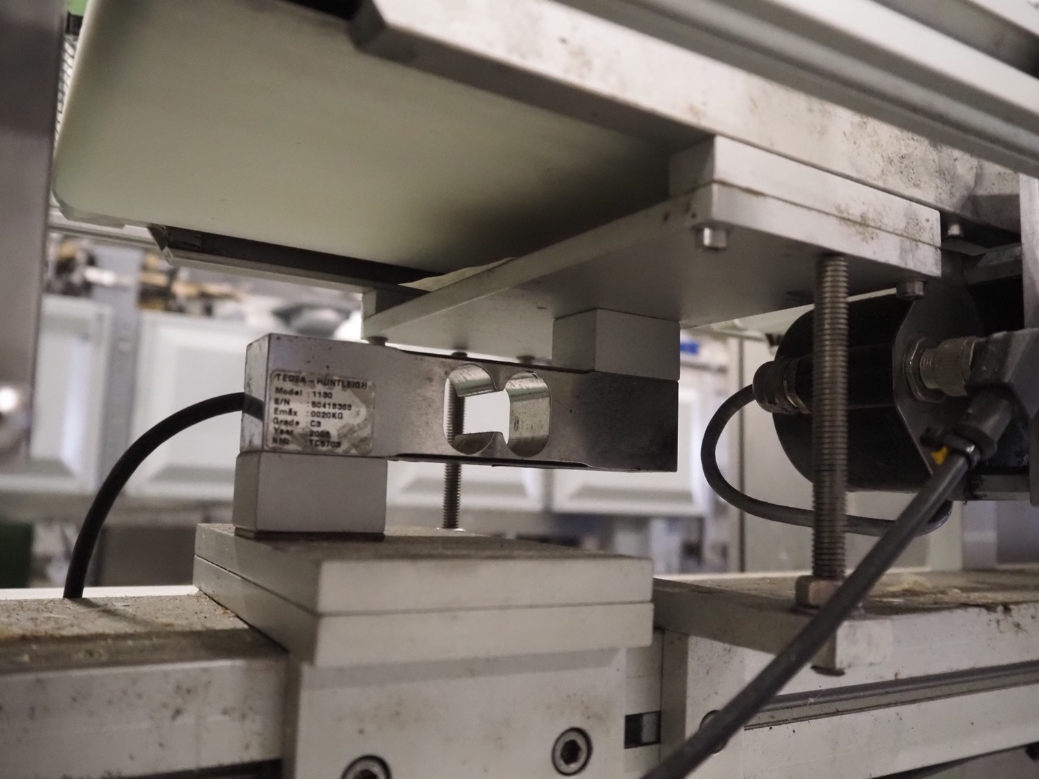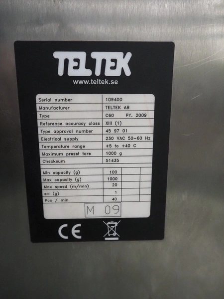 Teltek checkweigher, type: C60, serial number: 109400, year of construction: 2009, 230 V, 50-60 Hz, minimum weight: 100 gram, maximum weight: 1000 kg, e= 1 gram, pcs/min: 40, plastic belt, belt width: 160 mm, dimensions control unit: 450 mm x 270 mm x 1450 mm, dimensions belt: 1750 mm x 550 mm x 900 mm.