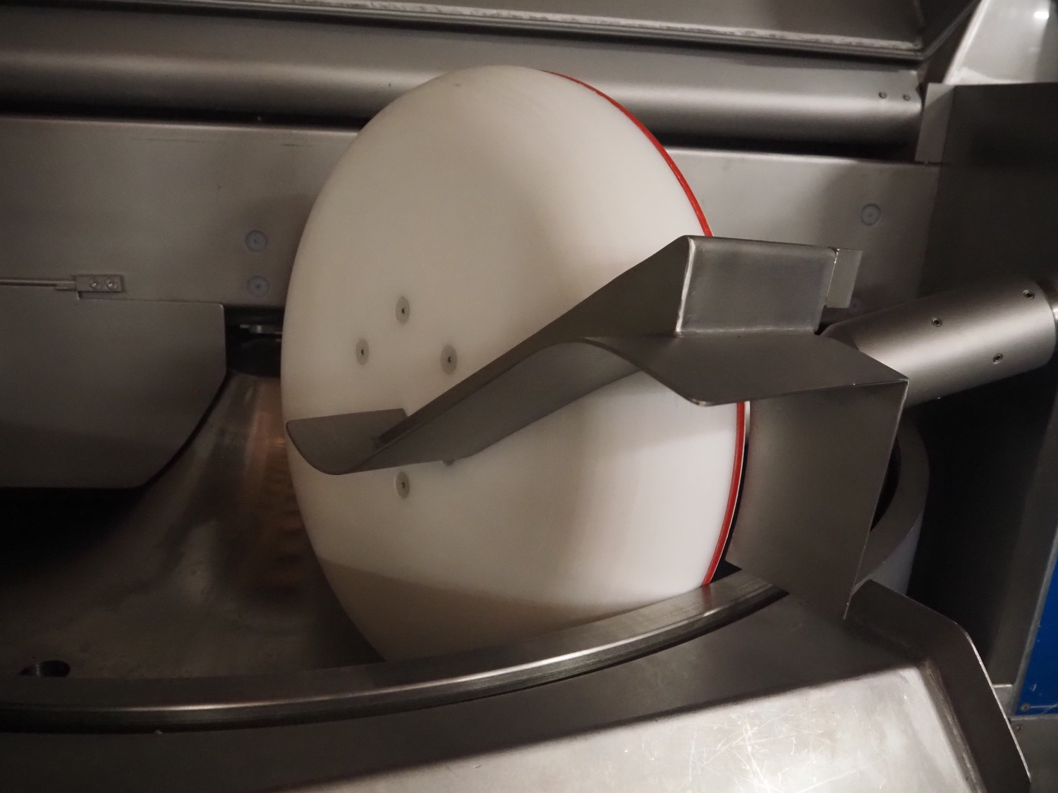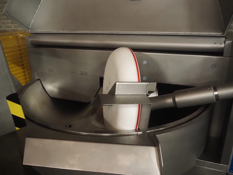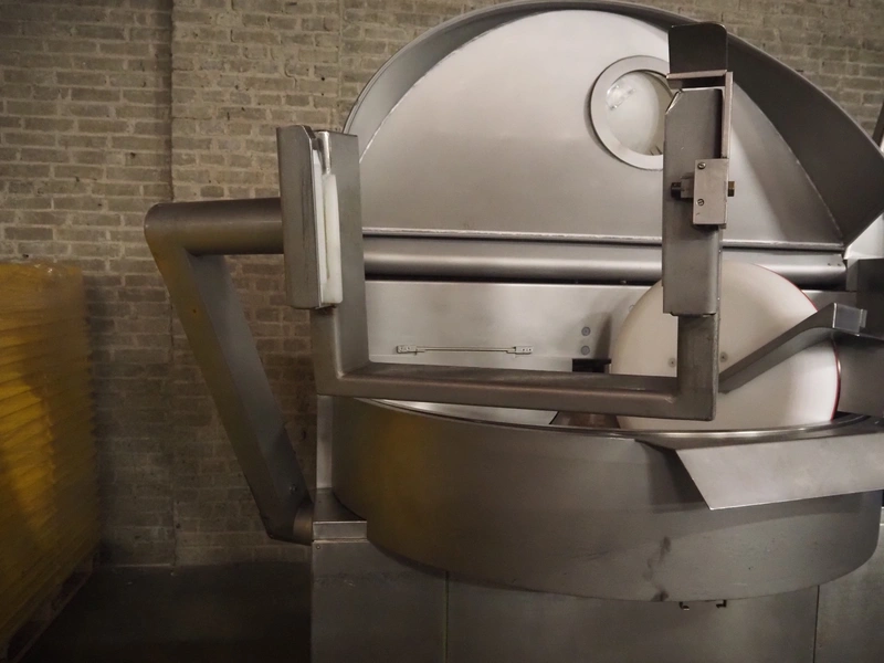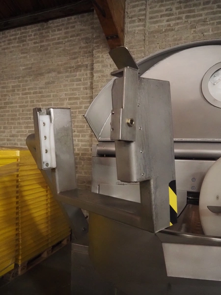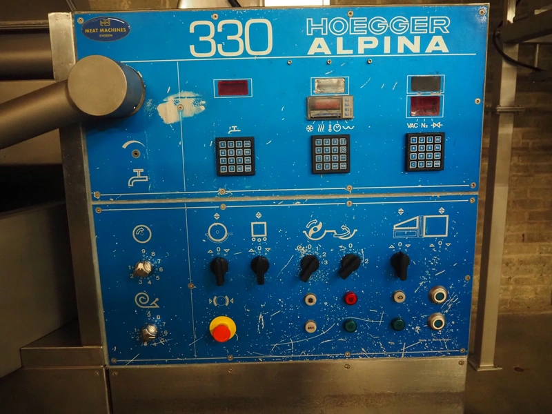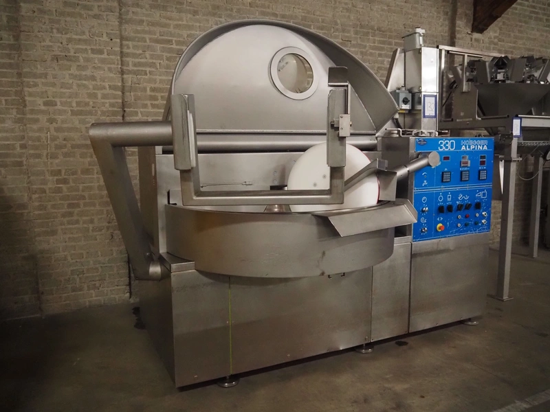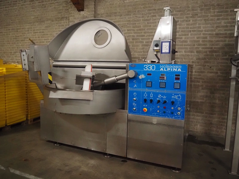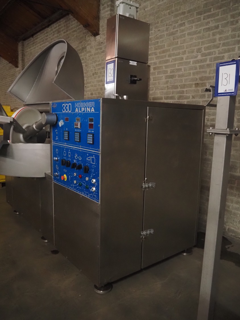 Hoegger Alpina AG cutter with lifter for 200 liter meat bins and ejector, type: PBV 330 1110, serial number: 813017, 220/380 V, 110 kW, 150 bar, volume: 330 liter, dimensions: 3300 mm x 2200 mm x 1600 mm.