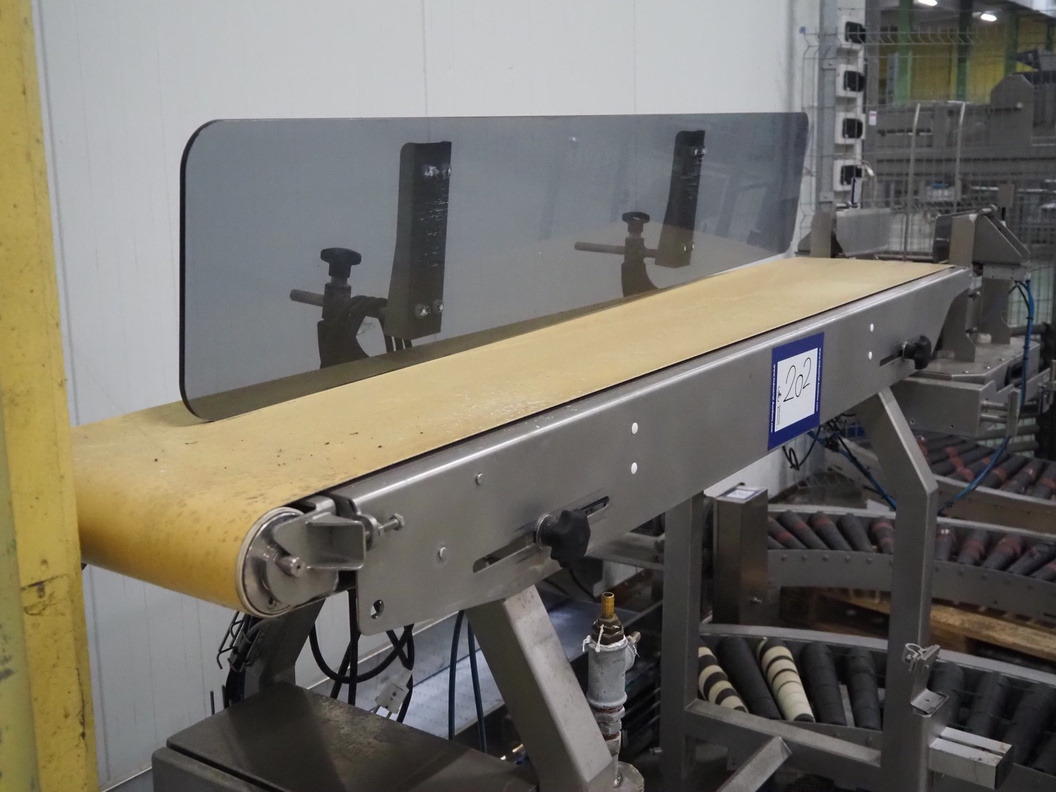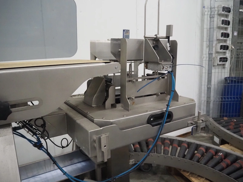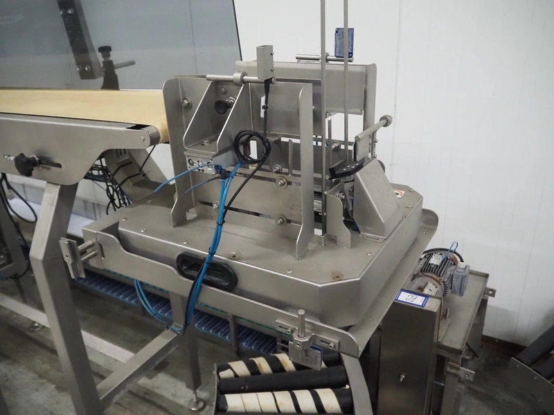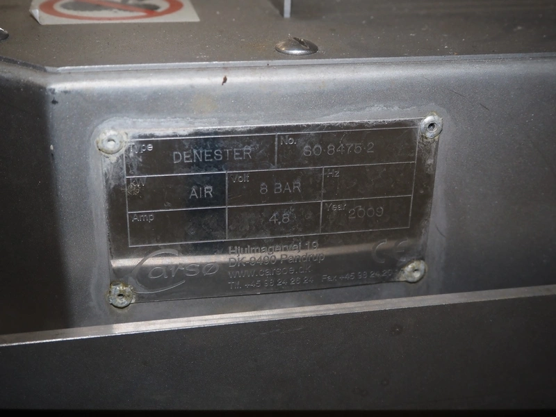 Transport belt with Carsø denester, type denester: DENESTER, number: SO 8475 2, year of construction: 2009, 4.8 A, 8 bar, clearance; 250 mm x 180 mm, plastic belt, belt width: 340 mm, total dimensions: 2500 mm x 700 mm x 1680 mm.
