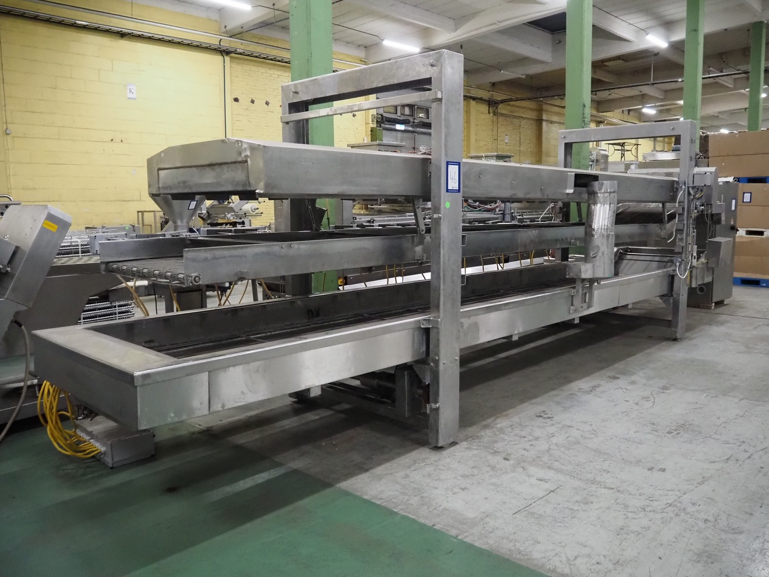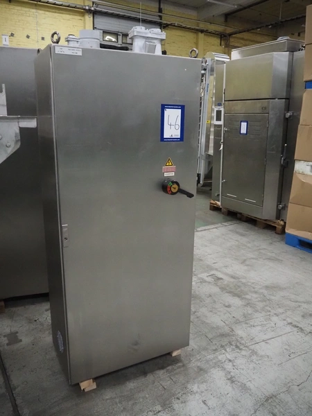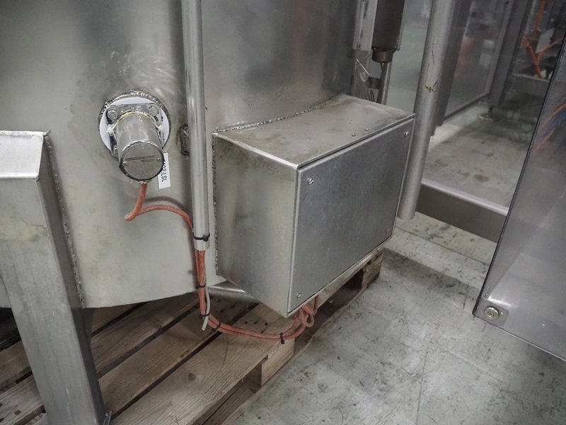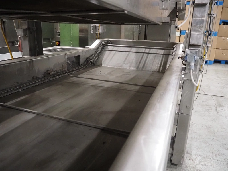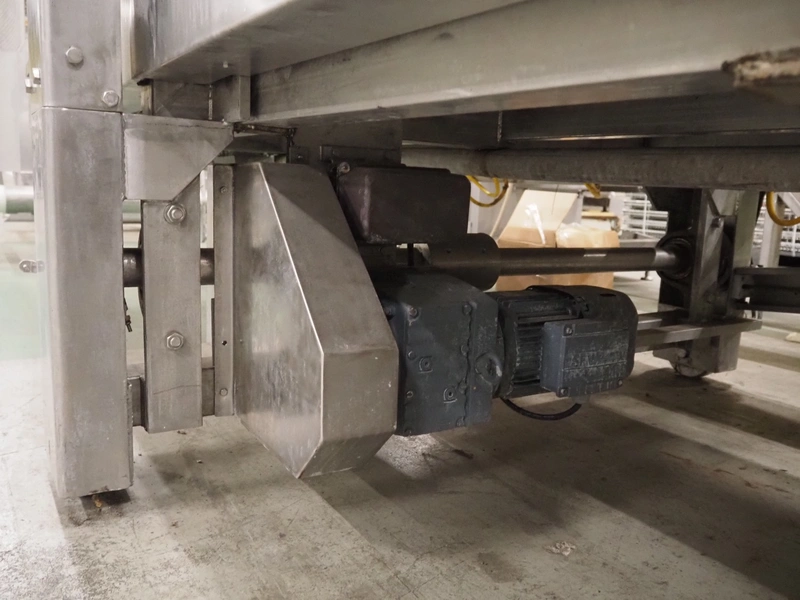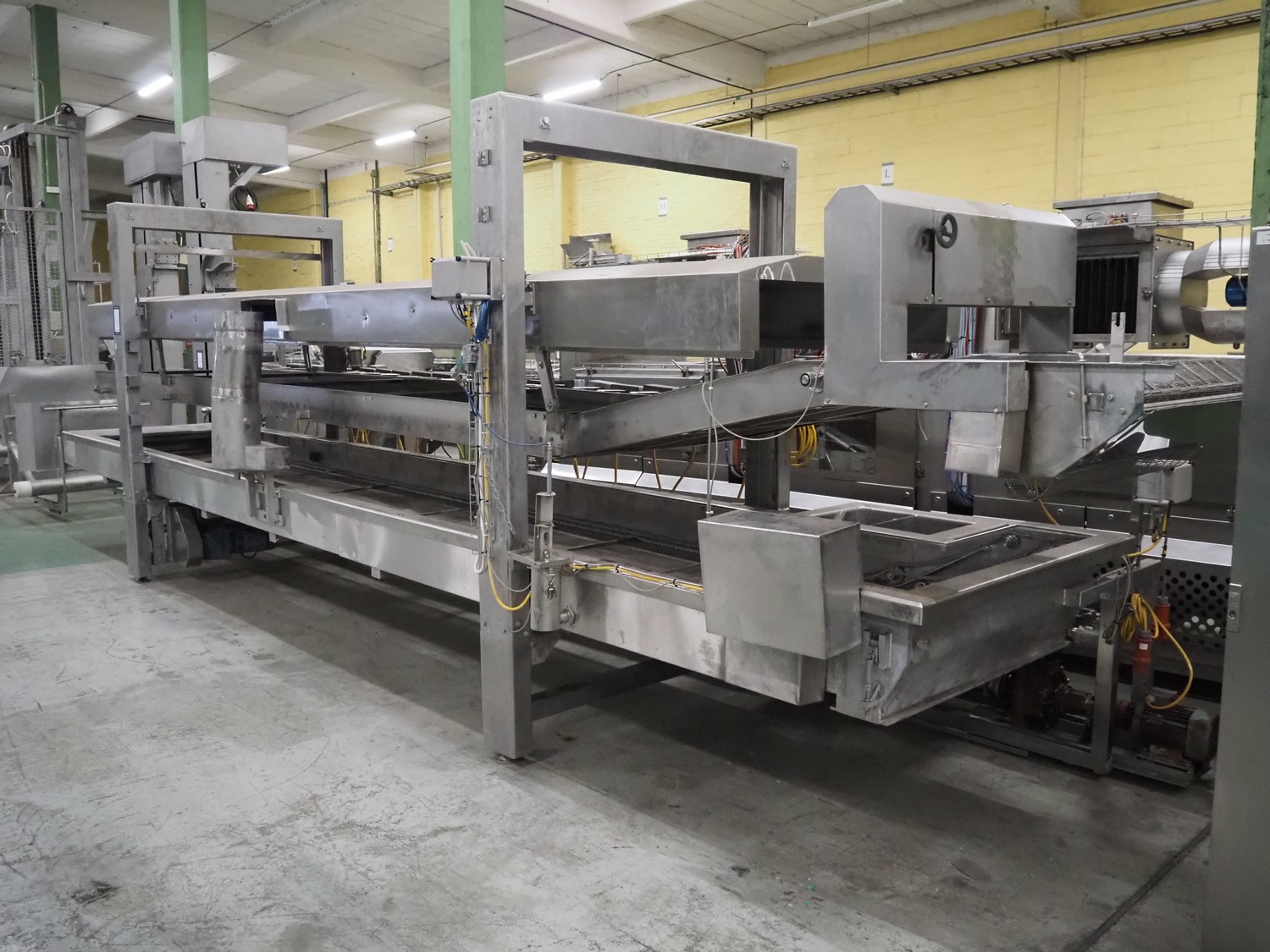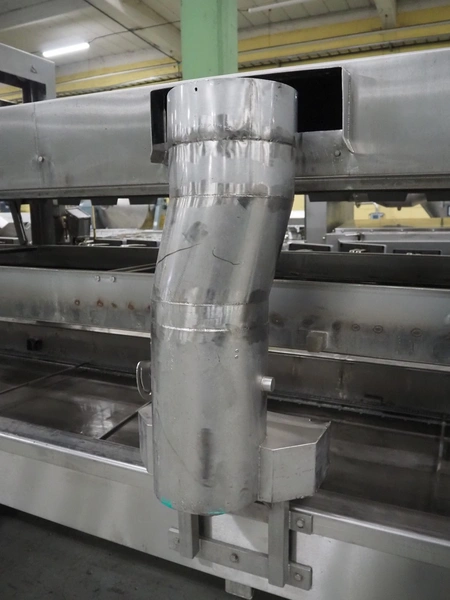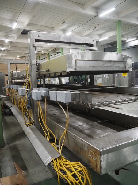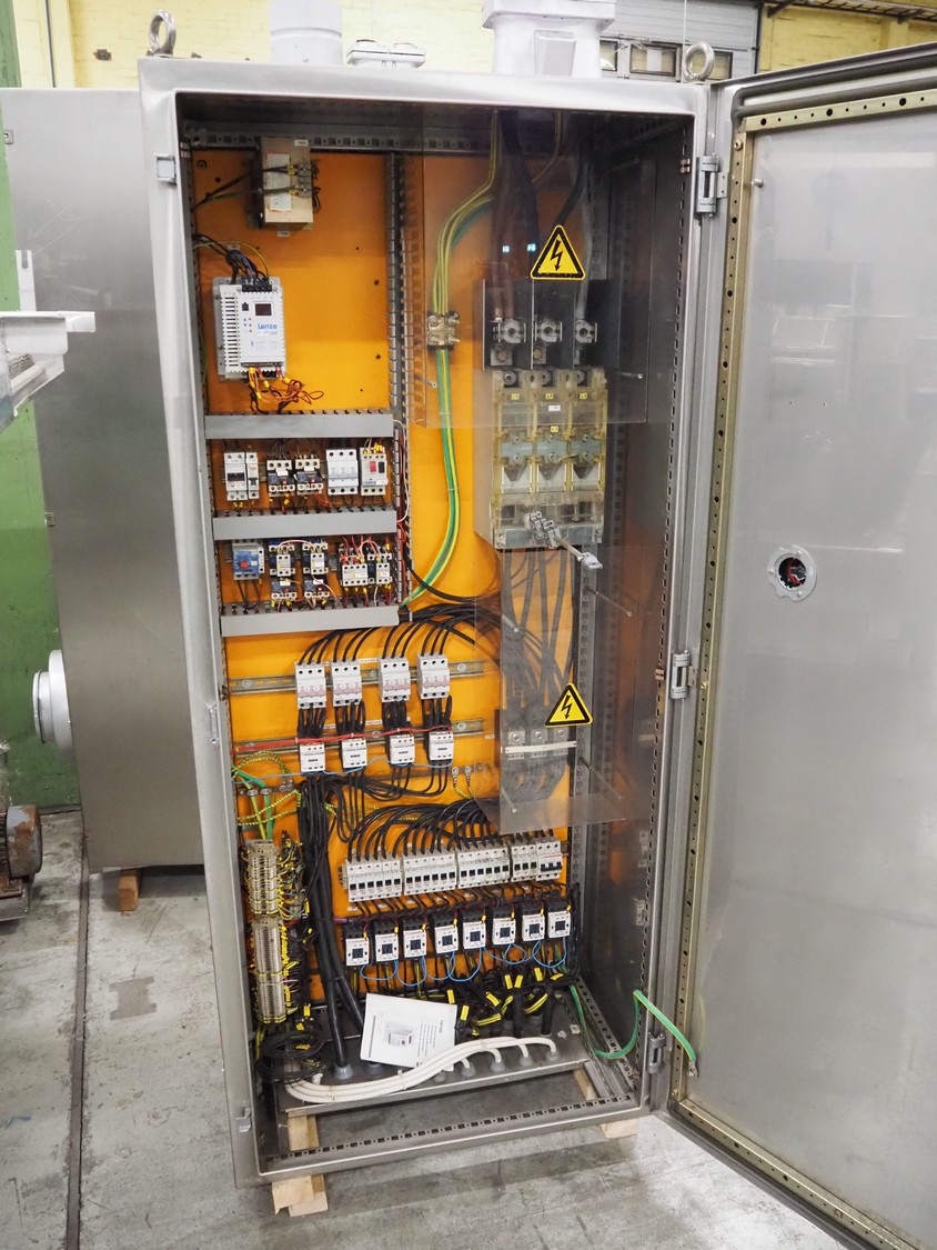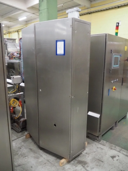 Stork belt fryer, s/s mesh belt, belt width: 1000 mm, total dimensions: 8850 mm x 2300 mm x 2510 mm. Including 2 s/s switch cabinets, dimensions switch cabinets: 1200 mm x 400 mm x 2250 mm and 800 mm x 600 mm x 2000 mm and 2 S/s oil tanks, dimensions: (2x) 1300 mm x 1200 mm x 2350 mm.