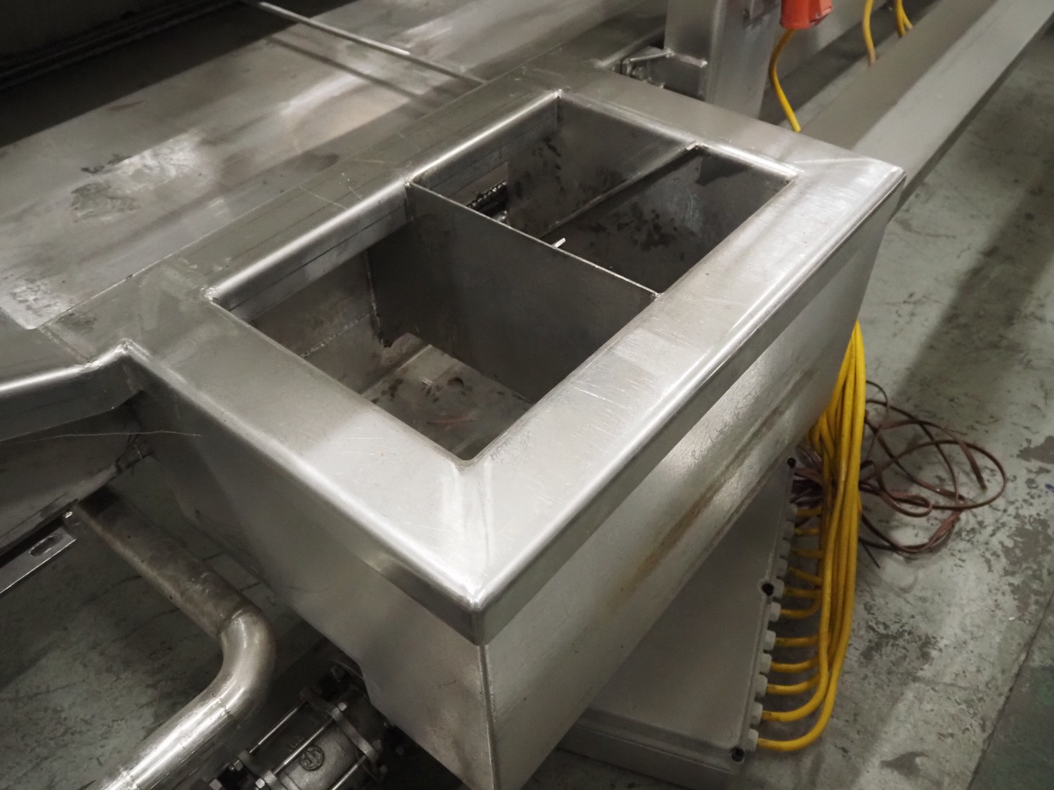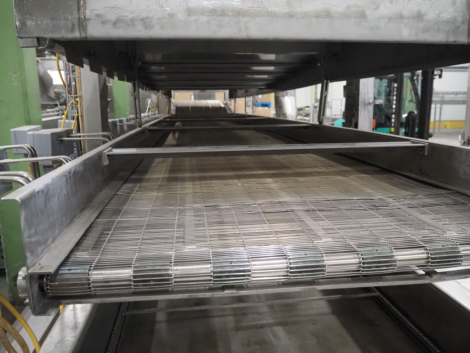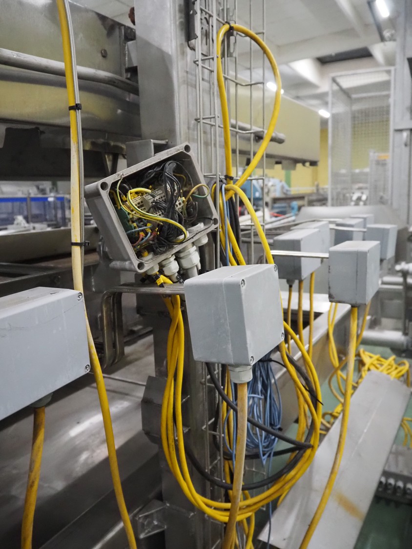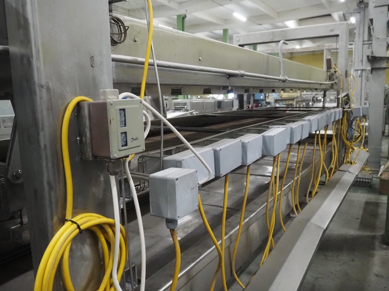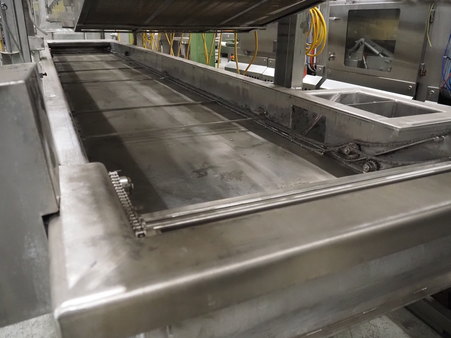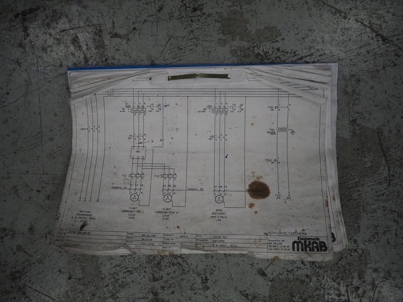 Stork belt fryer, s/s mesh belt, belt width: 1000 mm, total dimensions: 8850 mm x 2300 mm x 2510 mm. Including 2 s/s switch cabinets, dimensions switch cabinets: 1200 mm x 400 mm x 2250 mm and 800 mm x 600 mm x 2000 mm and 2 S/s oil tanks, dimensions: (2x) 1300 mm x 1200 mm x 2350 mm.