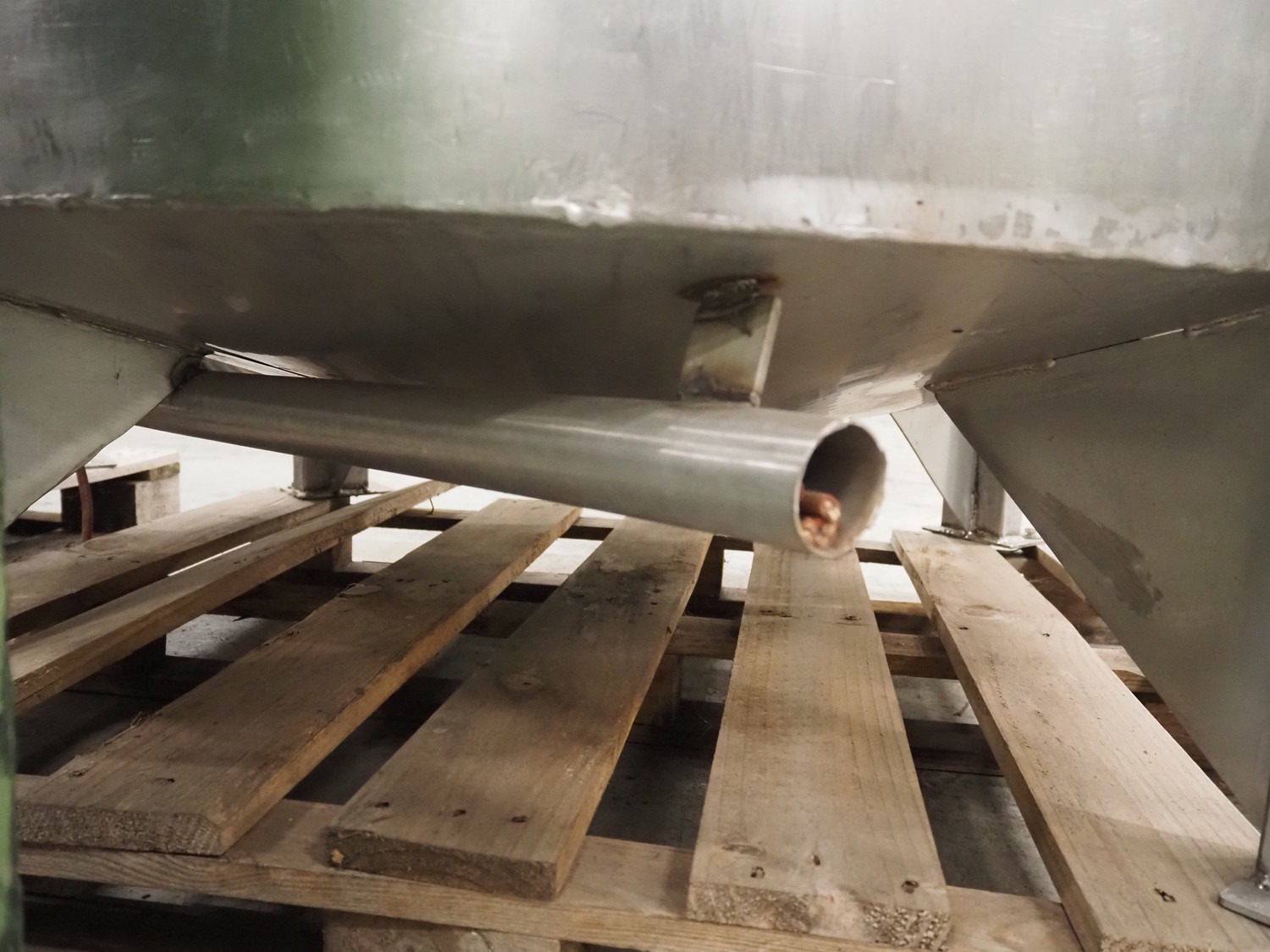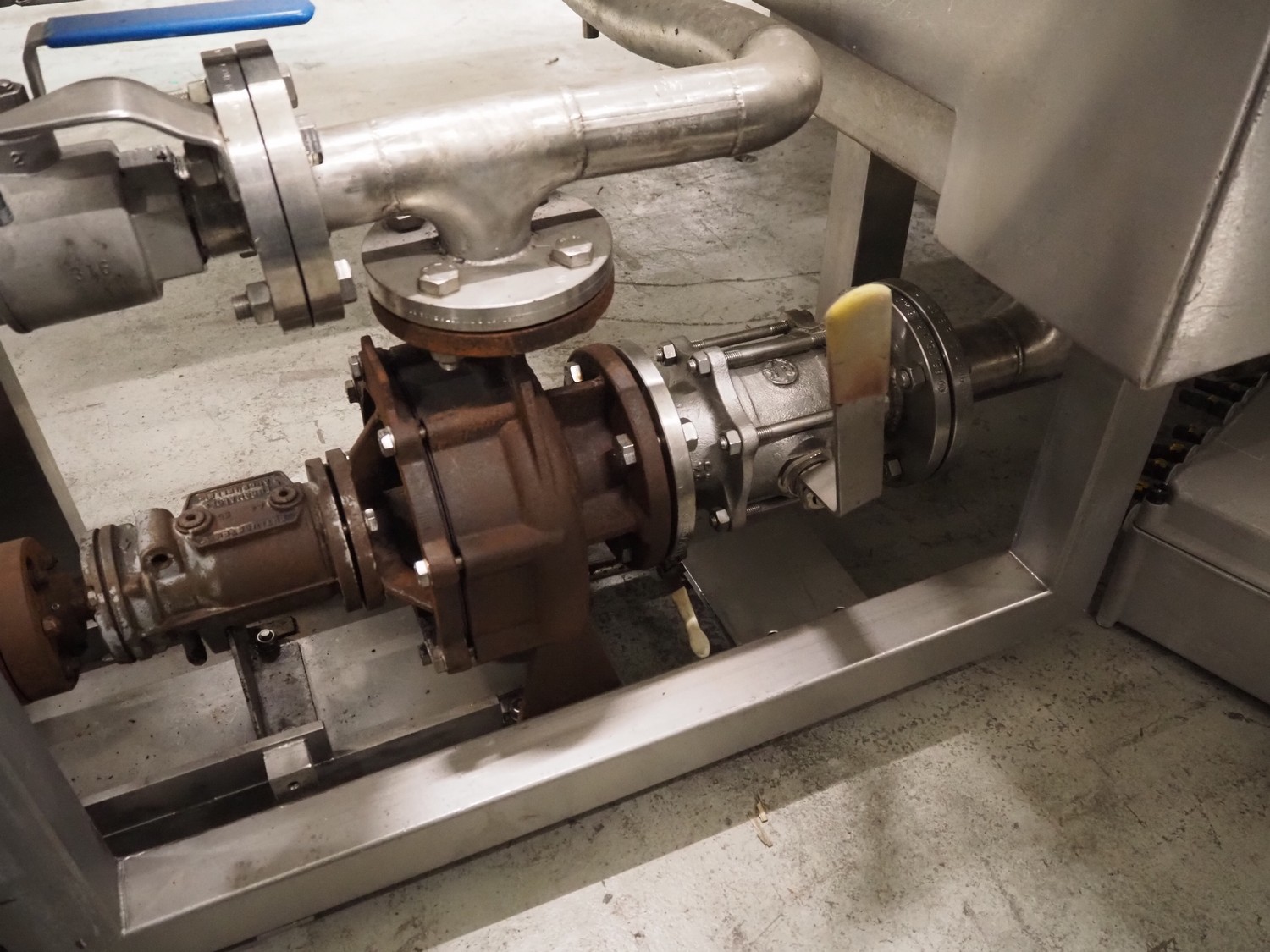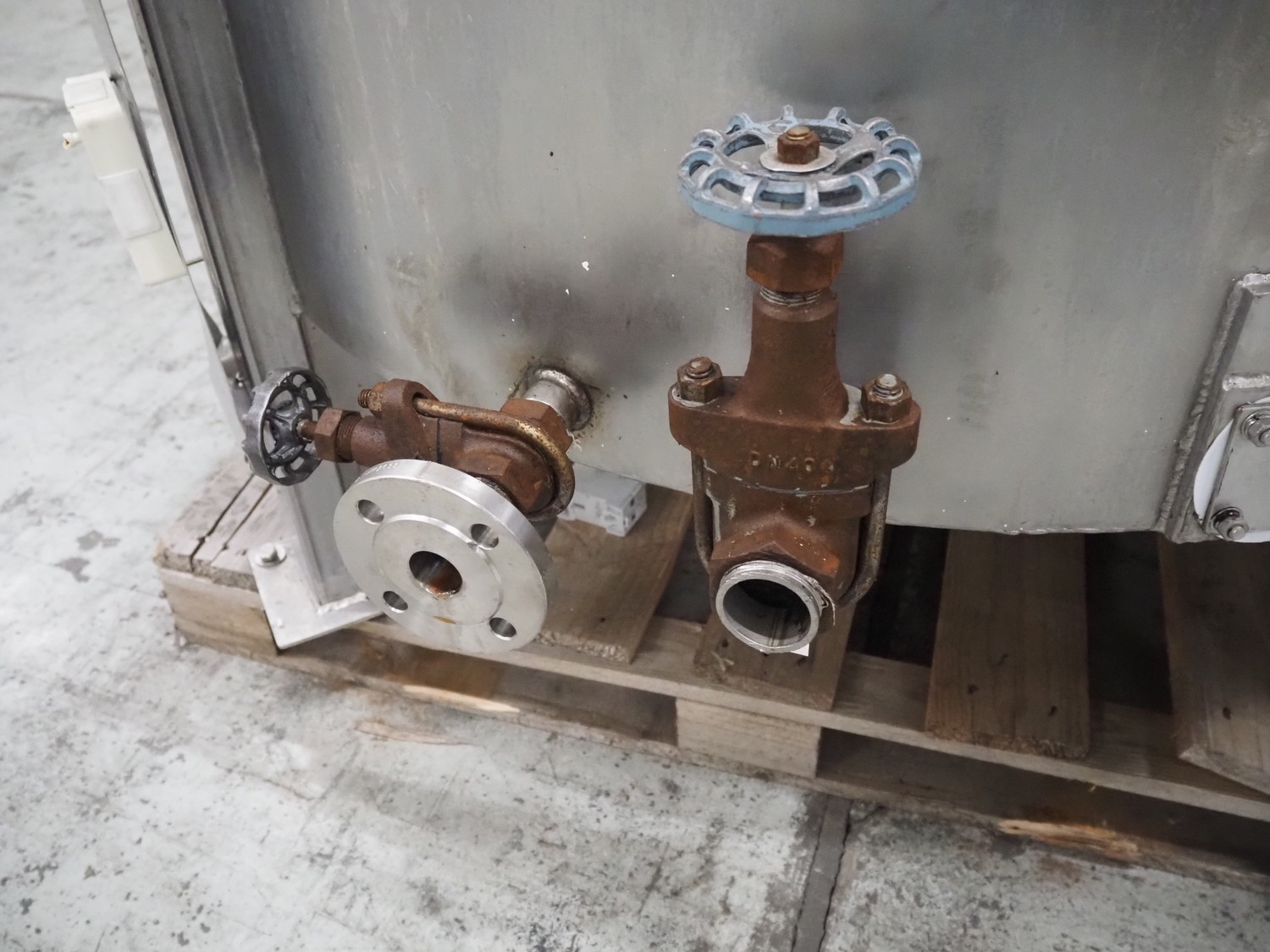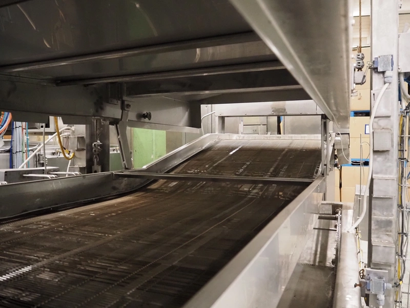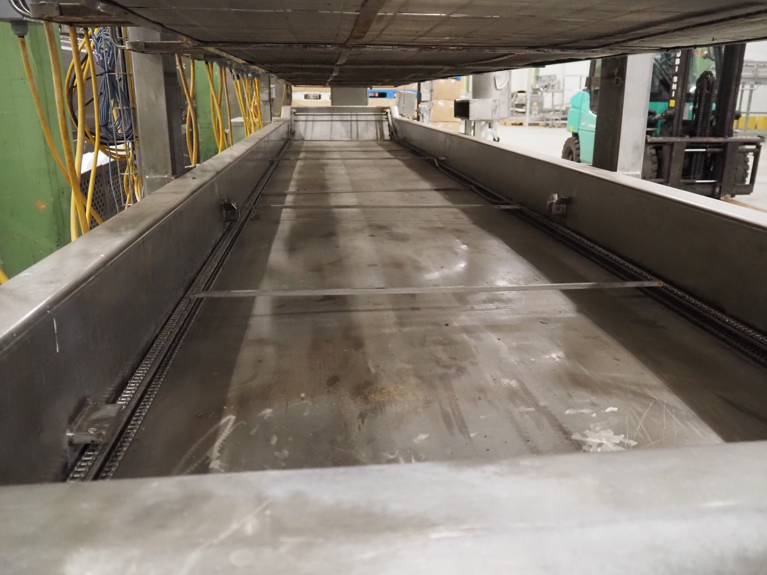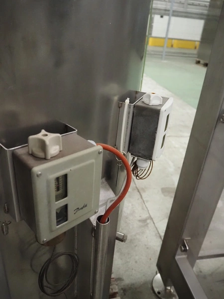 Stork belt fryer, s/s mesh belt, belt width: 1000 mm, total dimensions: 8850 mm x 2300 mm x 2510 mm. Including 2 s/s switch cabinets, dimensions switch cabinets: 1200 mm x 400 mm x 2250 mm and 800 mm x 600 mm x 2000 mm and 2 S/s oil tanks, dimensions: (2x) 1300 mm x 1200 mm x 2350 mm.