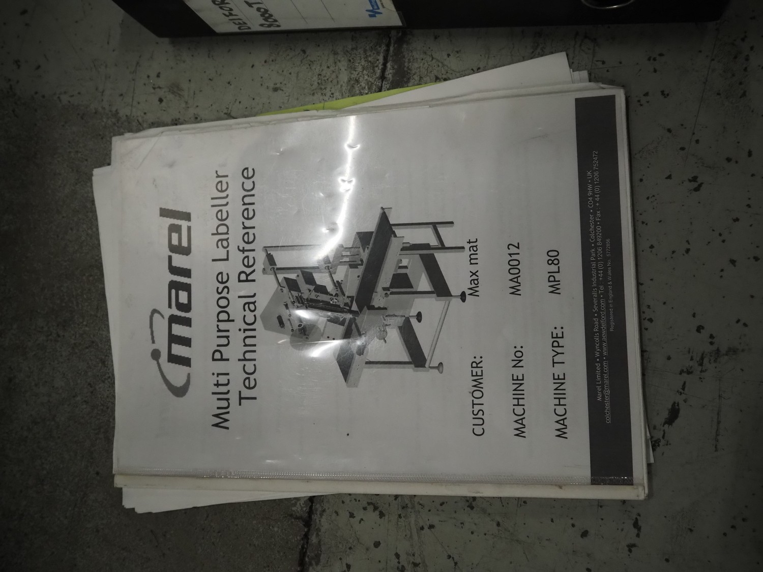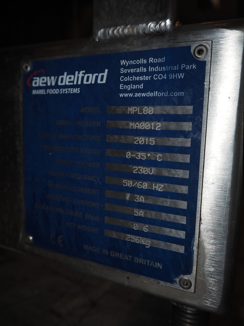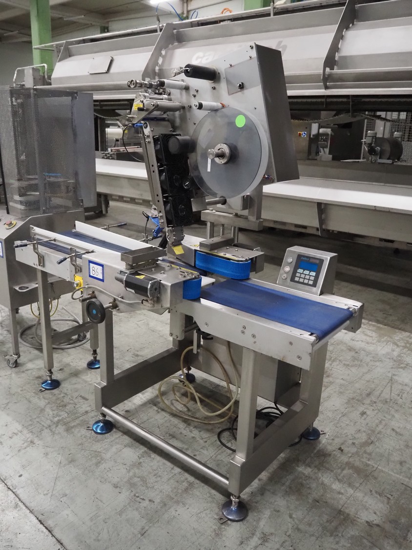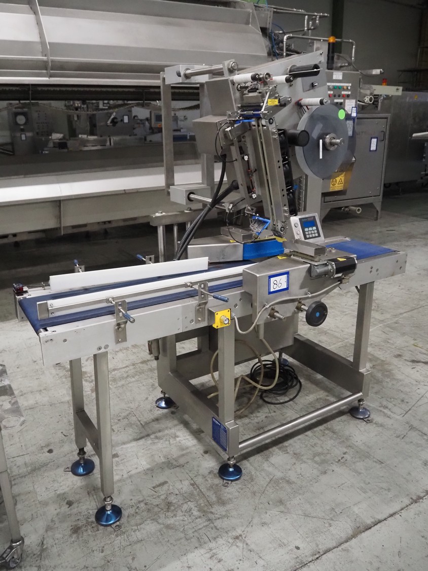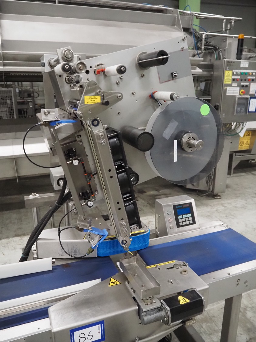 Delford labelling machine, type: MPL80, machine number: MA0012, year of construction: 2015, 230 V, 50/60 Hz, 3/5 A, weight: 256 kg, plastic belt, belt width: 285 mm, total dimensions: 1800 mm x 1150 mm x 1750 mm.