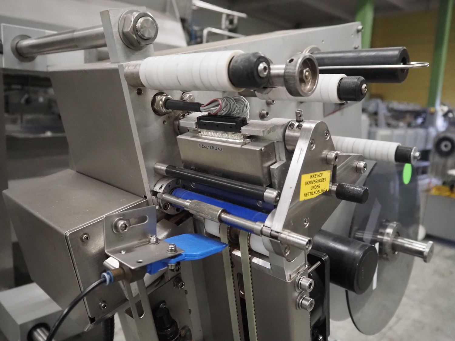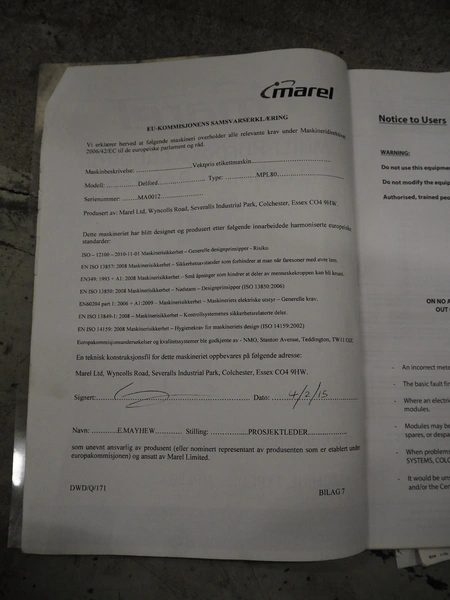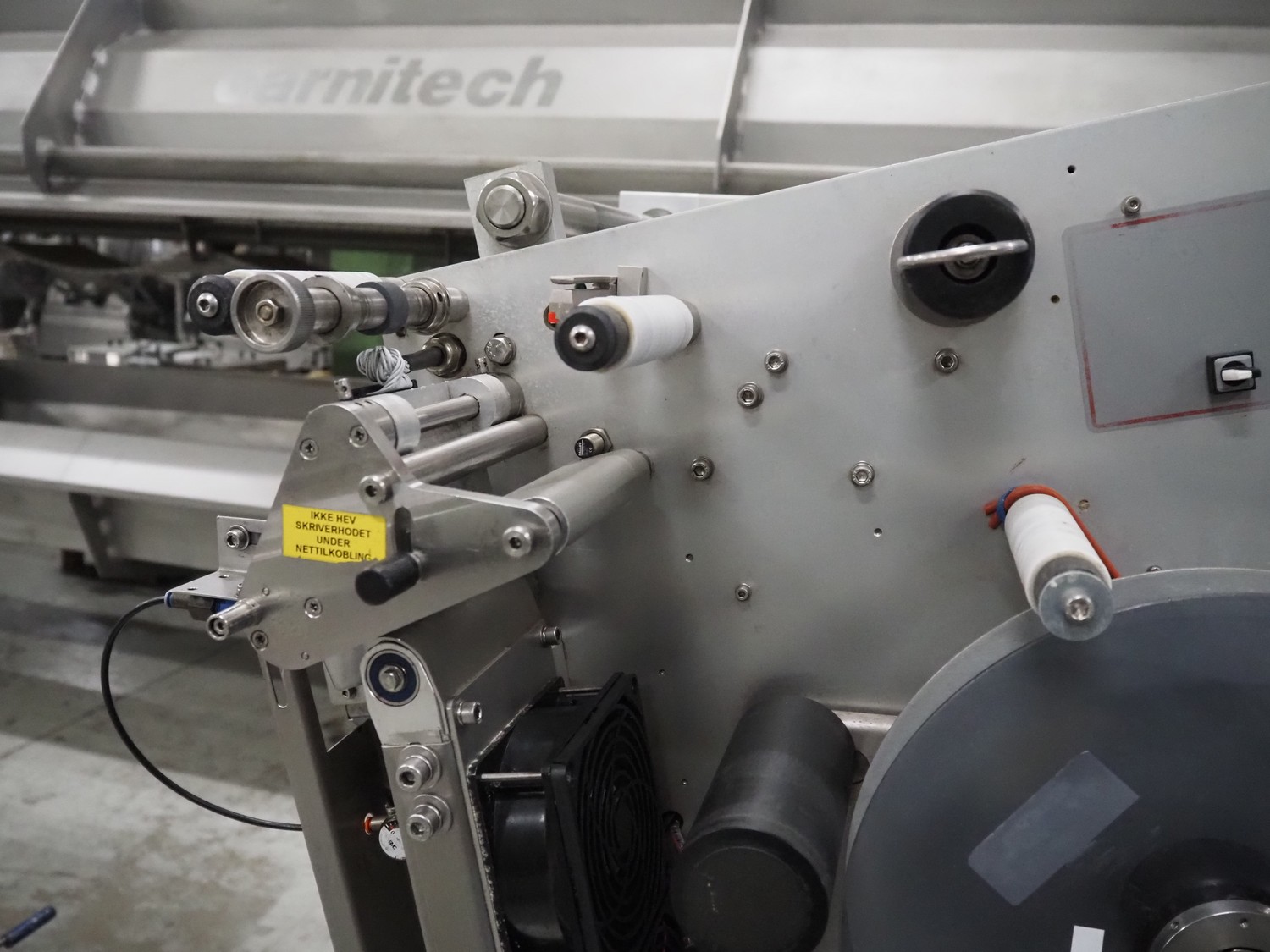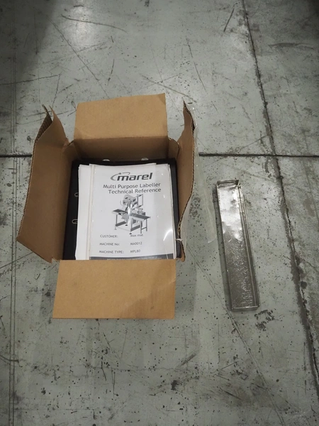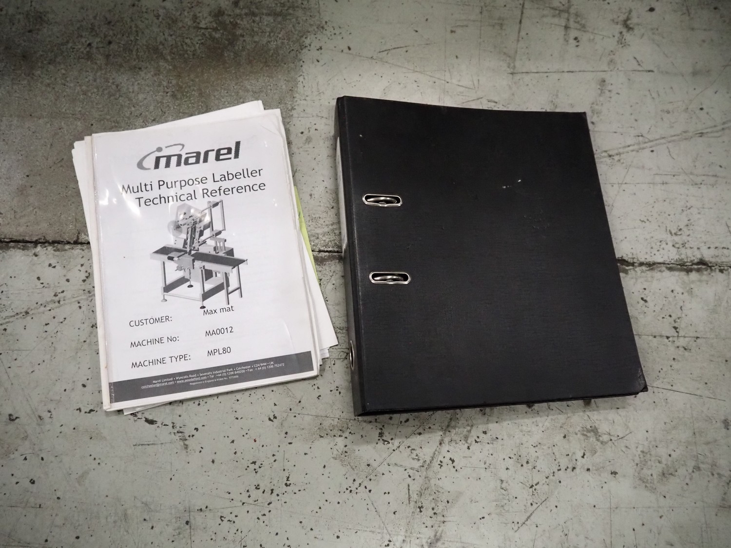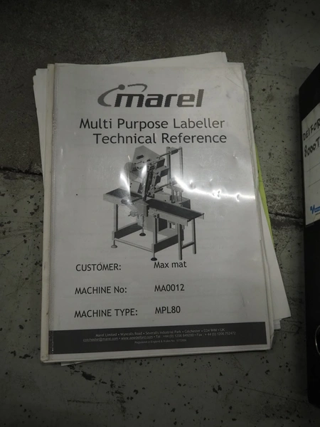 Delford labelling machine, type: MPL80, machine number: MA0012, year of construction: 2015, 230 V, 50/60 Hz, 3/5 A, weight: 256 kg, plastic belt, belt width: 285 mm, total dimensions: 1800 mm x 1150 mm x 1750 mm.