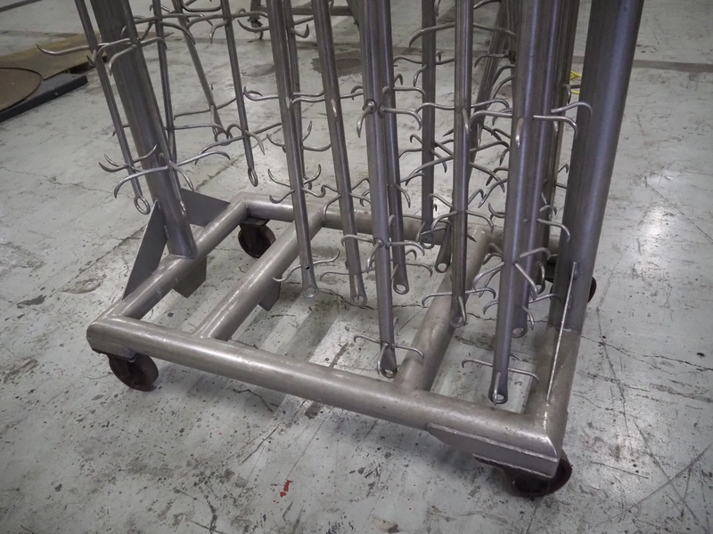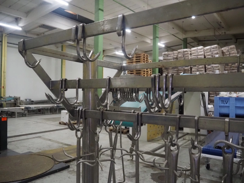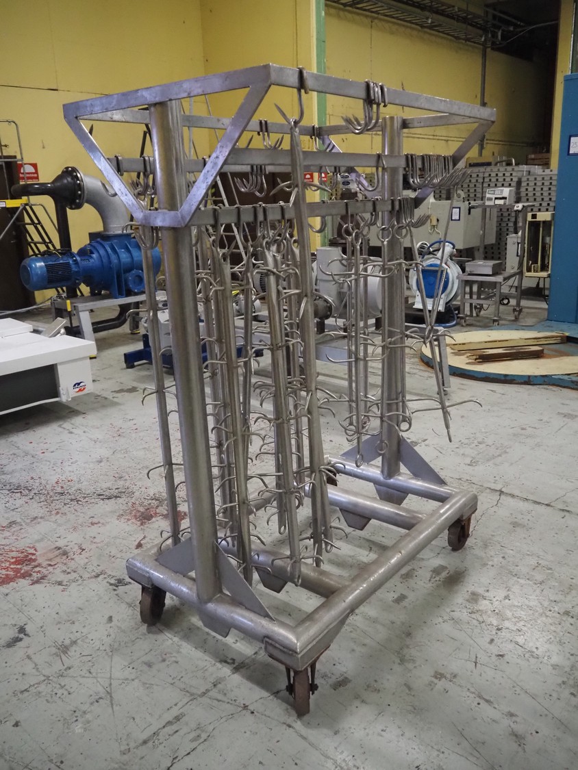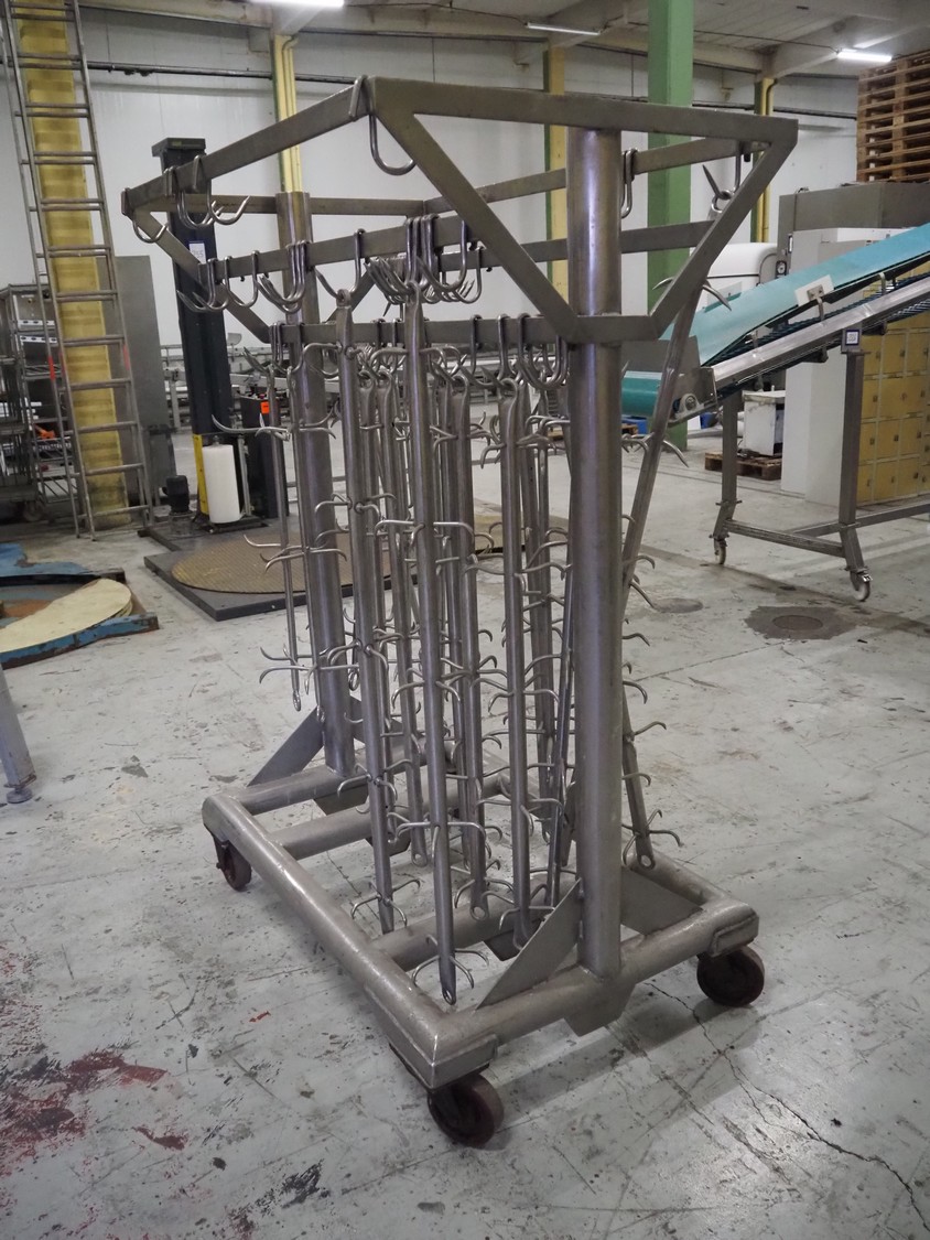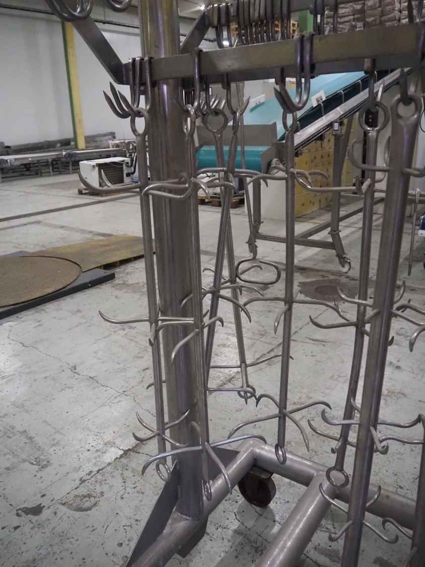 S/s trolley with 19 s/s meat hooks, length meat hooks: (6x) 900 mm, (10x) 1100 mm, (2x) 1300 mm, (1x) 1500 mm, total dimensions: 1200 mm x 800 mm x 1760 mm.