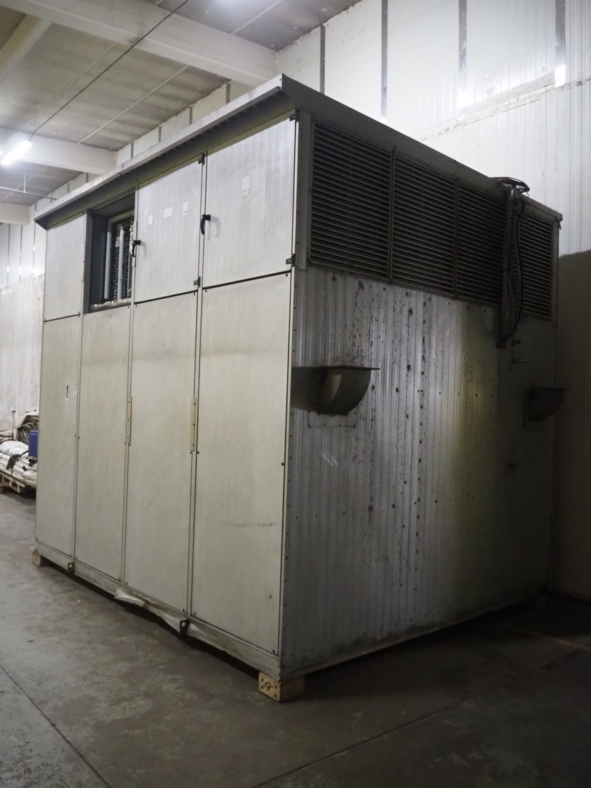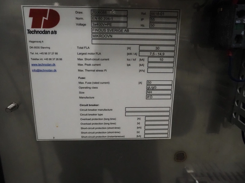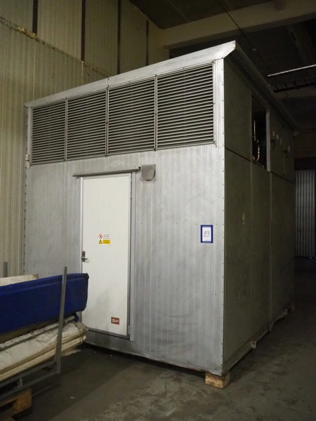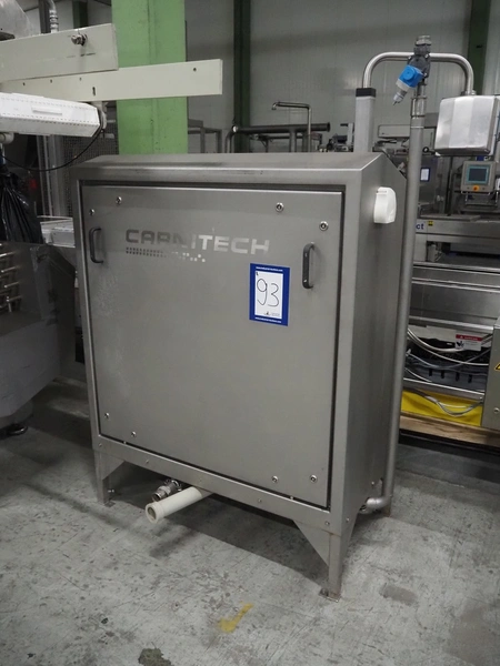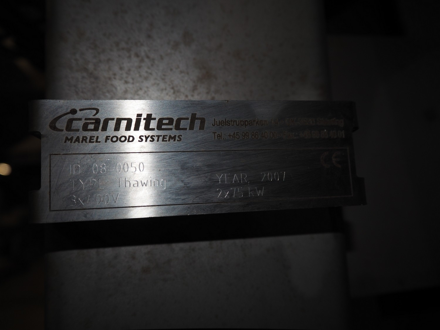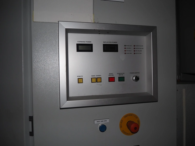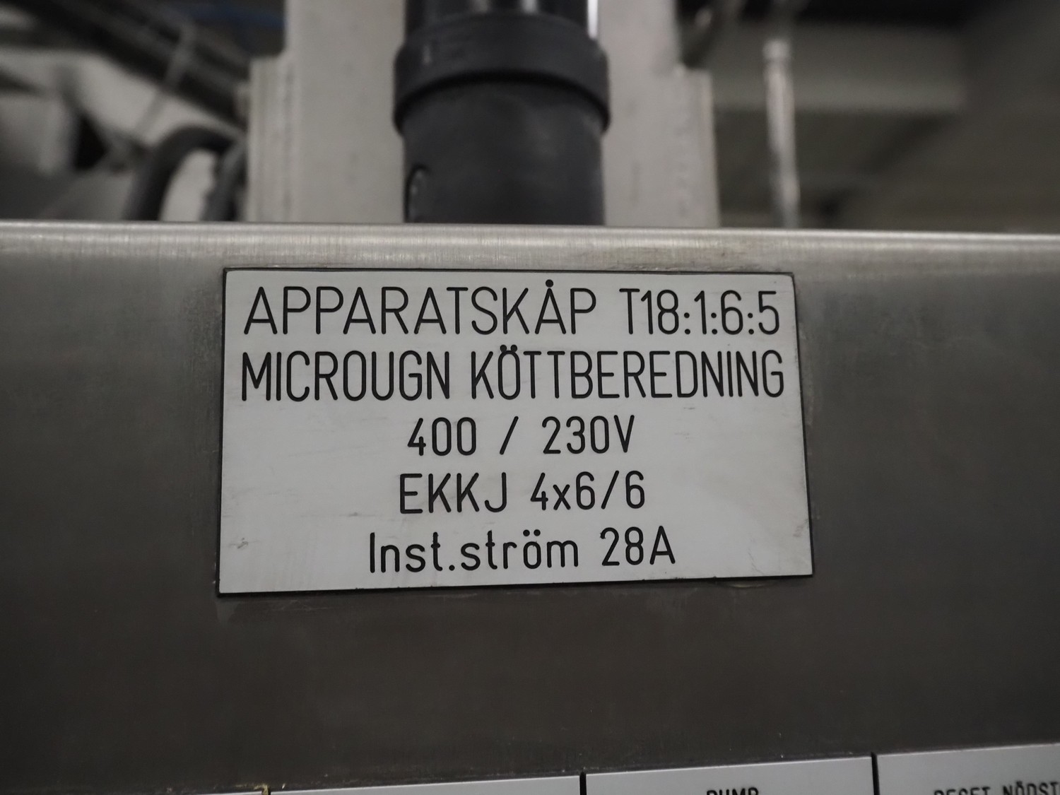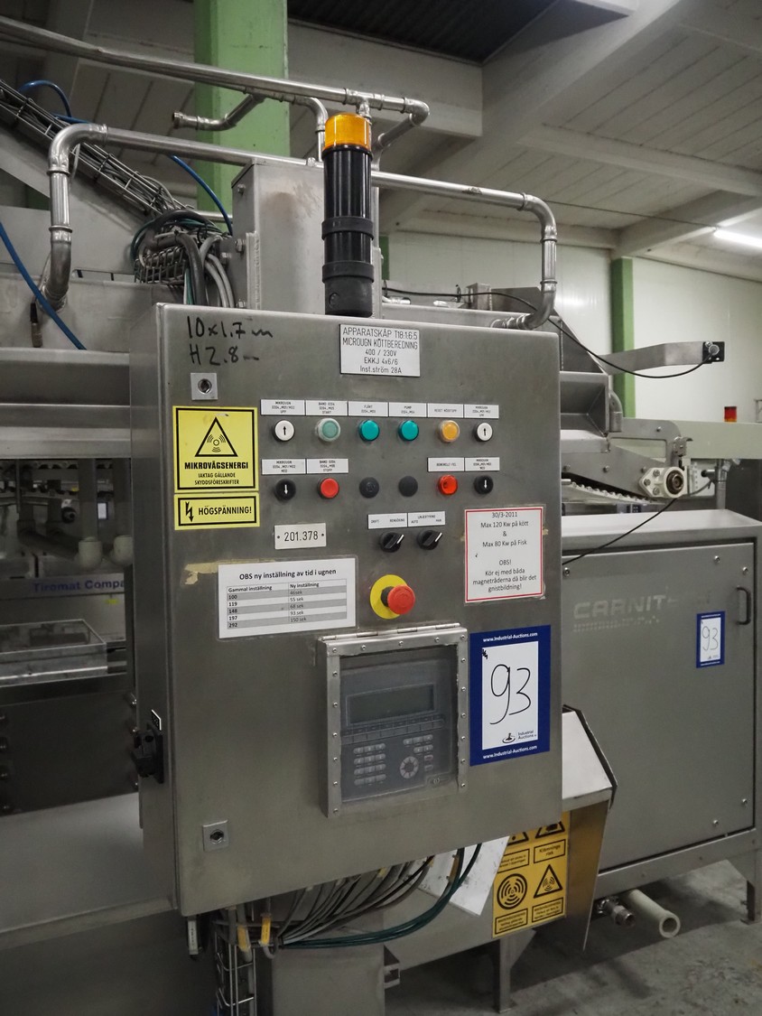 Carnitech industrial microwave, type: Thawing, identification number: 08-0050, year of construction: 2007, 400 V, 3 Ph, 2x 75 kW, plastic belt, belt width: 460 mm, total dimensions microwave: 11150 mm x 1750 mm x 2660 mm. Including s/s cabinet with Grundfoss pump, dimensions cabinet: 1320 mm x 700 mm x 1920 mm. Galvanized shed with electrical cabinets, dimensions shed: 3380 mm x 4200 mm x 3650 mm.