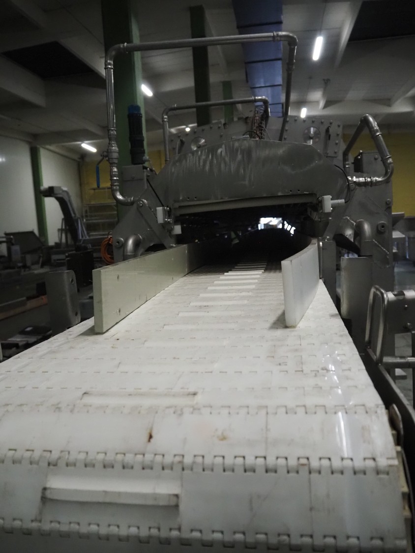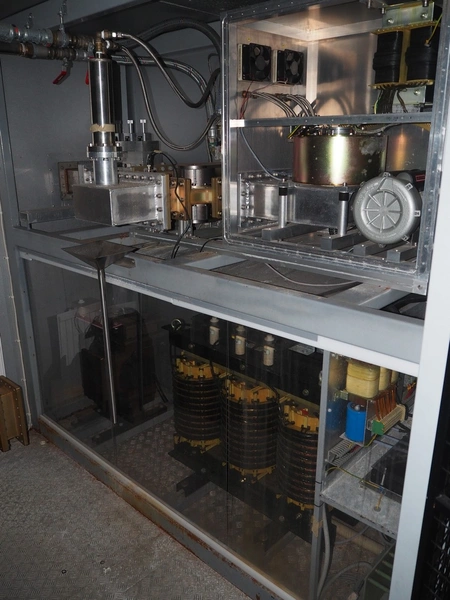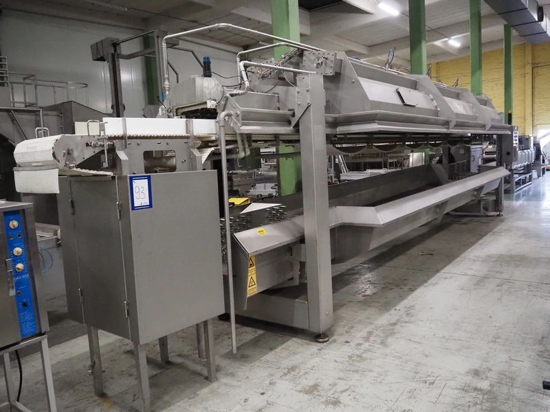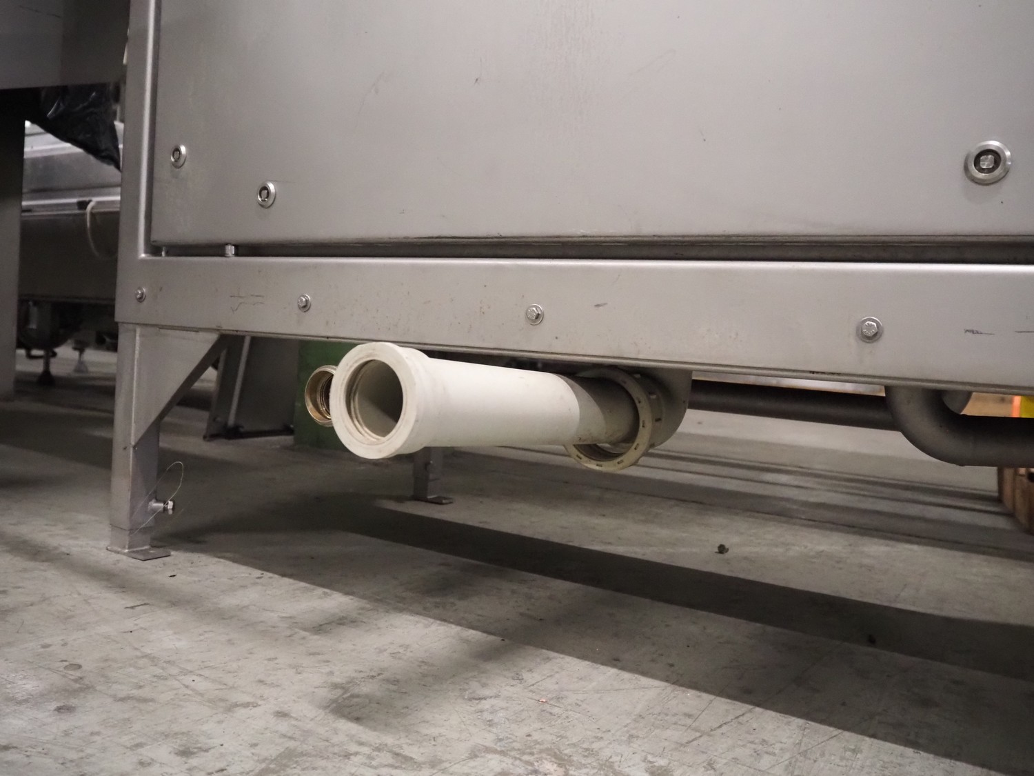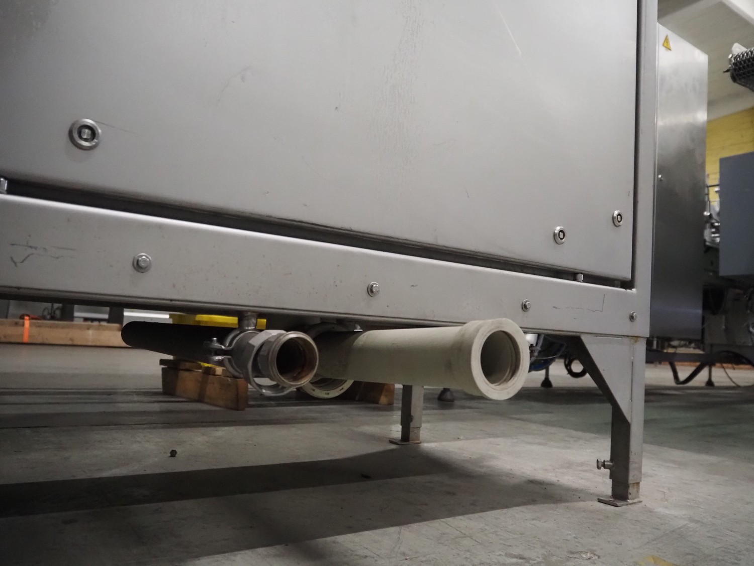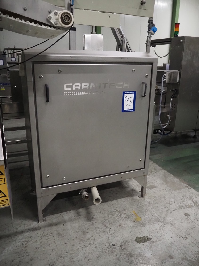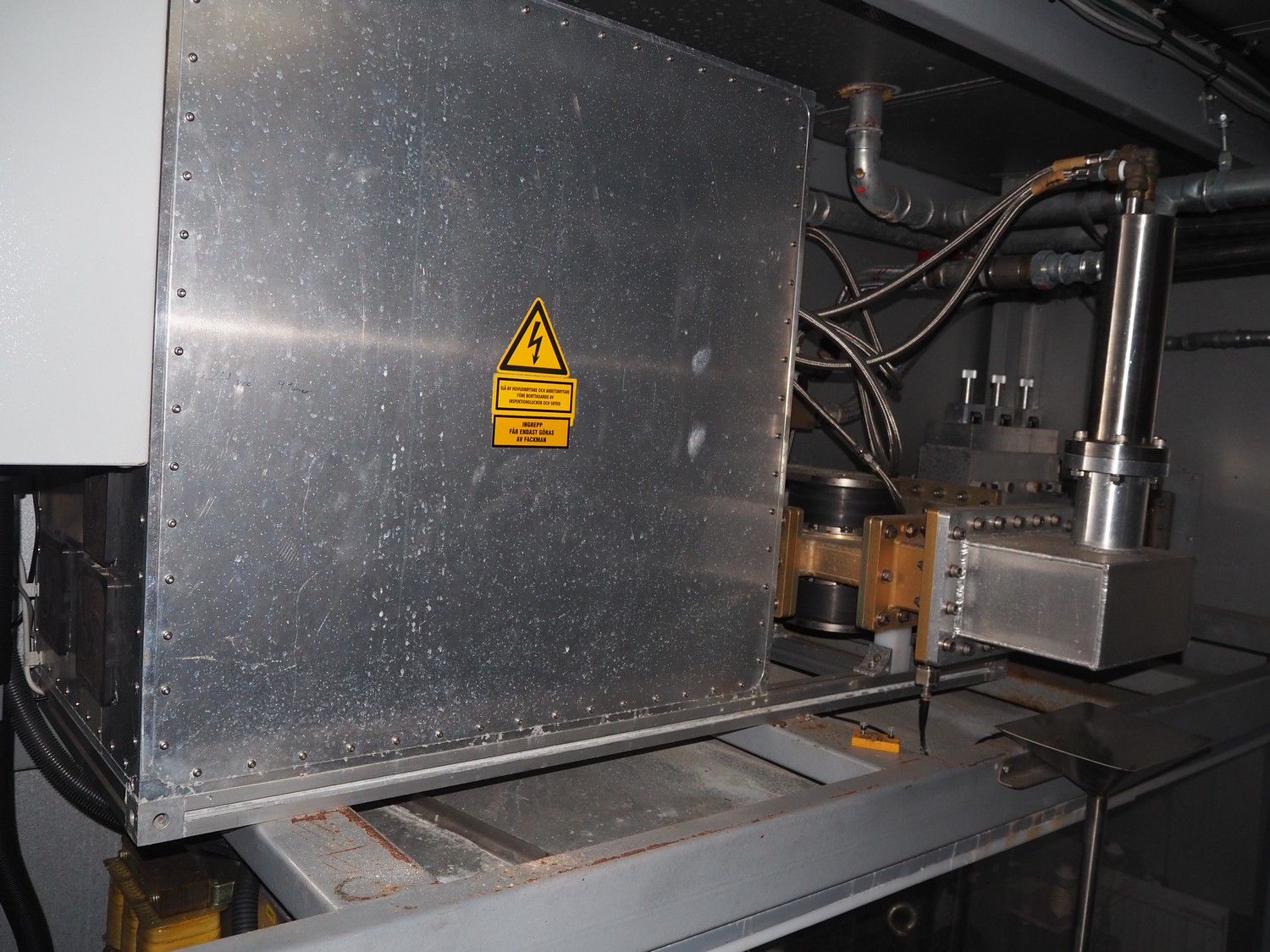 Carnitech industrial microwave, type: Thawing, identification number: 08-0050, year of construction: 2007, 400 V, 3 Ph, 2x 75 kW, plastic belt, belt width: 460 mm, total dimensions microwave: 11150 mm x 1750 mm x 2660 mm. Including s/s cabinet with Grundfoss pump, dimensions cabinet: 1320 mm x 700 mm x 1920 mm. Galvanized shed with electrical cabinets, dimensions shed: 3380 mm x 4200 mm x 3650 mm.
