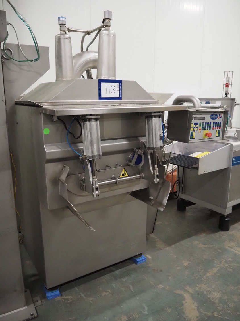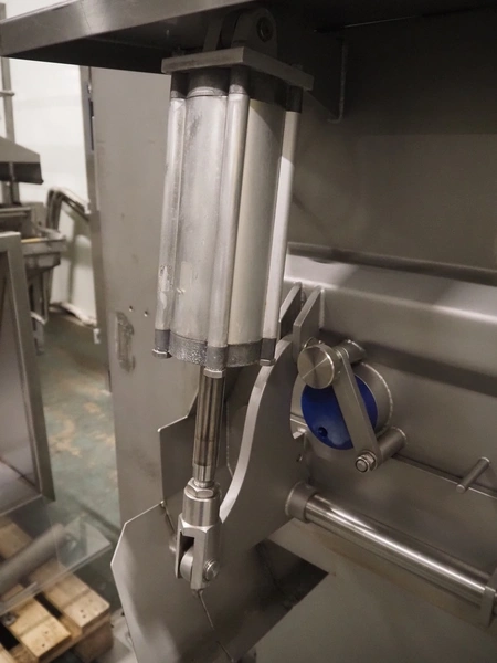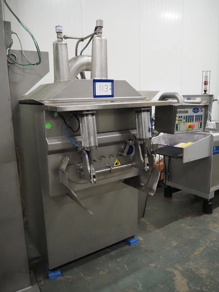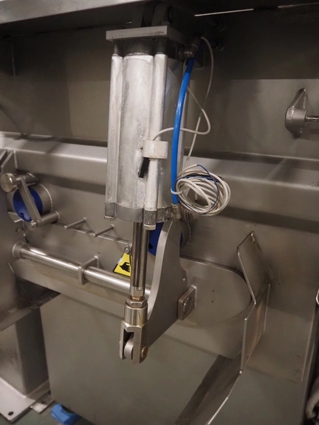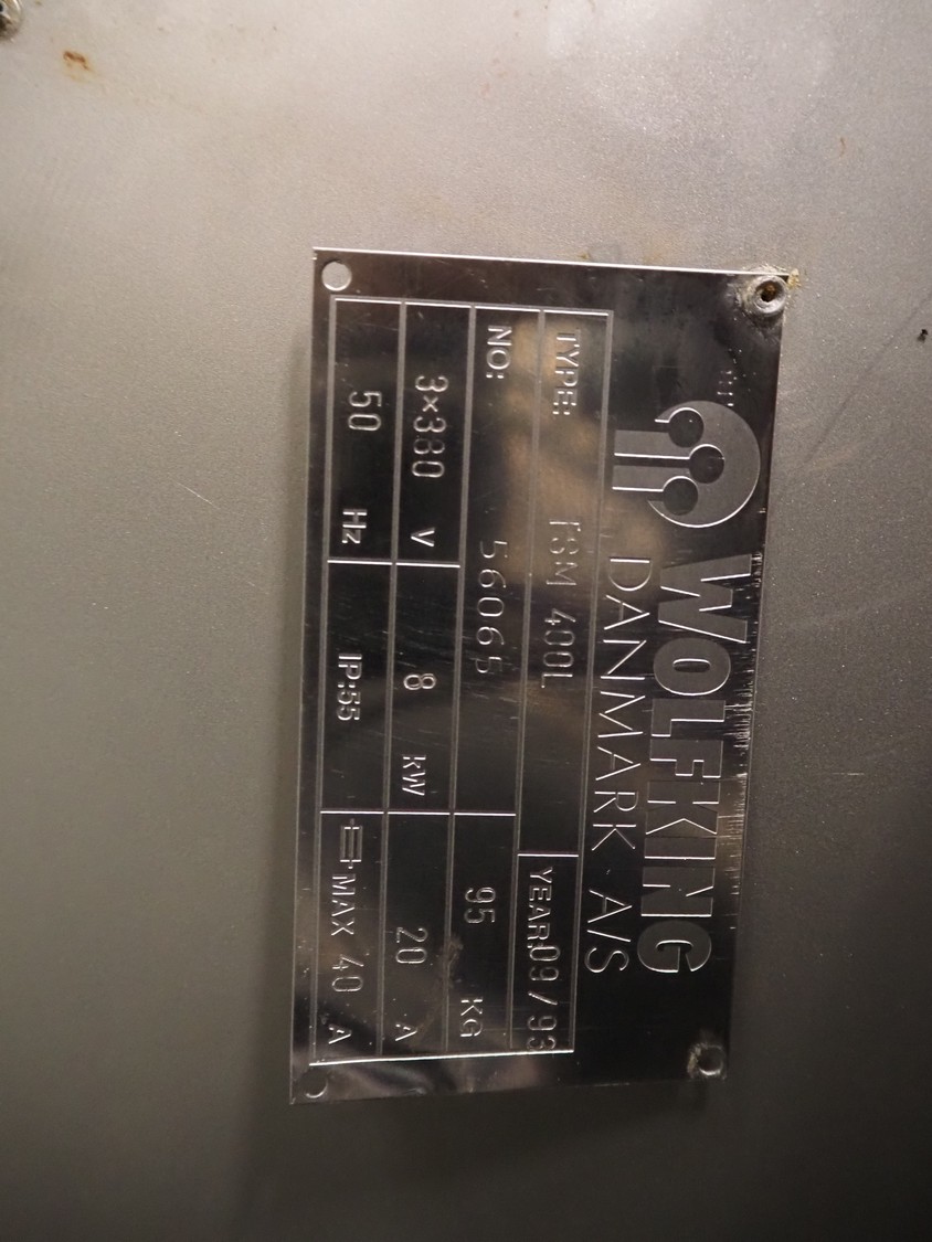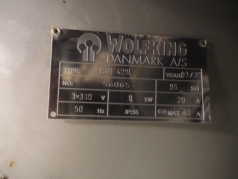 Wolfking double shaft paddle mixer, type: TSM 400L, number: 56065, year of construction: 09/1993, 380 V, 3 Ph, 50 Hz, 20 A, 8 kW, volume: 400 liter, dimensions: 2000 mm x 1650 mm x 2700 mm.