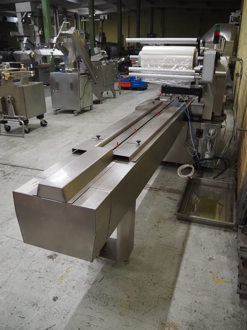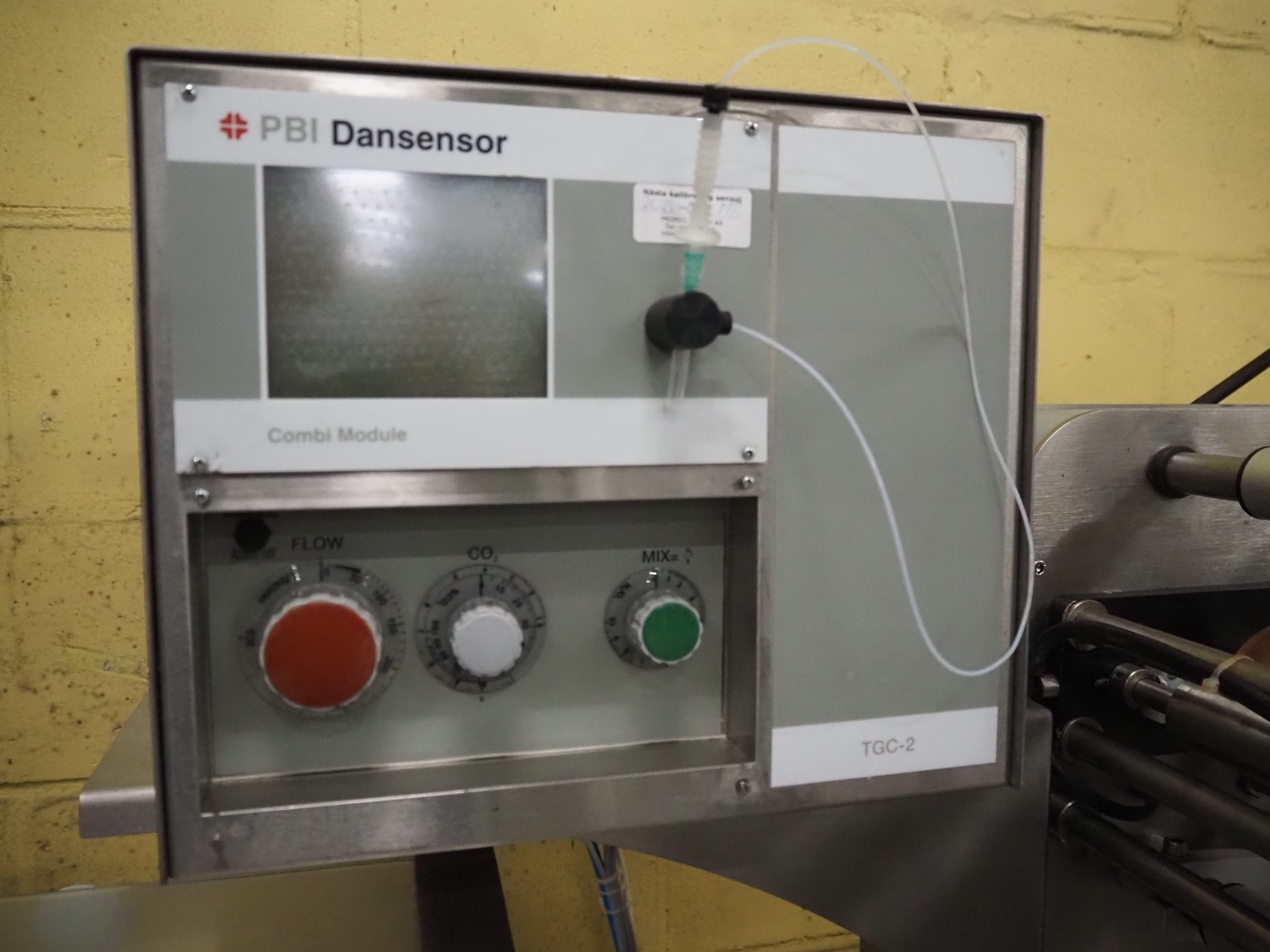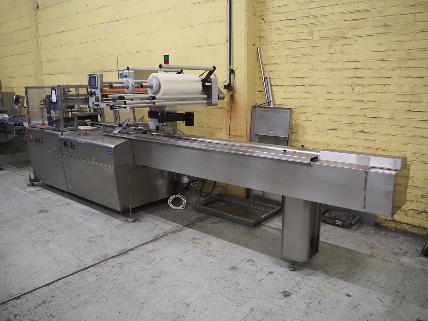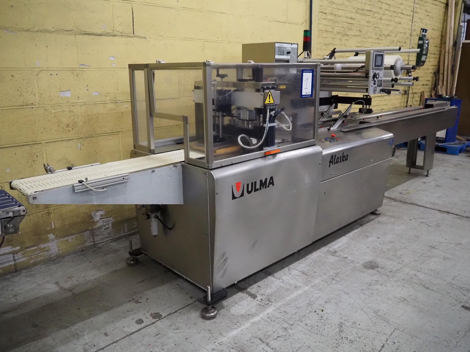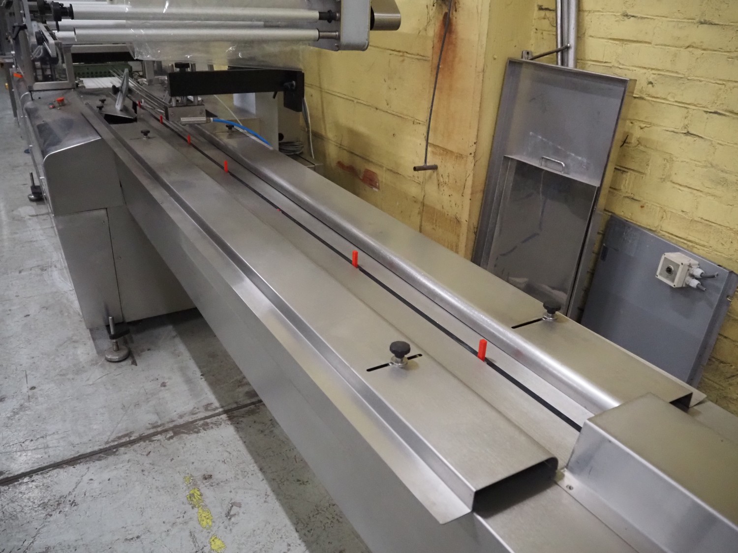 Ulma flowpacker, model: Alaska, machine number: 2504032, year of construction: 1999, 400 V, 50 Hz, infeed belt with dividers, distance between dividers: 400 mm, divider height: 30 mm, film width: 560 mm, plastic belt, belt width: 300 mm, seal width: 330 mm, with PBI Dansensor gas mixer, model: Module TGC-2 335, total dimensions: 5900 mm x 1250 mm x 1900 mm.