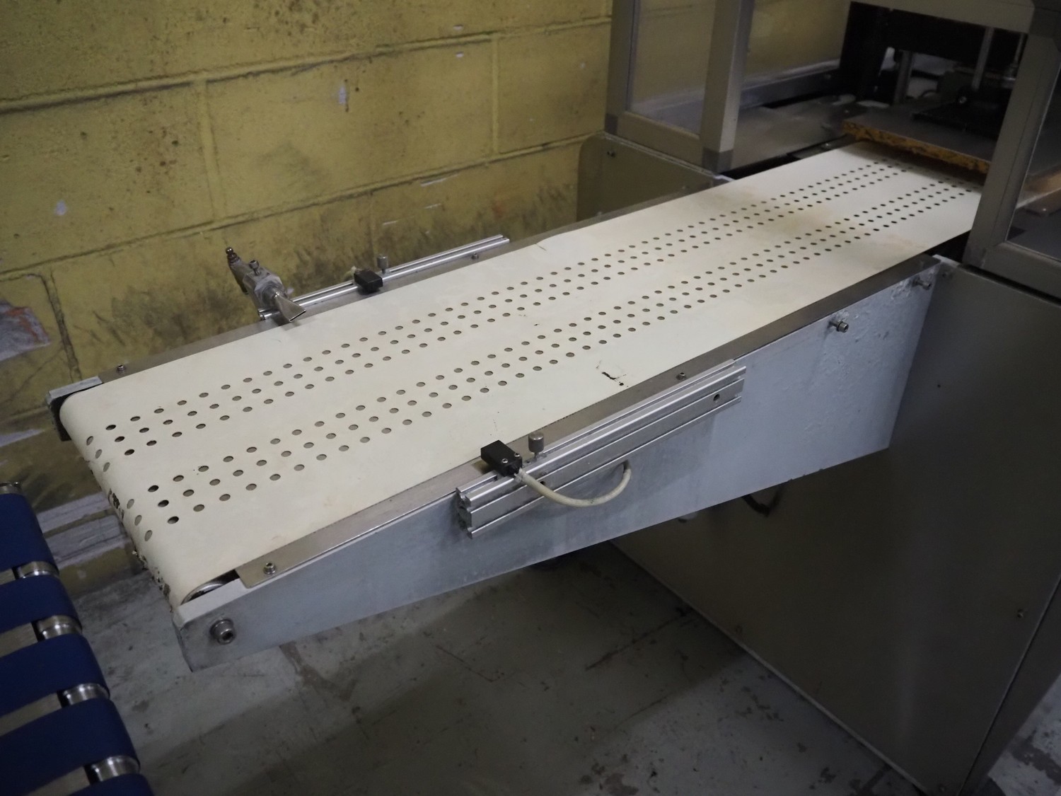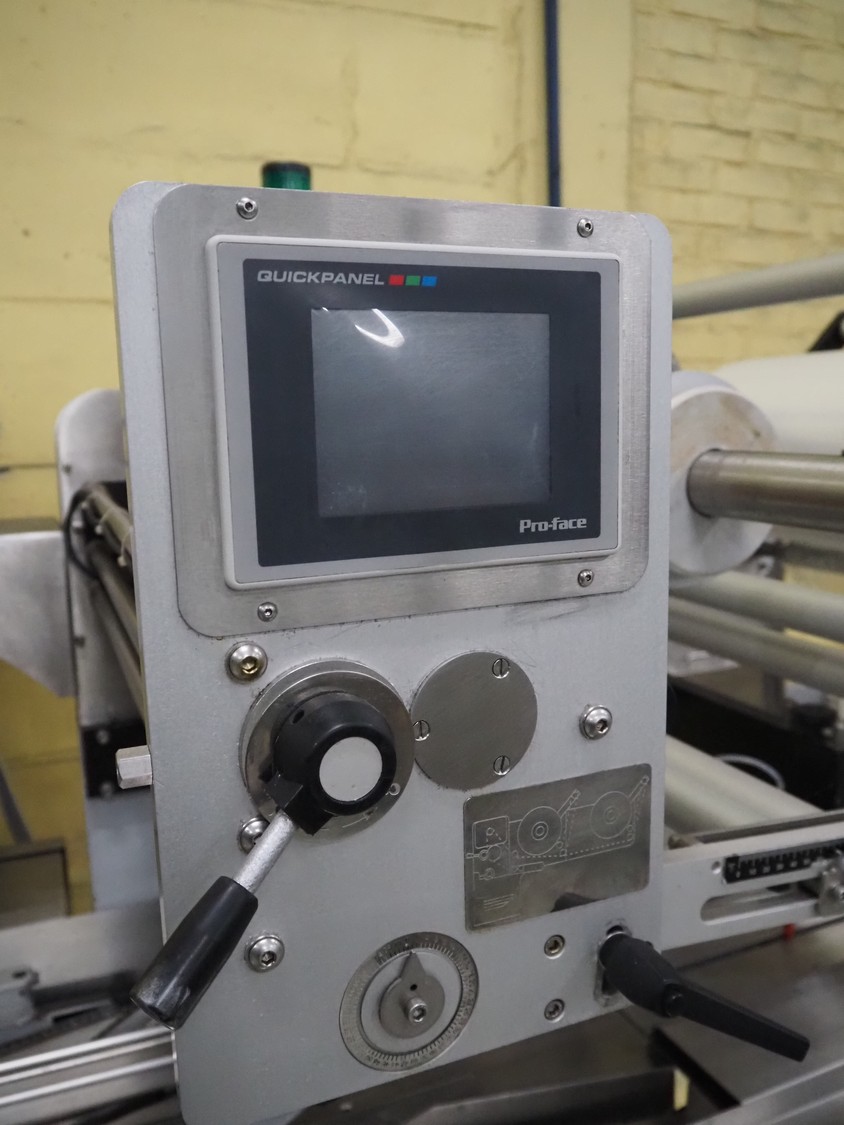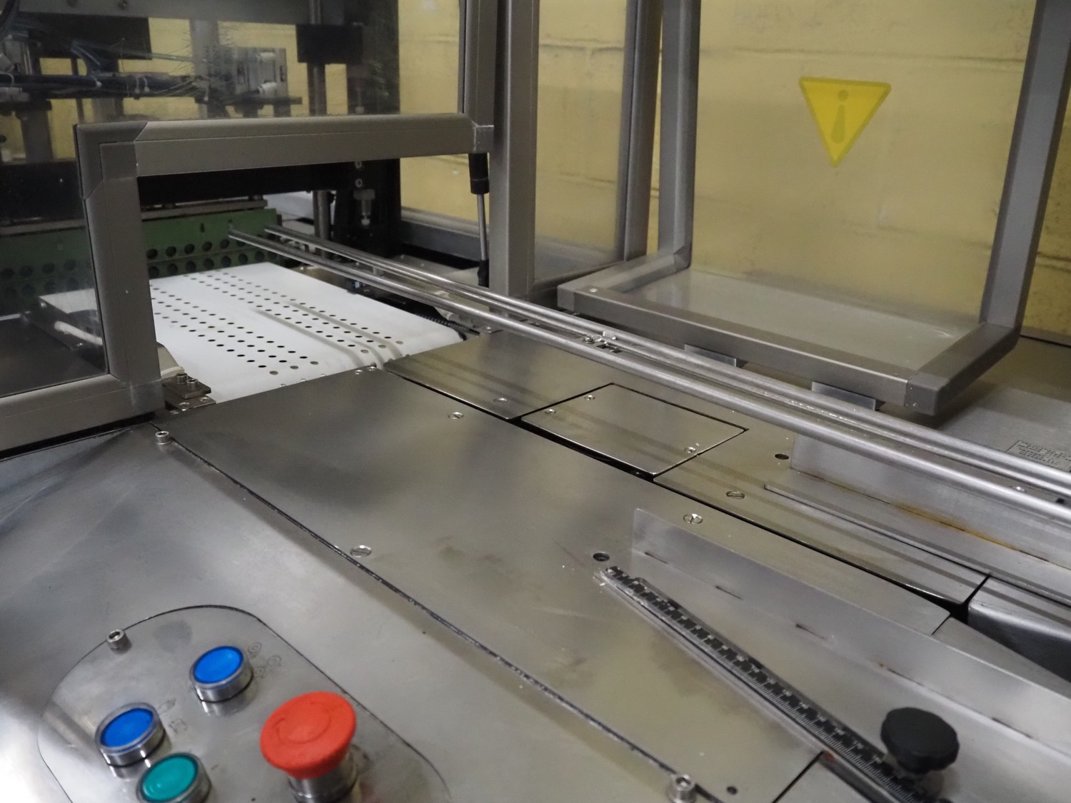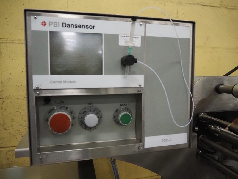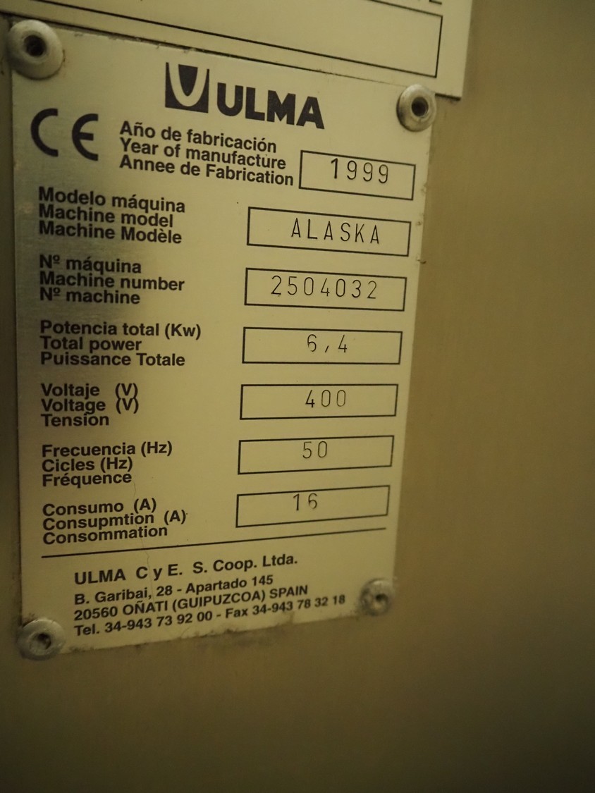 Ulma flowpacker, model: Alaska, machine number: 2504032, year of construction: 1999, 400 V, 50 Hz, infeed belt with dividers, distance between dividers: 400 mm, divider height: 30 mm, film width: 560 mm, plastic belt, belt width: 300 mm, seal width: 330 mm, with PBI Dansensor gas mixer, model: Module TGC-2 335, total dimensions: 5900 mm x 1250 mm x 1900 mm.