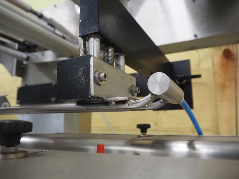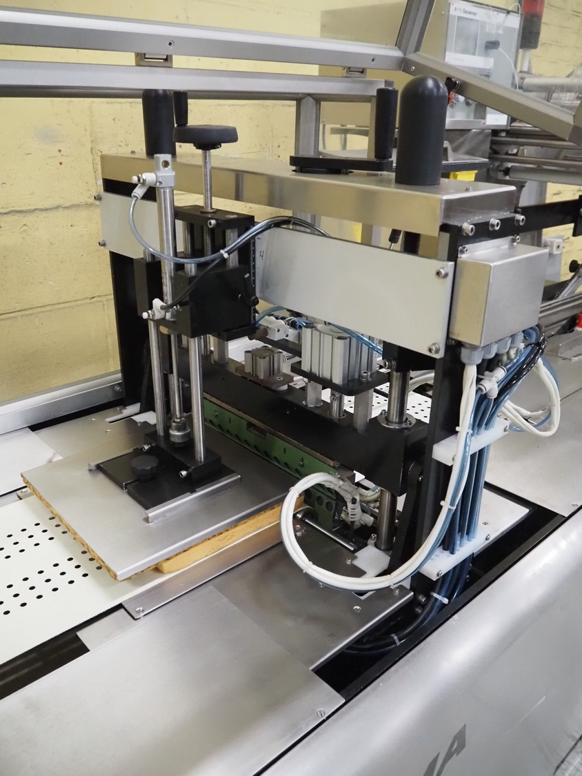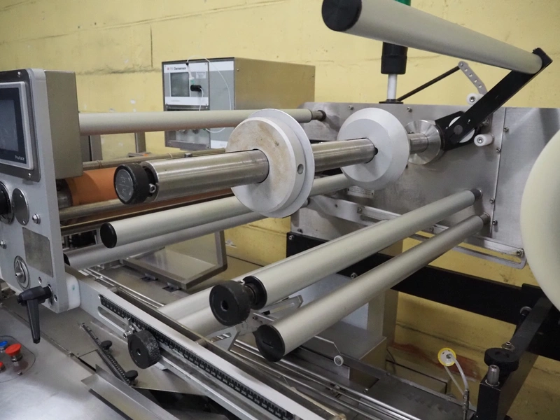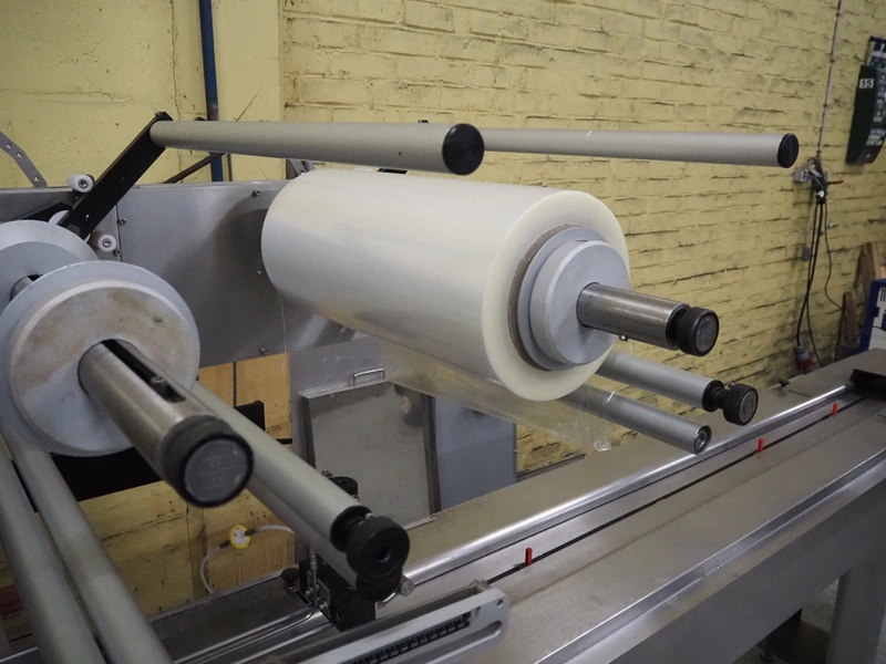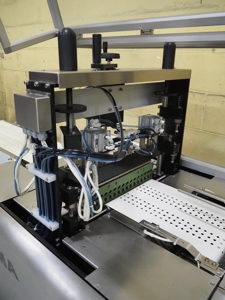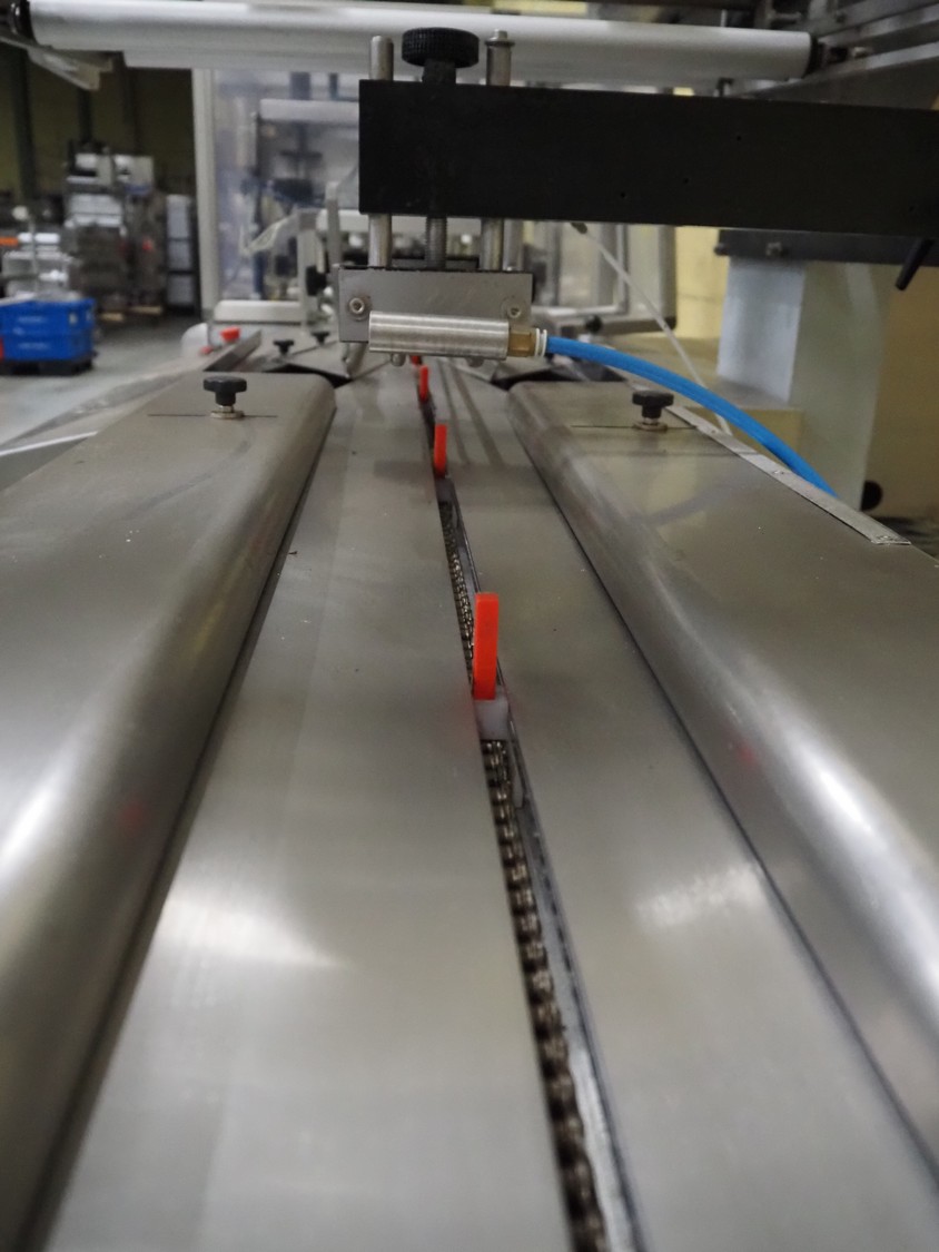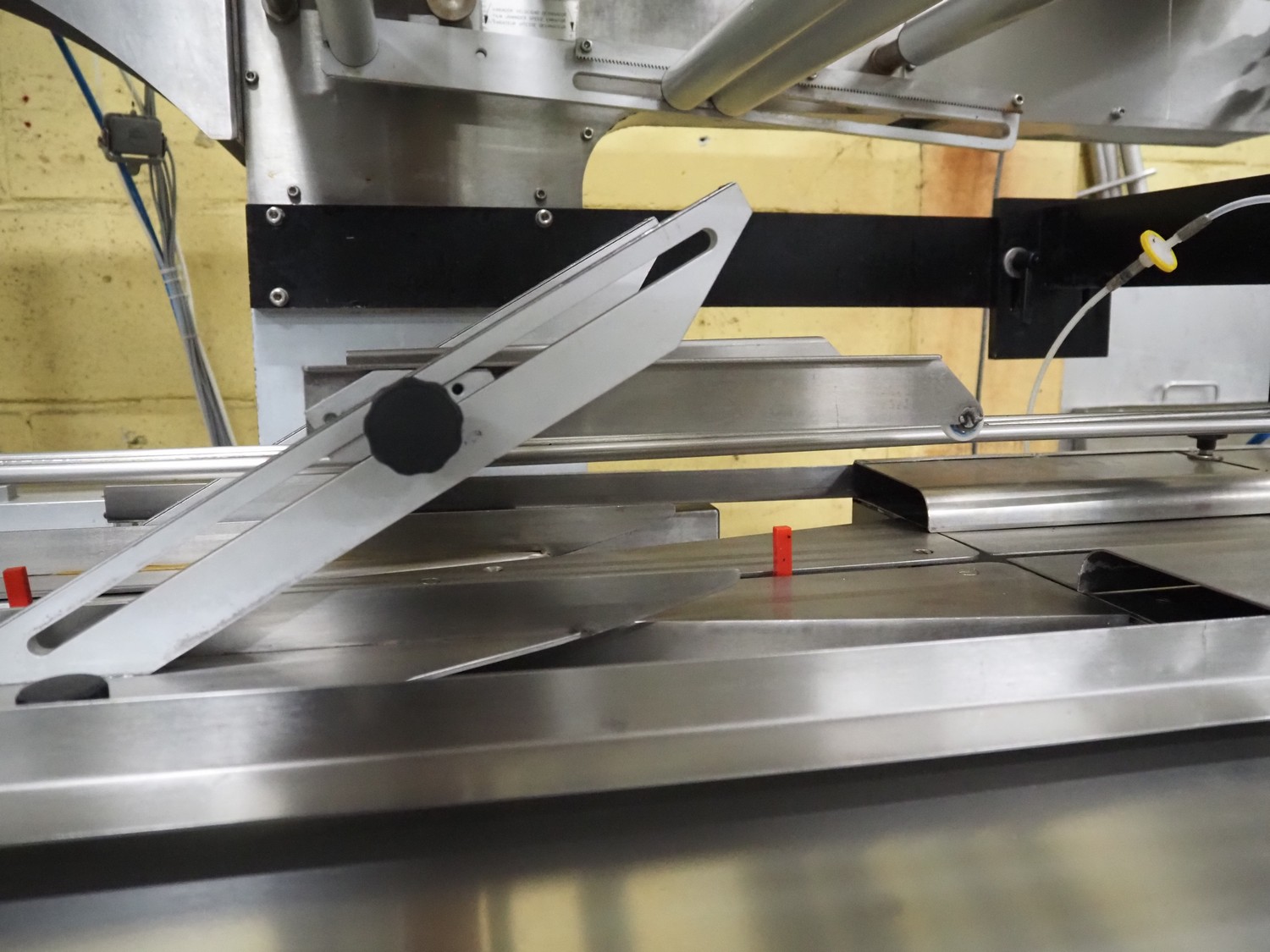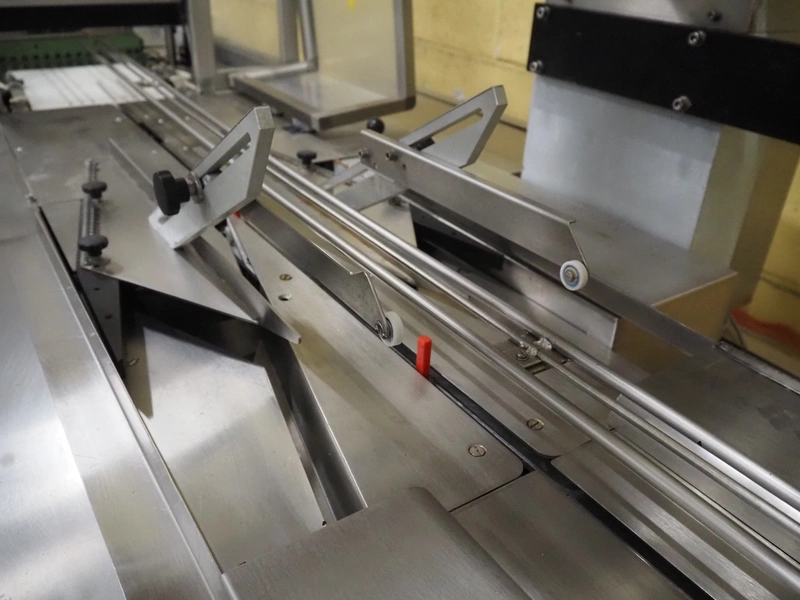 Ulma flowpacker, model: Alaska, machine number: 2504032, year of construction: 1999, 400 V, 50 Hz, infeed belt with dividers, distance between dividers: 400 mm, divider height: 30 mm, film width: 560 mm, plastic belt, belt width: 300 mm, seal width: 330 mm, with PBI Dansensor gas mixer, model: Module TGC-2 335, total dimensions: 5900 mm x 1250 mm x 1900 mm.