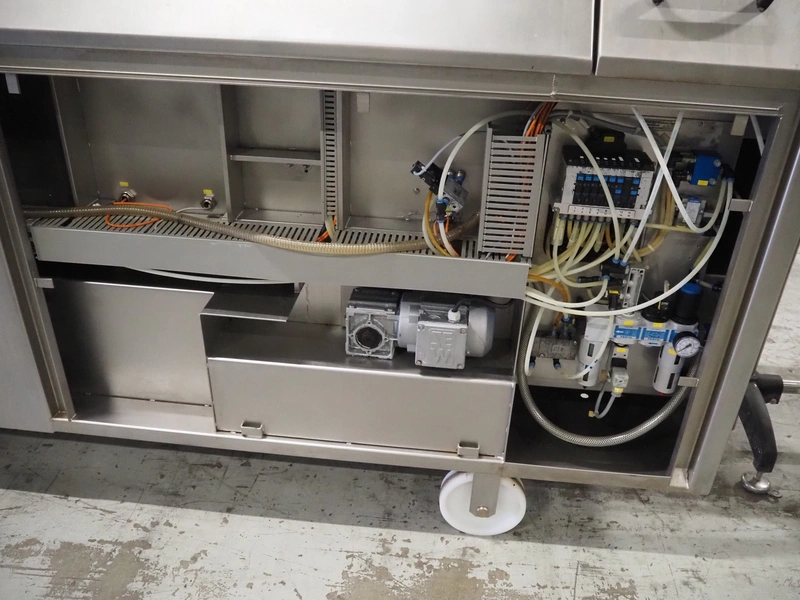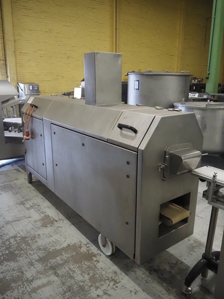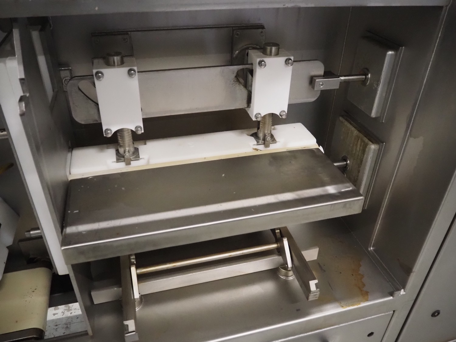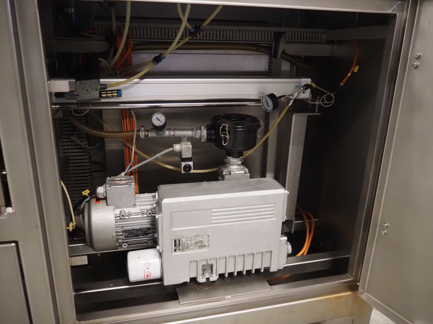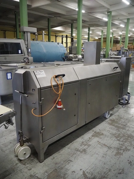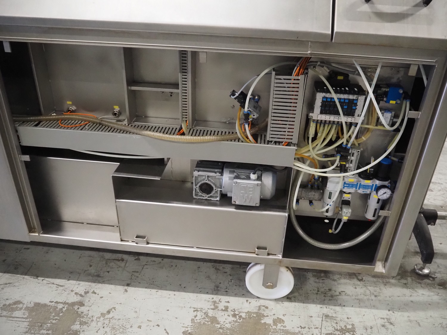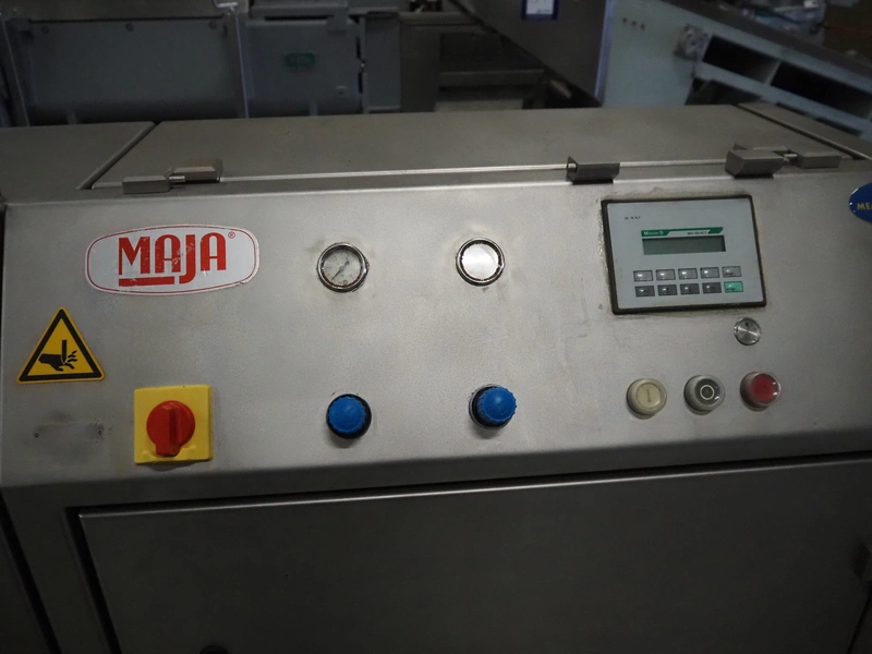 Maja Maschinenfabrik mobile portioning machine, type: FPS 40, number: 41514, year of construction: 1999, 400 V, 3 Ph, 50 Hz, 2.6 A, 1.0 kW, Busch vacuum pump, type: RC 0025 E 501, number: 04013900, year of construction: 2004, capacity: 25 m³ per hour, dimensions chamber: 550 mm x 160 mm x 100 mm, plastic belt, belt width: 200 mm, total dimensions: 2800 mm x 690 mm x 1800 mm.