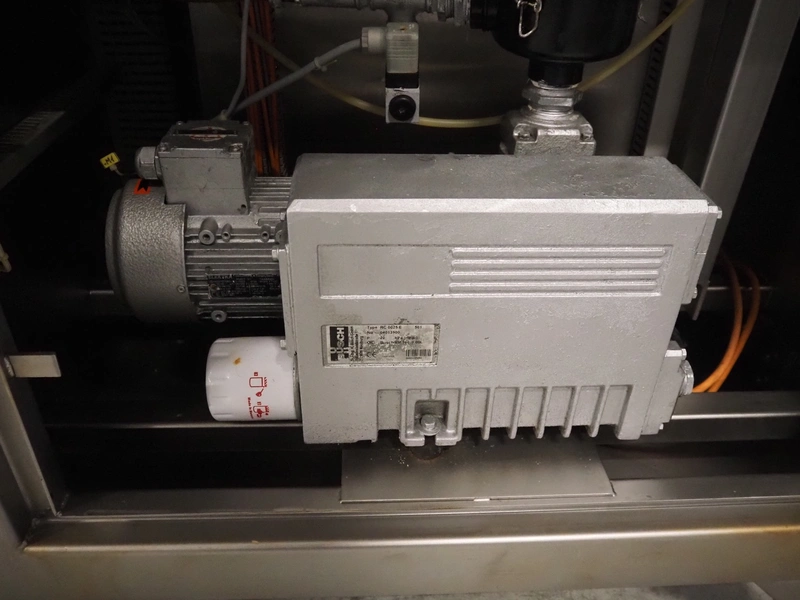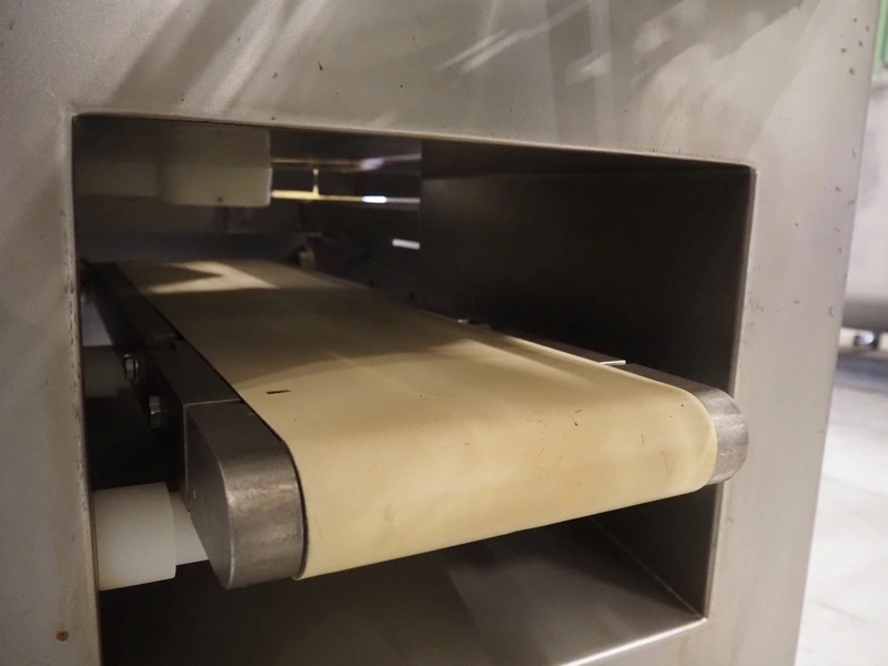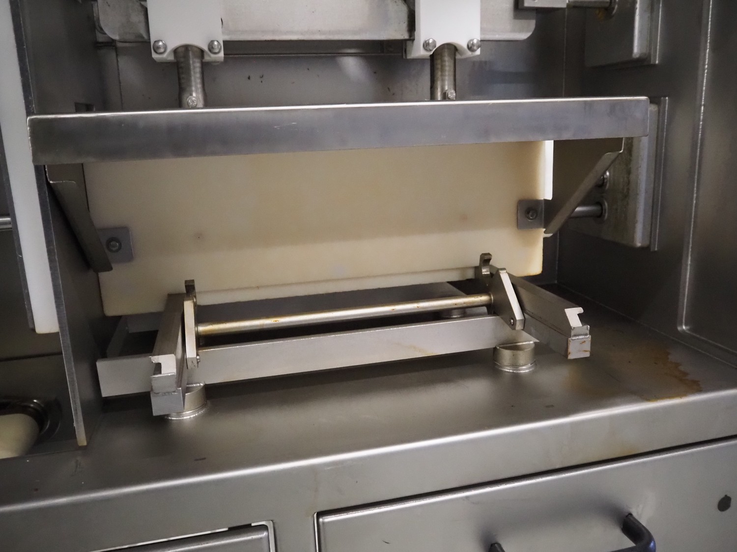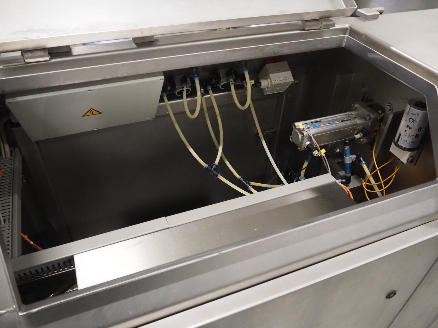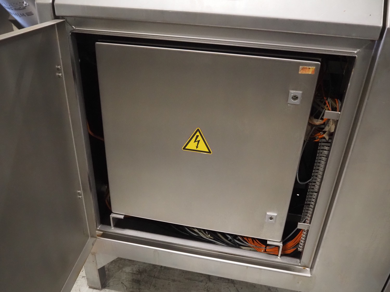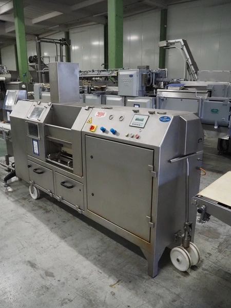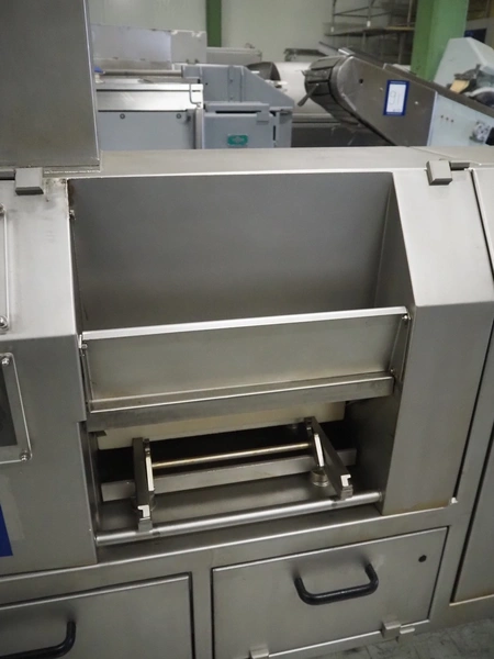 Maja Maschinenfabrik mobile portioning machine, type: FPS 40, number: 41514, year of construction: 1999, 400 V, 3 Ph, 50 Hz, 2.6 A, 1.0 kW, Busch vacuum pump, type: RC 0025 E 501, number: 04013900, year of construction: 2004, capacity: 25 m³ per hour, dimensions chamber: 550 mm x 160 mm x 100 mm, plastic belt, belt width: 200 mm, total dimensions: 2800 mm x 690 mm x 1800 mm.