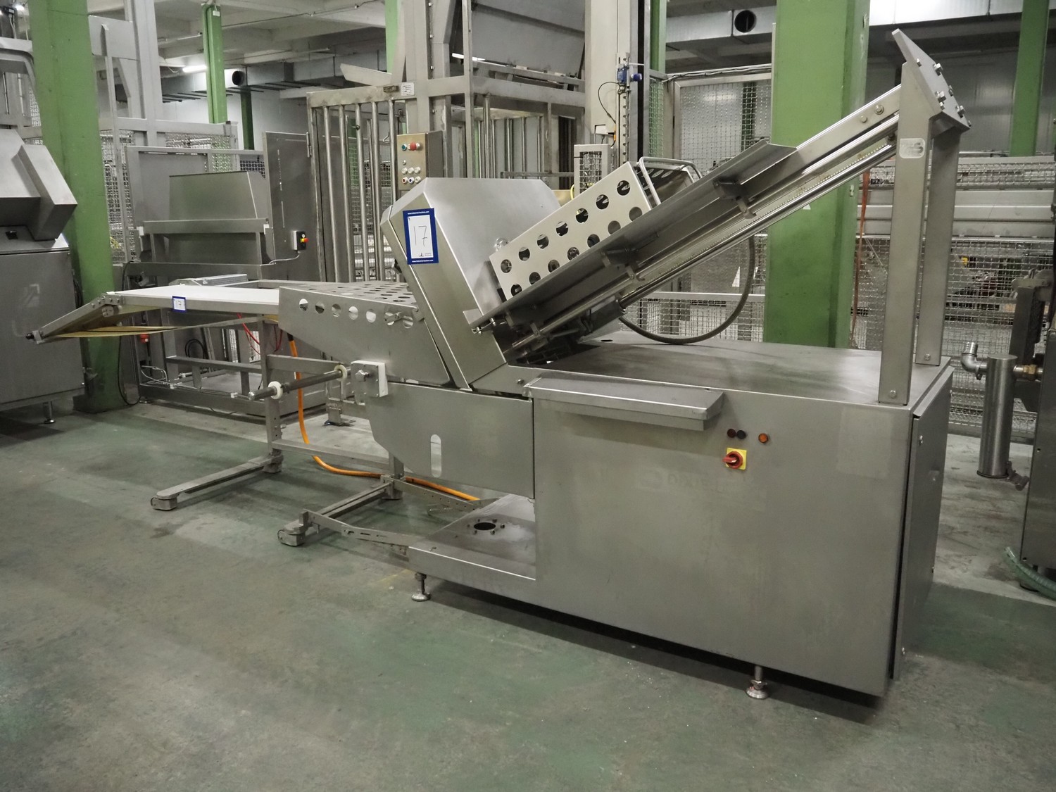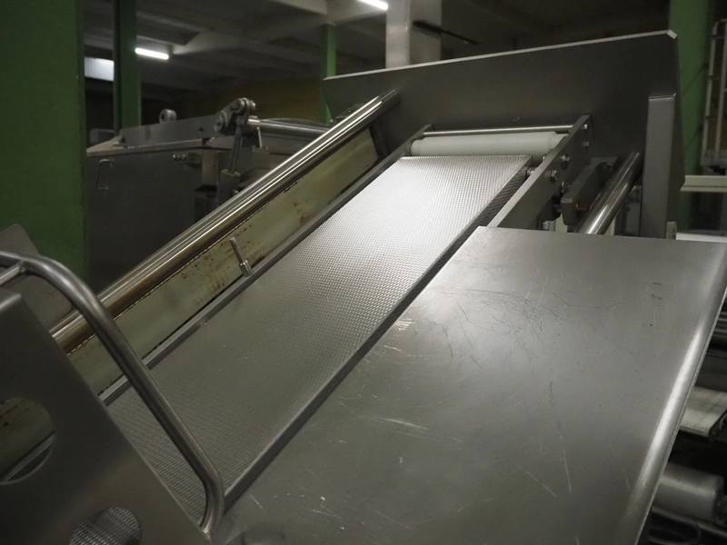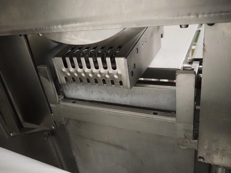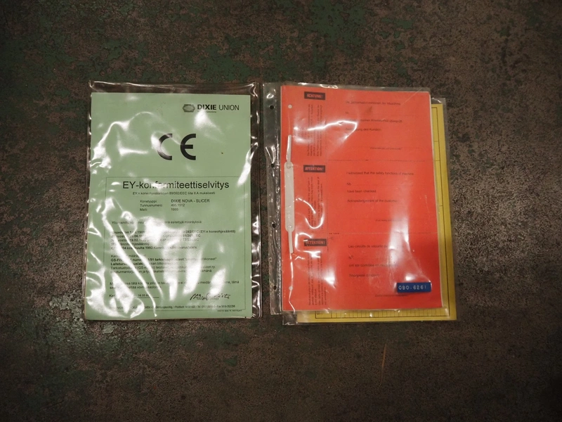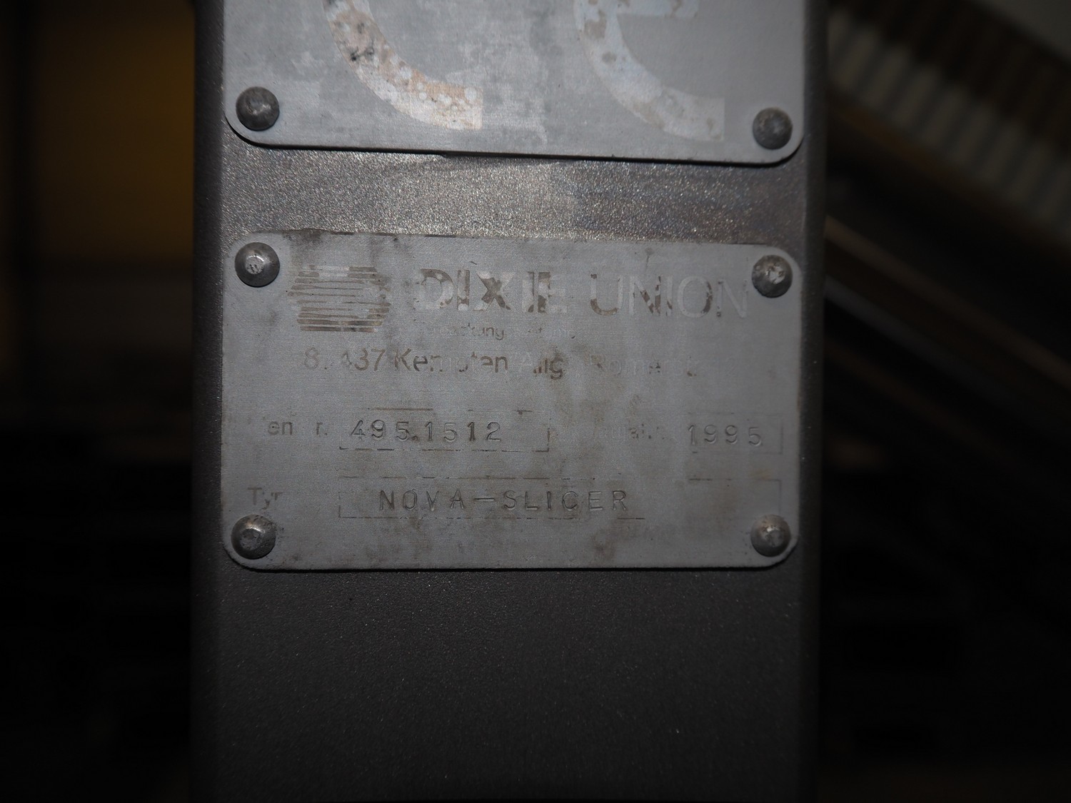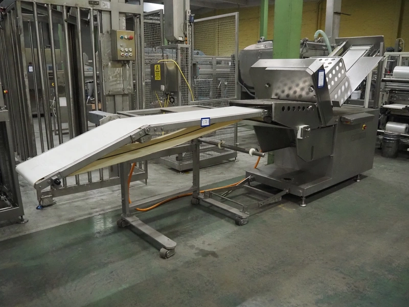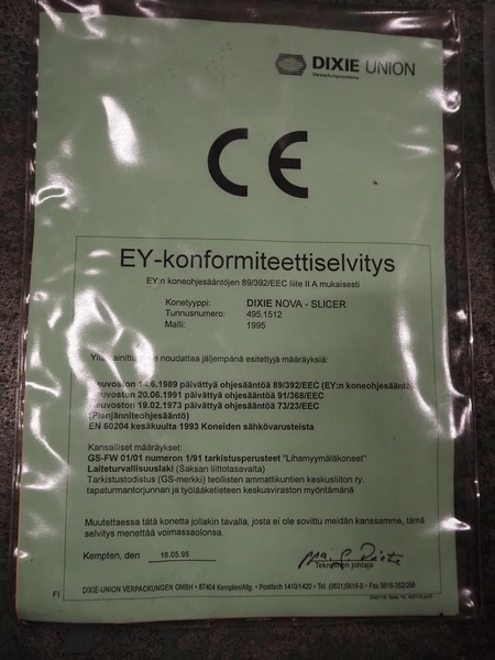 Dixie-Union Verpackungen GmbH slicer, type: Nova-Slicer, serial number: 495.1512, year of construction: 1995, with Dixie Union outfeed belt, type: ATB 797, plastic belt, belt width: 400 mm, total dimensions: 4650 mm x 1050 mm x 2000 mm. Incomplete, missing knife.